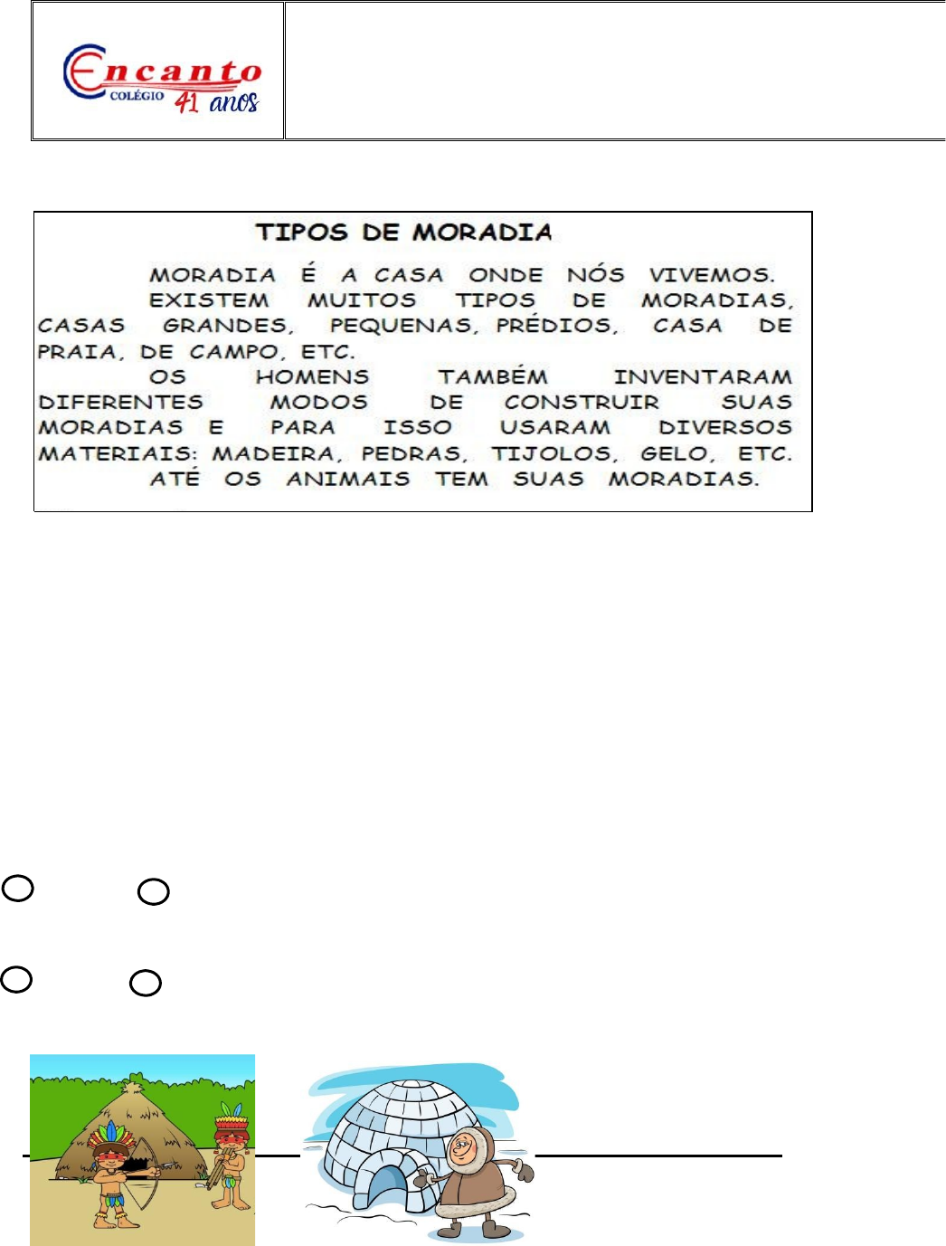 ATIVIDADE CONTINUADA AVALIATIVA DE 3º GEOGRAFIA - 1º BIMESTRE - PROFª. Sandra 2ºAN0_____ DATA:_____/_____/2025 ALUNO(A):_______________________________________________ Nº_____ Leia o texto. 1- Muitas moradias sâo feitas com materias retirados da natureza para construção. Marque a alternativa correta de quais são esses materiais. ( ) Pedras e madeira. ( ) Bexiga e nuvens ( ) Guardanapos e agulhas. 2- Marque a alternativa correta A) Para construir um iglu, o ambiente deve ser: Frio. Quente. B) Para construir casas de palafitas, o terreno deve ser: Seco. Alagado. 3- Observe as imagens e responda o que se pede. A) Escreva as diferenças em relação aos moradores. ________________________________________________________________________________________________________________________________________ B) Em relação ao local onde essas moradias foram construídas. ________________________________________________________________________________________________________________________________________ 4- Procure no caça-palavras alguns materias que usamos para construir moradias. 5- Observe bem o desenho que representa uma casa, escreva o nome de cada parte. 6- Observe as gravuras, pinte-as e escreva o nome de cada cômodo de uma casa. 7- Complete as frases com as palavras abaixo: 8- Pense um pouco na sua rua e responda as questões abaixo. a) Que elementos exiete na sua rua: b) Você brinca com seus colegas na sua rua? De quais brincadeiras ? 9- Em um bairro comercial a maioria das construção serve como ponto comercial. O que encontramos em um bairro comercial ? ________________________________________________________________________________________________________________________________________ 10- Marque com o X no que voce observa em seu bairro. image7.jpeg image8.jpeg image9.jpeg image10.png image11.png image1.jpeg image2.jpeg image3.jpeg image4.jpeg image5.jpeg image6.jpeg