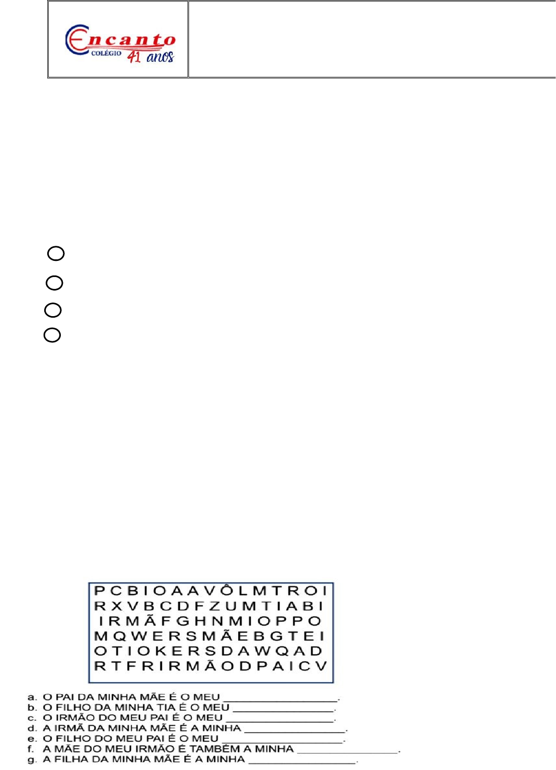 ATIVIDADE CONTINUADA AVALIATIVA DE HISTÓRIA - 3º BIMESTRE - PROFª. Sandra 2ºAN0_____ DATA:_____/_____/2025 ALUNO(A):_______________________________________________ Nº_____ Leia o texto. Grupos sociais são conjuntos de indivíduos que interagem regularmente, compartilham um senso de identidade e pertencimento, e possuem objetivos e interesses comuns. Esses grupos podem ser formais, como equipes de trabalho, ou informais, como grupos de amigos e família, e desempenham um papel fundamental na formação da identidade e no apoio emocional e prático dos seus membro 1- Escreva V (verdadeiro) ou F (falso). Todas as pessoas fazem parte de mais de um grupo social. Os grupos sociais não têm interesses em comum. As pessoas não fazem parte de grupos sociais. A família, a igreja, o clube, etc., são considerados grupos sociais. 2- Descubra a charada completando os espaços com vogais. a. Primeiro grupo social: F ____ M ____ L ___ _____ b. Grupo social religioso: ____ G R ___ J ___ c. Grupo social de estudo: __ S C ___ L _____ 3- Procure no diagrama abaixo as respostas para as perguntas abaixo. 4- Complete a cruzadinha com os membros da família. 5- Complete as frases com as palavras do quadro. vida – união – obrigação – fundamentais hábitos – amor a. Todos na família têm _________ com os deveres da casa. b. b. Para a _______ em família funcionar bem, todos devem colaborar. c. Todas as famílias têm_________. d. d. A__________ é essencial na família. e. O respeito e o ________ são _________em todas as famílias. 6- .Pinte as cenas que mostram como você ajuda em casa. 7- Sua família é importante para você? Por quê? 8- Circule a família de antigamente. 9- Pinte a família abaixo. 10- Faça um belo desenho da sua família image1.jpeg image2.jpeg image3.jpeg image4.jpeg image5.png image6.jpeg