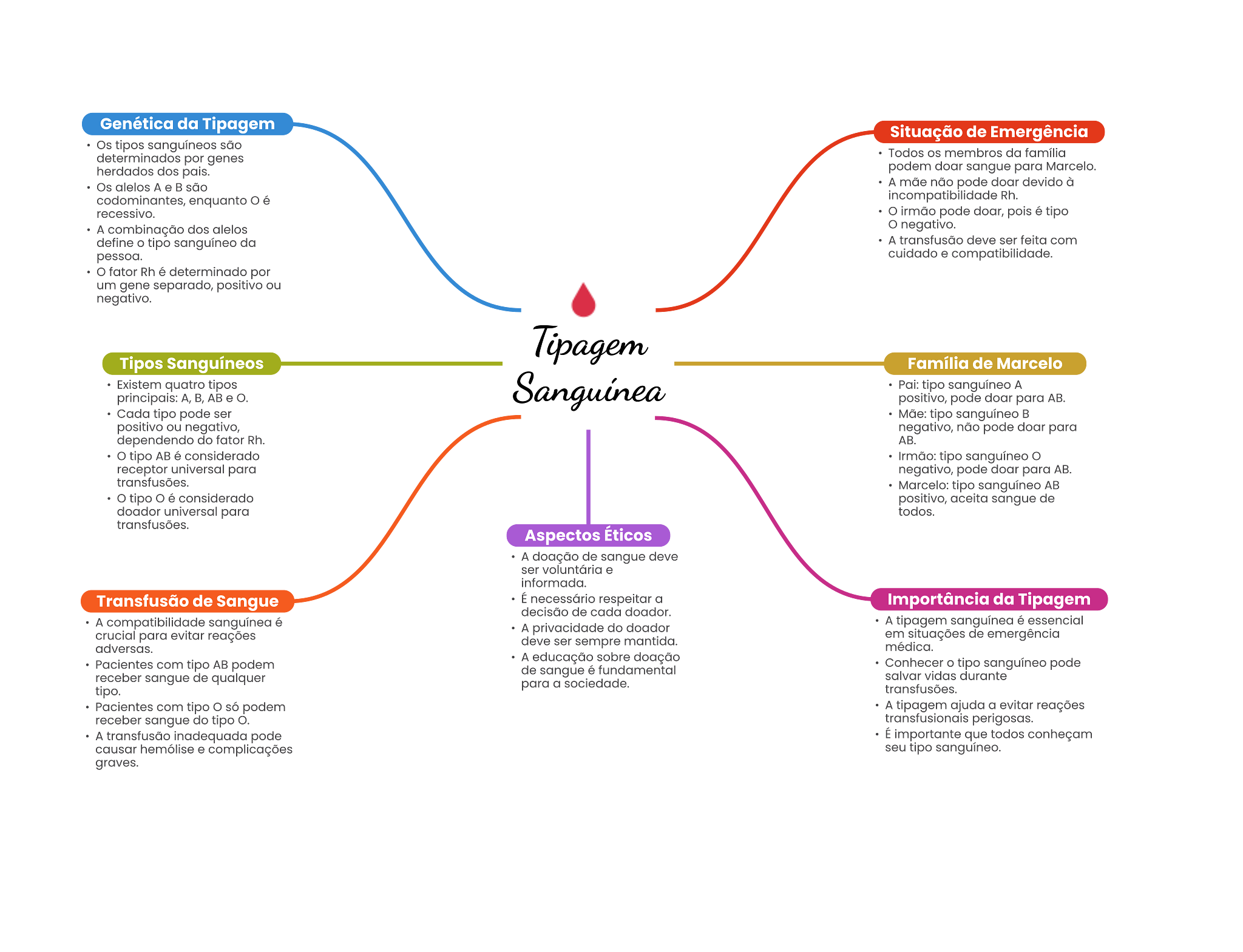 Genética da Tipagem Situação de Emergência tipos são determinados por genes Todos membros da herdados dos podem sangue para Marcelo. Os A A não pode devido enquanto Rh. recessivo. pode doar, é tipo A combinação dos alelos negativo. define tipo da A transfusão dave ser com pessoa. compatibilidade. fator Rh é determinado por um gene separado, positivo ou negativo. Tipos Sanguíneos Família de Marcelo quatro tipos tipo A principali: A, B, AB O. positivo, pode door para AB. Cada tipo pode tipo positivo ou negativo, negativo, não pode para dependendo do fator Rh. AB. tipo AB considerado Irmão: tipo receptor universal para negativo, pode doar para AB. transfusões. Marcelo: tipo sanguíneo AB tipo é considerado positivo, sangue de universal para todos. transfusões. Aspectos Éticos A doação de songue deve ser voluntária informada. Transfusão de Sangue É respeitar a Importância da Tipagem de cada doador. A A privacidade do doador A tipagem sesencial crucial para evitar reações deve ser sempre mantida. em de emergência adversas. médica. com tipo AB podem A educação sobre doação de sangue fundamental Conhecer tipo pode receber de qualquer salvar vidas durante tipo. para a sociedade. transfusões. Pacientes com tipo só podem A tipagem ajuda a evitar receber sangue do tipo O. transfusionale perigosas. A inadequada pode É importante que todos conheçam causar complicações seu tipo graves.