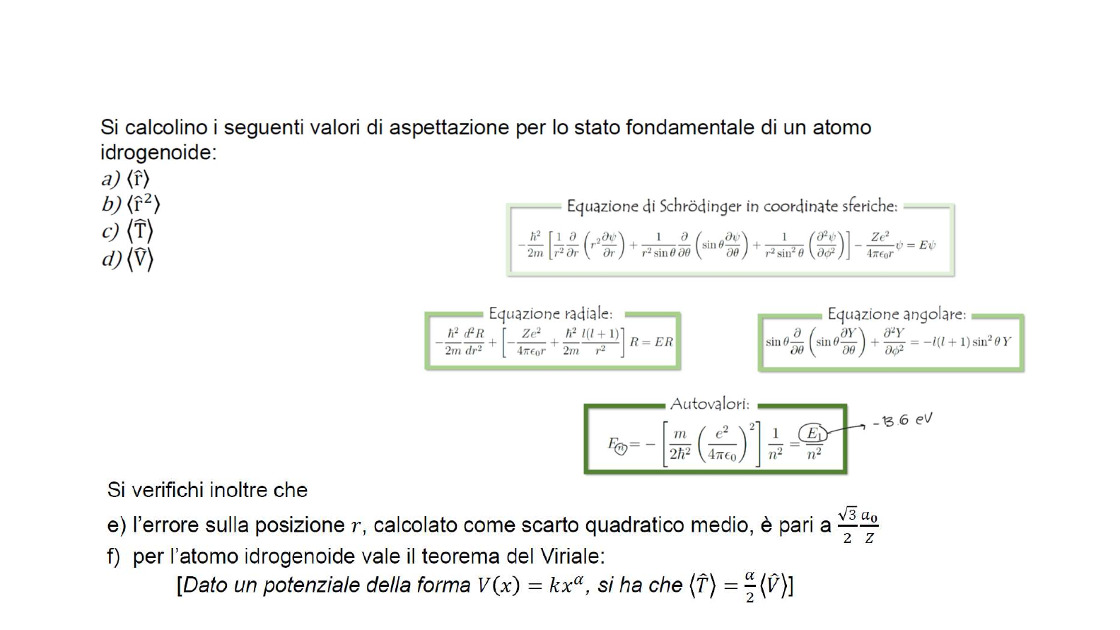 Qualche Esercizio: Atomi idrogenoidi Esercizio 1: Esercizio 2: Esercizio 3: Il trizio è un isotopo dell’idrogeno, il cui nucleo è costituito da due neutroni e un protone. È radioattivo e decade in un nucleo di 3He (due protoni, un neutrone) dopo 12 anni, in media. Il processo di decadimento emette un elettrone ad alta energia che riesce a sfuggire al potenziale coulombiano. Supponiamo che il processo sia istantaneo e che la funzione d’onda del trizio resti costante durante il processo stesso. a) Si indichi con Pnlm la probabilità che l’elettrone dell’ He+ si trovi nello stato nlm dopo il decadimento. Si calcoli P100 e P200. (prima del decadimento l’elettrone si trova nello stato fondamentale) b) Si indichi per quali valori di nlm si ottiene Pnlm diversa da zero c) Supponiamo per semplicità che l’elettrone decada nello stato |𝜓⟩ = 𝑐1|100⟩𝐻𝑒 + 𝑐2|200⟩𝐻𝑒 a t=0. Quanto vale 𝜓(𝑡) per t>0? d) Si calcoli r(t) per t>0 Formule utili: Funzioni radiali dell’atomo idrogenoide: 𝑅10 = 2 𝑍 𝑎0 3/2 𝑒−𝑍𝑟/𝑎0 𝑅20 = 2 𝑍 2𝑎0 3/2 1 − 𝑍𝑟 𝑎0 𝑒−𝑍𝑟/2𝑎0 Armoniche sferiche: 𝑌00 = 1 √4𝜋 Integrale notevole 𝑥𝑛 𝑒−𝑝𝑥 𝑑𝑥 = 𝑛! 𝑝𝑛 +1 +∞ 0 Esercizio 4: Un elettrone si muove in un campo coulombiano centrato all’origine delle coordinate. Trascurando effetti di spin e correzioni relativistiche, il primo stato eccitato (n=2) è 4 volte degenere. Si considerino gli effetti di un potenziale non centrale Vpert=f(r)xy, dove f(r) è una funzione centrale che tende a zero “rapidamente” per 𝑟 → +∞. Si tratti la perturbazione al primo ordine e si calcoli il numero finale di livelli e la relativa degenerazione (N.B. non è necessario risolvere esplicitamente l’integrazione della parte radiale). Funzioni d’onda radiali 𝑅10 = 2 𝑍 𝑎0 3/2 𝑒−𝑍𝑟/𝑎0 𝑅20 = 2 𝑍 2𝑎0 3/2 1 − 𝑍𝑟 𝑎0 𝑒−𝑍𝑟/2𝑎0 𝑅21 = 1 √3 𝑍 2𝑎0 3/2 𝑍𝑟 𝑎0 𝑒−𝑍𝑟/2𝑎0 Armoniche sferiche: 𝑌00 = 1 √4𝜋 𝑌1±1 = ∓ 3 8𝜋 1 2 𝑠𝑖𝑛𝜃 𝑒±𝑖𝜙 𝑌10 = 3 4𝜋 1/2 𝑐𝑜𝑠𝜃 Esercizio 5: Esercizio 6: