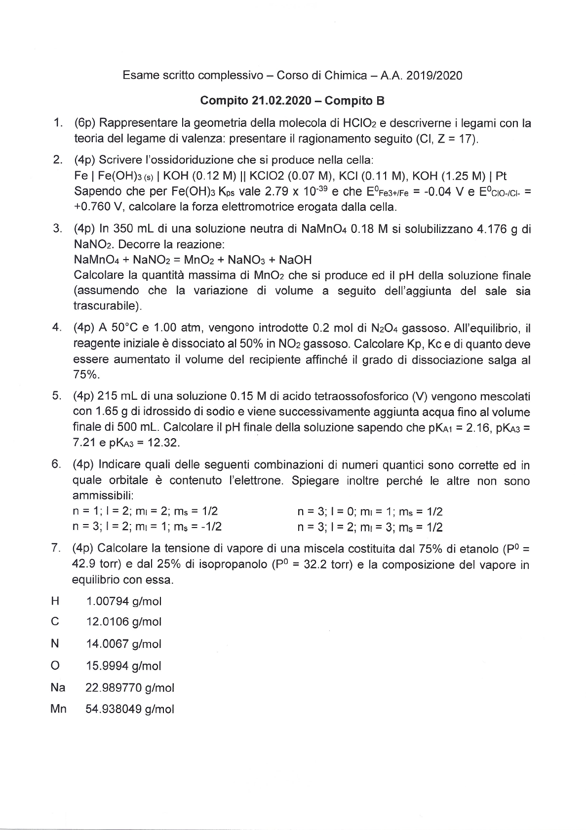 Esame scritto complessivo Corso di Chimica A.A. 2019/2020 Compito 21.02.2020 - Compito 1. (6p) Rappresentare la geometria della molecola di e descriverne i legami con la teoria del legame di valenza: presentare il ragionamento seguito (CI, Z = 17). 2. (4p) Scrivere l'ossidoriduzione che si produce nella cella: Fe (s) (0.12 M) KCIO2 (0.07 M), KCI (0.11 M), (1.25 M) Pt Sapendo che per Fe(OH)3 Kps vale 2.79 X e che = -0.04 V e = +0.760 V, calcolare la forza elettromotrice erogata dalla cella. 3. (4p) In 350 mL di una soluzione neutra di NaMnO4 0.18 M si solubilizzano 4.176 g di NaNO₂. Decorre la reazione: NaMnO4 + = + + NaOH Calcolare la quantità massima di che si produce ed il pH della soluzione finale (assumendo che la variazione di volume a seguito dell'aggiunta del sale sia trascurabile). 4. (4p) A 50°C e 1.00 atm, vengono introdotte 0.2 mol di N2O4 gassoso. All'equilibrio, il reagente iniziale è dissociato al 50% in gassoso. Calcolare Kc e di quanto deve essere aumentato il volume del recipiente affinché il grado di dissociazione salga al 75%. 5. (4p) 215 mL di una soluzione 0.15 M di acido tetraossofosforico (V) vengono mescolati con 1.65 g di idrossido di sodio e viene successivamente aggiunta acqua fino al volume finale di 500 mL. Calcolare il pH finale della soluzione sapendo che pKA1 = 2.16, = 7.21 e = 12.32. 6. (4p) Indicare quali delle seguenti combinazioni di numeri quantici sono corrette ed in quale orbitale è contenuto l'elettrone. Spiegare inoltre perché le altre non sono ammissibili: n = 1; = 2; 2; ms = 1/2 n 3; = = 1; ms = 1/2 n = 3; = 2; = 1; ms -1/2 n 3; = 2; 3; ms = 1/2 7. (4p) Calcolare la tensione di vapore di una miscela costituita dal 75% di etanolo = 42.9 torr) e dal 25% di isopropanolo = 32.2 torr) e la composizione del vapore in equilibrio con essa. H 1.00794 g/mol 12.0106 g/mol N 14.0067 g/mol 15.9994 g/mol Na 22.989770 g/mol Mn 54.938049 g/molCOMPTO SCRITTO 21.02.2020 2019/2020 COMPITO B Es. 1 Essendo H legato ad Oe molicole la ione a 2=17 3p 3d 4s 4p 4d di + = coppie 4 coppie Geometria AX2E2 piegata ibridizzato 3d a IT 6 4 0 a 0 1L Scheme 0 H Schellia J Scheme O-HEs. 2 + +3 +3 + a + 40H⁻ /x3 4Fe + + + (OH)3 + + 4Fe + 3 + 6KOH + 3ka + X= = M = + 3 + 90591 3 log = Ec= + 4 = +0,760 + 4 - Ec- EA If 1,496 V Es. 3 Na + + ++ +3 +4 1 + + + + +3 +5 NO3 + H2O 2 + + + +80H +2 Na + + H2O in 2MnO2 +3 0,0227 mol 0,0403 mol = = 0,350 = 0,063 mel = 4,176 0,0605 68,9953 = = 86,9368 = 3,503 g [OH] = = 6,0403 = = = 14- = 14-9939 = 13,061 0 (g) 2 in Allequilibrio, ie di N2O4 dissociate in all'equilibrio pressione totale sara sempre = = 0,667 91+92 = 0,333 Kp= 2 = 9333 = 1,336Kp 1,336 Kc= = 0,0503 = lu queste fase, il del + ) RT = = = 7,96L A 1 Per far grado si dovra far del recipientee ficarsi pressione totale. (g) in 0,1 mee 9025 = kx queste oliequilibrio: XNO2= MNOZ as 0,857 = 0,025 = = 0,143 Quindi la interna (totale) Kp 1,336 = 9260 Kx Ed del Recipiente deve RT V2= M = 17,86L = Quindi il volume del recipiente deve essere V2 = 17,86 = 2,24 VA 7,96Es. 5 (v) = = = = 32,25 mmd = = 39,9971 = 0,04125 = 41,25 H2O + (aq) + in 32,25 41,25 fin 32,25 H2 + 2- + the in 32,25 900 fin 9,00 = V = 23,25 90465M = MHP042- V = 9,00 = 90180M + H2O 2- + + (aq) in 0,0465 90180 0,0180 + eq 0,0465- trascurabile A2= 0,0180 pH = leg = 7,21 = 6,80 90465Es.6 M me 1 2 2 1/2 NON 3 2 1 -1/2 Orbitale 3d 3 0 1 1/2 NON 3 2 3 1/2 NON emmissibile: 0 Es. 7 = = 42,9.0,75 = 32,18 = = 8,05 PMIX = + = 32,18 + = 40,23 La della fase equilibrio can liquido : PELOH 32,18 PMIX = 40,23 = 0,800 = PMIX = 40,23 8,05 N 0,200