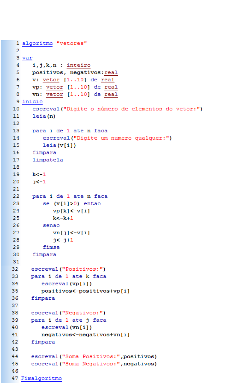 APOL 04 APOL 04 Questão 1/5 - Lógica de Programação e Algoritmos O algoritmo abaixo recebe números reais positivos e/ou negativos e armazena-os em um vetor. Posteriormente, armazena os valores positivos e os negativos em novos vetores separados e escreve os vetores na tela. APOL 04 APOL 04 Ao rodar o código acima, você percebe que existe um pequeno problema. Ao mostrar na tela os valores positivos e negativos em vetores separados, sempre um ZERO extra é colocado ao fim do vetor. Conforme a figura abaixo: Assinale a alternativa que contém a parte do código que melhor corrige este problema, eliminando os zeros desnecessários ao final do vetor. E APOL 04 APOL 04 Questão 2/5 - Lógica de Programação e Algoritmos O algoritmo abaixo rebece como entrada o número de linhas e o número de colunas de uma matriz e, baseado nestes valores, realizada um calculo matematico para determinando o valor de cada posição da matriz. Assinale a alternativa que contém o resultado de saída da matriz para m=3 e n=3. B 2 2 2 3 3 3 4 4 4 APOL 04 APOL 04 Questão 3/5 - Lógica de Programação e Algoritmos O algoritmo abaixo recebe uma dimensão de matriz como dado de entrada e retorna na tela as posições da matriz preenchidas de forma automática por um calculo matemático. Assinale a alternativa que contém a saída para uma MATRIZ 5x5. B 2 3 4 5 6 3 4 5 6 7 4 5 6 7 8 5 6 7 8 9 6 7 8 9 10 APOL 04 APOL 04 Questão 4/5 - Lógica de Programação e Algoritmos Na Aula 7 trabalhamos com o conceito de vetores. O pseudocódigo abaixo lê e escreve na tela um vetor de dimensão variável. Assinale a alternativa que contém o código correto deste mesmo vetor sendo impresso na ordem inversa (de trás para frente). A APOL 04 APOL 04 Questão 5/5 - Lógica de Programação e Algoritmos O algoritmo abaixo envolve o conceito de MATRIZES, visto da AULA 8. Matrizes são vetores bi-dimensionais, contendo linhas e colunas. O código realiza a leitura de uma MATRIZ 3x3 (3 linhas e 3 colunas), e encontra os elementos PARES da matriz, mostrando-os na tela e contando quantos existem. Assinale a alternativa que contém o código mais adequado para, ao invés de encontrar os pares, encontre os números ímpares da matriz? D APOL 04 APOL 04 APOL 04 APOL 04 APOL 04 APOL 04 APOL 04 APOL 04