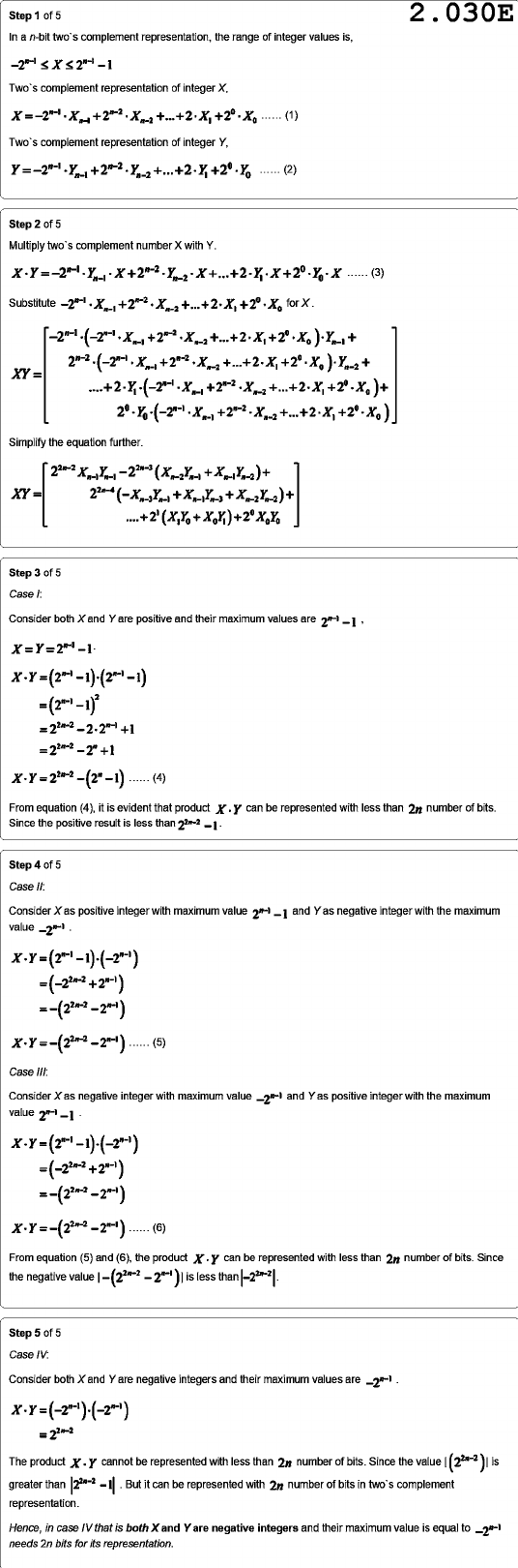 Step of 5 2.030E In a n-bit two's complement representation, the range of integer values is, Two's complement representation of integer X, (1) Two's complement representation of integer Y, (2) Step 2 of 5 Multiply two's complement number X with Y. (3) Substitute for X. = Simplify the equation further. Step of 5 Case Consider both X and Y are positive and their maximum values are (4) From equation (4), it is evident that product can be represented with less than 2n number of bits. Since the positive result is less than Step of 5 Case II: Consider X as positive integer with maximum value and Y as negative integer with the maximum value (5) Case III: Consider X as negative integer with maximum value and Yas positive integer with the maximum value (6) From equation (5) and (6), the product can be represented with less than 2n number of bits. Since the negative value is less than Step of 5 Case IV: Consider both X and Y are negative integers and their maximum values are The product X-Y cannot be represented with less than 2n number of bits. Since the value is greater than But it can be represented with 2n number of bits in two's complement representation. Hence, in case IV that is both X and Y are negative integers and their maximum value is equal to needs 2n bits for its representation.