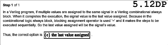 Step 1 of 1 5.12DP In a Verilog program, if multiple values are assigned to the same signal in a Verilog combinational always block. When it completes the execution, the signal value is the last value assigned. Because in the combinational logic always block, blocking assignment operator is used '=' and it makes the steps to be executed sequentially. So the last value assigned will be the signal's value. Thus, the correct option is (c) the last value assigned