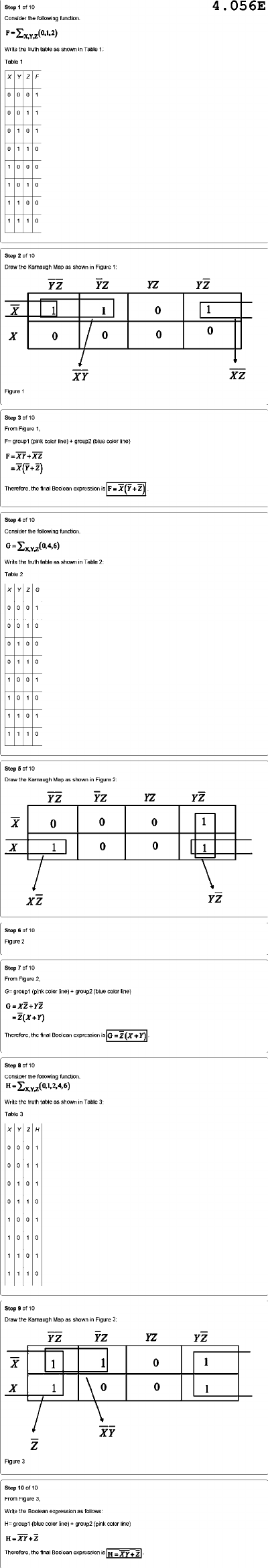 Step 10 4.056E Consider the following function Wr the truth table as shown in Table 1: Table XYZF 0001 001 1 0 0 1 0110 1000 0 1 0 0 1110 Step 10 Draw the Karnaugh Map as shown Figure 1: YZ YZ YZ YZ X 1 1 0 1 / 0 0 0 X 0 XY XZ Figure 1 Step 3 of 10 From Figure F= group1 (pink color line) group2 (blue color line) F=XY+XZ Therefore, the final Boolean expression F=X(Y+Z) Step 10 Consider the following function. the truth table shown Table 2: Table XYZG 0001 0 0 0 0100 0110 1001 1010 1 1 1110 Step 10 Draw the Karnaugh Map as shown 2 YZ YZ YZ YZ X 0 0 0 1 X 1 0 0 1 XZ YZ Step 10 Figure 2 Step 10 From G= group1 (pink color group2 (blue color line) G=XZ+YZ Therefore, the final Boolean expression G=Z(X+Y) Step 10 Consider the following H= Write the truth table as shown in Table 3: XYZH 0 0 0011 0101 0110 1001 1 0 0 1101 1110 Step 10 Draw the Karnaugh Map as Figure YZ YZ YZ YZ X 1 1 0 1 X 1 \ 0 0 1 XY Z Figure Step 10 From Figure 3, Write the Boolean expression as H= group1 (blue color group2 (pink color line) H=XY+Z Therefore, the final Boolean expression H=XY+Z