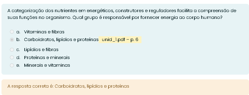 A categorização dos nutrientes em energéticos, construtores e reguladores facilita a compreensão de suas funções no organismo. Qual grupo é responsável por fornecer energia ao corpo humano? a. Vitaminas e fibras b. Carboidratos, lipídios e proteínas - p.6 C. Lipídios e fibras d. Proteínas e minerais e. Minerais e vitaminas A resposta correta é: Carboidratos, lipídios e proteínas