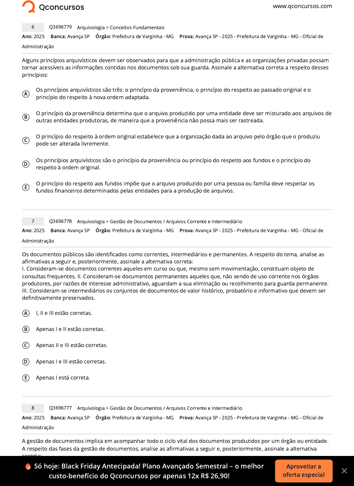 www.qconcursos.com Ano: 2025 Banca: Avança SP Órgão: Prefeitura de Varginha - MG Alguns princípios arquivísticos devem ser observados para que a administração pública e as organizações privadas possam tornar acessíveis as informações contidas nos documentos sob sua guarda. Assinale a alternativa correta a respeito desses princípios: A Os princípios arquivísticos são três: o princípio da proveniência, o princípio do respeito ao passado original e o princípio do respeito à nova ordem adaptada. B O princípio da proveniência determina que o arquivo produzido por uma entidade deve ser misturado aos arquivos de outras entidades produtoras, de maneira que a proveniência não possa mais ser rastreada. C O princípio do respeito à ordem original estabelece que a organização dada ao arquivo pelo órgão que o produziu pode ser alterada livremente. D Os princípios arquivísticos são o princípio da proveniência ou princípio do respeito aos fundos e o princípio do respeito à ordem original. E O princípio do respeito aos fundos impõe que o arquivo produzido por uma pessoa ou família deve respeitar os fundos financeiros determinados pelas entidades para a produção de arquivos. Ano: 2025 Banca: Avança SP Órgão: Prefeitura de Varginha - MG Os documentos públicos são identificados como correntes, intermediários e permanentes. A respeito do tema, analise as afirmativas a seguir e, posteriormente, assinale a alternativa correta: I. Consideram-se documentos correntes aqueles em curso ou que, mesmo sem movimentação, constituam objeto de consultas frequentes. II. Consideram-se documentos permanentes aqueles que, não sendo de uso corrente nos órgãos produtores, por razões de interesse administrativo, aguardam a sua eliminação ou recolhimento para guarda permanente. III. Consideram-se intermediários os conjuntos de documentos de valor histórico, probatório e informativo que devem ser definitivamente preservados. A I, II e III estão corretas. B Apenas I e II estão corretas. C Apenas II e III estão corretas. D Apenas I e III estão corretas. E Apenas I está correta. Ano: 2025 Banca: Avança SP Órgão: Prefeitura de Varginha - MG A gestão de documentos implica em acompanhar todo o ciclo vital dos documentos produzidos por um órgão ou entidade. A respeito das fases da gestão de documentos, analise as afirmativas a seguir e, posteriormente, assinale a alternativa correta: I. Primeira fase – dispersão: esta fase implica em decidir quais documentos e por quanto tempo devem ser mantidos. II. Segunda fase – utilização: esta fase diz respeito ao fluxo percorrido pelos documentos para o cumprimento de sua função 6 Q3696779 >Arquivologia Conceitos Fundamentais Prova: Avança SP - 2025 - Prefeitura de Varginha - MG - Oficial de Administração 7 Q3696778 >Arquivologia Gestão de Documentos / Arquivos Corrente e Intermediário Prova: Avança SP - 2025 - Prefeitura de Varginha - MG - Oficial de Administração 8 Q3696777 >Arquivologia Gestão de Documentos / Arquivos Corrente e Intermediário Prova: Avança SP - 2025 - Prefeitura de Varginha - MG - Oficial de Administração 🔥 Só hoje: Black Friday Antecipada! Plano Avançado Semestral – o melhor custo-benefício do Qconcursos por apenas 12x R$ 26,90! Aproveitar a oferta especial https://www.qconcursos.com/ https://www.qconcursos.com/questoes-de-concursos/bancas/avanca-sp https://www.qconcursos.com/questoes-de-concursos/institutos/prefeitura-de-varginha-mg https://www.qconcursos.com/questoes-de-concursos/bancas/avanca-sp https://www.qconcursos.com/questoes-de-concursos/institutos/prefeitura-de-varginha-mg https://www.qconcursos.com/questoes-de-concursos/bancas/avanca-sp https://www.qconcursos.com/questoes-de-concursos/institutos/prefeitura-de-varginha-mg https://www.qconcursos.com/questoes-de-concursos/questoes/045fc2f4-b5 https://www.qconcursos.com/questoes-de-concursos/disciplinas/arquivologia-arquivologia https://www.qconcursos.com/questoes-de-concursos/disciplinas/arquivologia-arquivologia/conceitos-fundamentais https://www.qconcursos.com/questoes-de-concursos/provas/avanca-sp-2025-prefeitura-de-varginha-mg-oficial-de-administracao https://www.qconcursos.com/questoes-de-concursos/provas/avanca-sp-2025-prefeitura-de-varginha-mg-oficial-de-administracao https://www.qconcursos.com/questoes-de-concursos/questoes/045ce129-b5 https://www.qconcursos.com/questoes-de-concursos/disciplinas/arquivologia-arquivologia https://www.qconcursos.com/questoes-de-concursos/disciplinas/arquivologia-arquivologia/gestao-de-documentos-arquivos-corrente-e-intermediario https://www.qconcursos.com/questoes-de-concursos/provas/avanca-sp-2025-prefeitura-de-varginha-mg-oficial-de-administracao https://www.qconcursos.com/questoes-de-concursos/provas/avanca-sp-2025-prefeitura-de-varginha-mg-oficial-de-administracao https://www.qconcursos.com/questoes-de-concursos/questoes/045a4254-b5 https://www.qconcursos.com/questoes-de-concursos/disciplinas/arquivologia-arquivologia https://www.qconcursos.com/questoes-de-concursos/disciplinas/arquivologia-arquivologia/gestao-de-documentos-arquivos-corrente-e-intermediario https://www.qconcursos.com/questoes-de-concursos/provas/avanca-sp-2025-prefeitura-de-varginha-mg-oficial-de-administracao https://www.qconcursos.com/questoes-de-concursos/provas/avanca-sp-2025-prefeitura-de-varginha-mg-oficial-de-administracao administrativa, assim como de sua guarda, após cessar o trâmite. III. Terceira fase – extinção: esta fase corresponde à produção dos documentos em razão da execução das atividades de um órgão ou entidade. A I, II e III estão corretas. B Apenas I está correta. C Apenas II está correta. D Apenas I e II estão corretas. E Apenas II e III estão corretas. Ano: 2025 Banca: CPCON Órgão: Prefeitura de São Francisco - PB Durante a prática de exercícios físicos, é comum observar queda progressiva no desempenho, associada a alterações metabólicas e neuromusculares