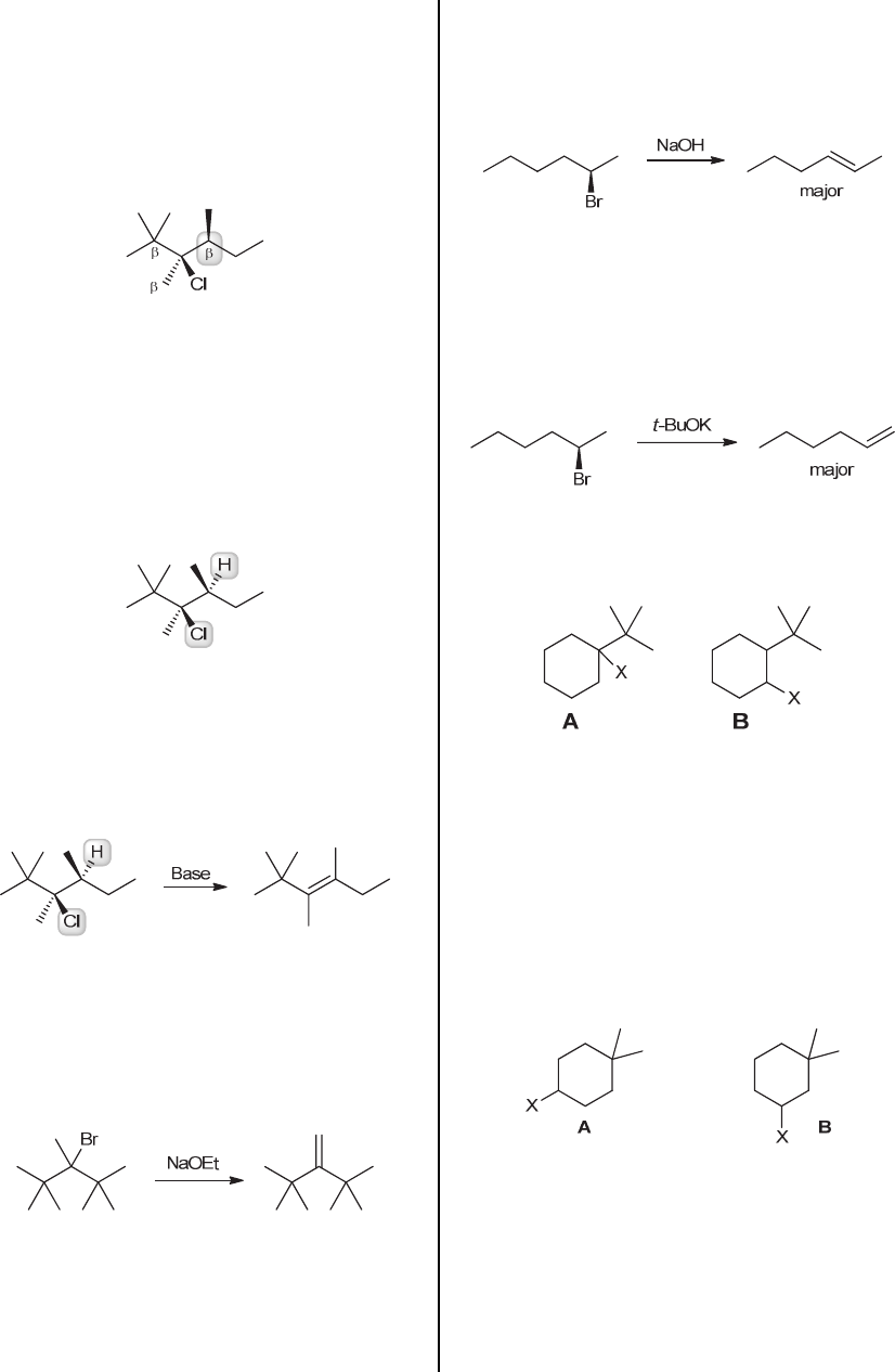 CHAPTER 7 213 (b) The problem statement indicates that the major product is obtained via an E2 process. There are three positions, but only two of them bear protons, so there are two possible regiochemical outcomes. Since the base is not sterically hindered, we expect the Zaitzev product (more substituted alkene). Formation of the Zaitzev product requires deprotonation at the following, highlighted position: This position bears only one proton, so the reaction is expected to be stereospecific. That is, only one particular stereoisomeric product will be obtained. To determine which product to expect, we can rotate the central C–C bond so as to place the proton and the leaving group in the plane of the page. But in this case, that is not necessary, because the proton and the leaving group are already anti-periplanar to one another (one is on a dash and the other is on a wedge): In such a case, it is relatively easy to draw the product, because the carbon skeleton is simply redrawn without the proton and without the leaving group (with a double instead). Note that a double bond has planar geometry, so the methyl groups are drawn on straight lines in the product: 7.63. The reagent is a strong nucleophile and a strong base, so we expect a bimolecular reaction. The substrate is tertiary so only E2 can operate (SN2 is too sterically hindered to occur). There is only one possible regiochemical outcome for the E2 process, because the other positions lack protons. 7.64. (a) The reagent is hydroxide, which is both a strong nucleophile and a strong base. The substrate is secondary, so we expect the E2 pathway to predominate. There are two positions that bear protons, so there are two possible regiochemical outcomes for an E2 process. The base is not sterically hindered, so the major product will be the more-substituted alkene. Two stereoisomers are possible (cis and trans), and the trans isomer is favored: (b) The reagent is tert-butoxide, which is a strong, sterically hindered base. The substrate is secondary so we expect E2 processes to predominate (SN2 is highly disfavored because of steric interactions). There are two positions that bear protons, so there are two possible regiochemical outcomes. The base is sterically hindered, so the major product will be the less-substituted alkene: 7.65. (a) Given the location of the bond, we consider the following two possible alkyl halides as potential starting materials. Compound A has three positions, but only two of them bear protons, and those two positions are identical. Deprotonation at either location will result in the desired alkene. In contrast, compound B has two different positions that bear protons. Therefore, if compound B undergoes an E2 elimination, there will be two possible regiochemical outcomes, so more than one alkene will be formed. (b) Given the location of the bond, we consider the following two possible alkyl halides as potential starting materials. Compound A has two positions, and those two positions are identical. Deprotonation at either location will result in the desired alkene. In contrast, compound B has two different positions that bear protons. Therefore, if compound B undergoes an E2 elimination, there will be two possible regiochemical outcomes, so more than one alkene will be formed. www.MyEbookNiche.eCrater.com