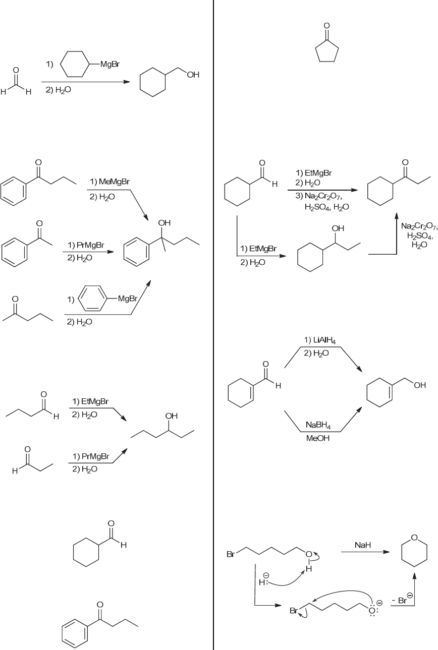 CHAPTER 12 419 12.35. (a) The desired product has only one group connected to the  position. That group could have been installed via a Grignard reaction with formaldehyde, as shown. (b) The desired product has three groups connected to the  position. Any one of these groups could have been installed via a Grignard reaction with the appropriate ketone, as shown. (c) The desired product has only two groups connected to the  position. Either one of these groups could have been installed via a Grignard reaction with the appropriate aldehyde, as shown. 12.36. (a) Reduction of the following aldehyde will afford the desired product. (b) Reduction of the following ketone will afford the desired product. (c) Reduction of the following ketone will afford the desired product. 12.37. (a) The product has more carbon atoms than the starting material, so we must form a carbon-carbon bond. This can be achieved with a Grignard reaction (using ethyl magnesium bromide to install an ethyl group). The resulting alcohol can then be oxidized to give the desired product. (b) Reduction of the aldehyde can be achieved with either LiAlH4 or NaBH4. This transformation cannot be achieved via catalytic hydrogenation, as that process would also reduce the carbon-carbon  bond. 12.38. Hydride functions as a base and removes a proton from the alcohol, giving an alkoxide ion. This intermediate has both a nucleophilic region (the negatively charged oxygen atom) and an electrophilic region (the position that is  to the bromine atom). As such, an intramolecular, SN2-type process can occur, giving a cyclic product. www.MyEbookNiche.eCrater.com