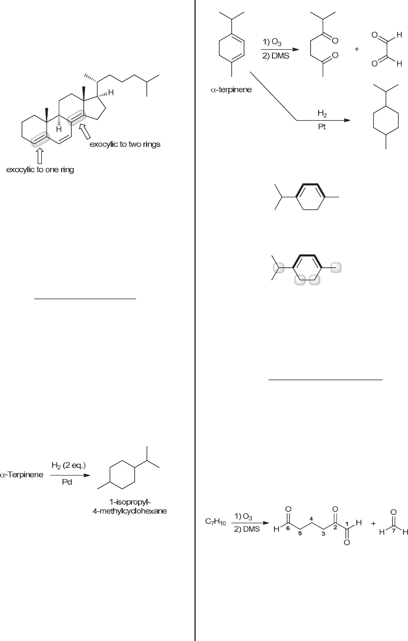 CHAPTER 16 593 Next, look for exocyclic double bonds. In this case, two double bonds (highlighted below) are exocyclic. One of the double bonds is exocyclic to two rings giving a total of three exocyclic relationships that each add +5 for a total of +15. Finally, look for a homoannular diene. There appears to be no ring that has two double bonds contained wholly within it, so no adjustment is required for this compound. In summary, the following calculation predicts a max of approximately 287 nm: Base = 217 Additional double bond (1) = +30 Auxochromic alkyl groups (5) = +25 Exocyclic double bonds (3) = +15 Homoannular diene (0) = 0 Total = 287 nm This prediction is in fairly good agreement with the experimentally observed value of 283 nm. 16.60. (a) α-Terpinene reacts with two equivalents of molecular hydrogen, so it must have two bonds. These bonds must be associated with two C=C double bonds (rather than being associated with a C≡C triple bond), because the carbon skeleton (which does not change during hydrogenation) cannot support a triple bond: A triple bond could not have been in the ring, because a six-membered ring cannot support the linear geometry required by the sp hybridized carbon atoms of a triple bond. The other C-C bonds (outside the ring) can also not support a triple bond (without violating the octet rule by giving a carbon atom with five bonds). Therefore, α- terpinene must have two double bonds. (b) The ozonolysis products indicate how the molecule must have been constructed, because ozonolysis breaks C=C bonds into C=O bonds: (c) This conjugated system is a homoannular diene: In addition, there are four auxochromic alkyl groups, highlighted here: The calculation for max is shown here: Base = 217 Additional double bonds = 0 Auxochromic alkyl groups = +20 Exocyclic double bonds = 0 Homoannular diene = +39 Total = 276 nm 16.61. The molecular formula (C7H10) indicates three degrees of unsaturation (see Section 14.16). The problem statement indicates that compound A will react with two equivalents of molecular hydrogen (H2). Therefore, we can conclude that compound A has two bonds, which accounts for two of the three degrees of unsaturation. The remaining degree of unsaturation must be a ring. Ozonolysis yields two products, which together account for all seven carbon atoms: Focus on the product with three carbonyl groups. Two of them must have been connected to each other in compound A (as a C=C bond), and the third carbonyl group must have been connected to the carbon atom of formaldehyde (CH2O). This gives two possibilities: Either C1 was connected to C6 (and C2 was connected to C7): www.MyEbookNiche.eCrater.com