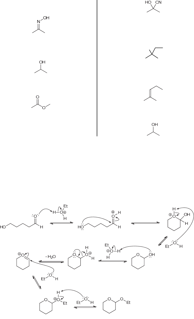 CHAPTER 19 739 (f) A ketone is converted into an oxime upon treatment with hydroxylamine in acid catalyzed conditions (with removal of water). (g) A ketone is reduced to a secondary alcohol upon treatment with a reducing agent such as NaBH4 (methanol serves as a proton source during the reaction). (h) A ketone is converted into an ester upon treatment with a peroxyacid. This process is called a Baeyer- Villiger oxidation. (i) A ketone is converted into a cyanohydrin upon treatment with HCN and KCN. (j) Ethyl magnesium bromide is a Grignard reagent (a very strong nucleophile) and it will attack a ketone to give a tertiary alcohol (with installation of the ethyl group at theposition to the OH group): HO (k) A ketone is converted into an alkene when treated with a Wittig reagent. This particular Wittig reagent installs three carbon atoms, to give the following product: (l) A ketone is reduced to a secondary alcohol upon treatment with LiAlH4 followed by water work-up. 19.55. Under acid-catalyzed conditions, the carbonyl group can be protonated, rendering it more electrophilic, and subject to attack by a nucleophile. There are two options for the attacking nucleophile in the second step of the mechanism: 1) the protonated carbonyl group is tethered to an OH group that can function as a nucleophile and attack the protonated carbonyl group in an intramolecular fashion, or 2) the reagent (ethanol) can serve as a nucleophile and attack the protonated carbonyl group. Indeed, both of these processes will occur, as the product is an acetal. But we must decide which one is likely to occur first. As a general rule, intramolecular reactions will occur more rapidly than intermolecular reactions. As such, the second step of the mechanism will show the OH group attacking the protonated carbonyl group in an intramolecular fashion to give an oxonium ion, which then loses a proton to give a hemiacetal (the base for this step is likely a molecule of ethanol). Protonation of the hemiacetal gives a good leaving group (water) which leaves to give a resonance-stabilized cation that is attacked by ethanol. The resulting oxonium ion is then deprotonated to afford the product. www.MyEbookNiche.eCrater.com