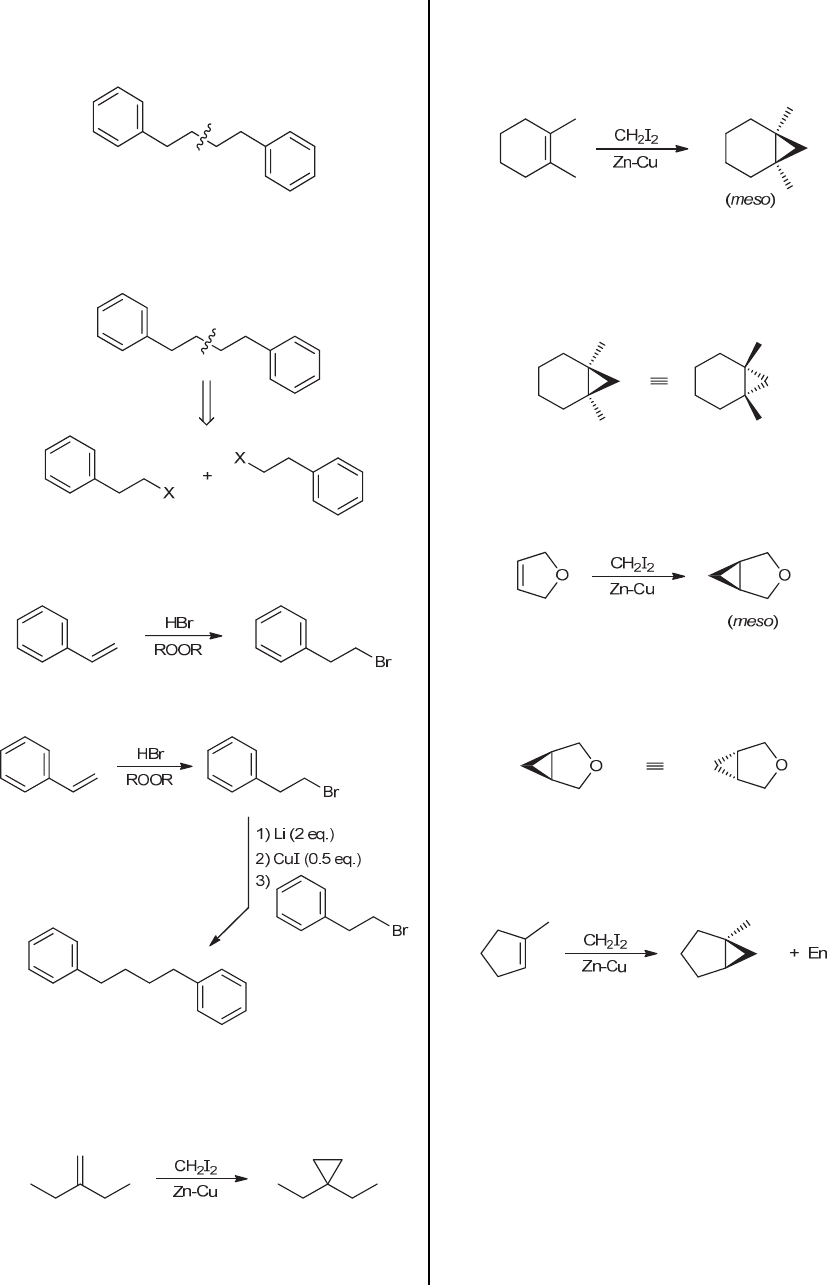 974 CHAPTER 23 dictates that styrene (which has eight carbon atoms) must be the only source of carbon atoms. Therefore, we must create the following bond, indicated with a wavy line: Next, draw the two organohalides that are necessary for the coupling process. In this case, we need two identical alkyl halides, as shown: These alkyl halides can be made from styrene via the anti-Markovnikov addition of HBr (see Section 11.10): The entire synthesis is shown below: 23.10. (a) Upon treatment with CH2I2 and Zn-Cu, an alkene will undergo a Simmons-Smith reaction, thereby converting the C=C unit into a cyclopropane ring (with introduction of a methylene group): In this case, the product has no chiral centers, so wedges and dashes are not drawn. (b) Upon treatment with CH2I2 and Zn-Cu, an alkene will undergo a Simmons-Smith reaction, thereby converting the C=C unit into a cyclopropane ring (with introduction of a methylene group): In this case, the product has two chiral centers, and is a meso compound (it does not have an enantiomer). Introduction of the methylene group can occur on either face of the bond, giving the same meso compound in either case: (c) Upon treatment with CH2I2 and Zn-Cu, an alkene will undergo a Simmons-Smith reaction, thereby converting the C=C unit into a cyclopropane ring (with introduction of a methylene group): In this case, the product has two chiral centers, and is a meso compound (it does not have an enantiomer). Introduction of the methylene group can occur on either face of the bond, giving the same meso compound in either case: (d) Upon treatment with CH2I2 and Zn-Cu, an alkene will undergo a Simmons-Smith reaction, thereby converting the C=C unit into a cyclopropane ring (with introduction of a methylene group): In this case, the product is not a meso compound. Since the methylene group can be installed on either face of the bond, we expect a pair of enantiomers. (e) Upon treatment with CH2I2 and Zn-Cu, an alkene will undergo a Simmons-Smith reaction, thereby converting the C=C unit into a cyclopropane ring (with introduction of a methylene group). In this case, the starting alkene has a trans configuration, which is preserved in the product. Introduction of the methylene group can occur on either face of the bond, giving rise to a pair of enantiomers: www.MyEbookNiche.eCrater.com