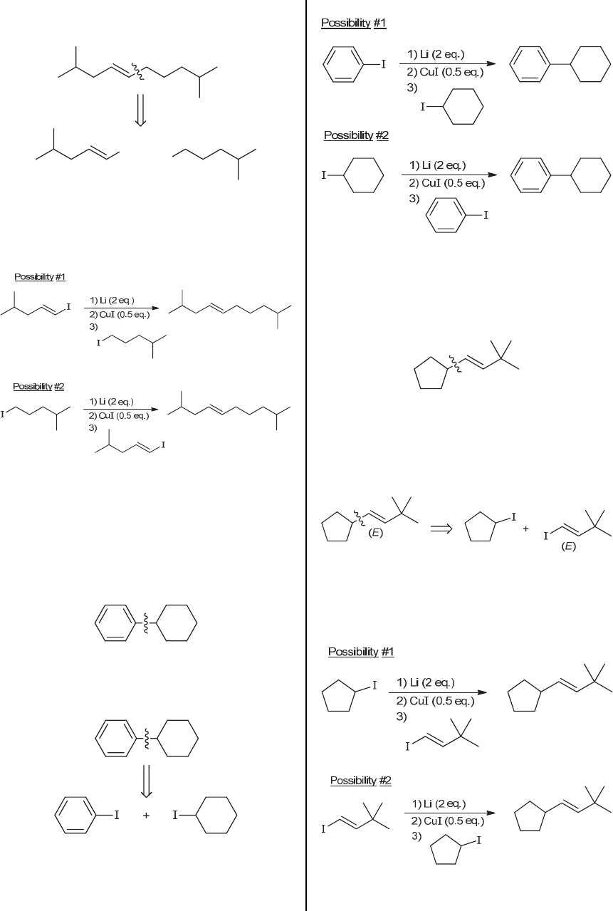 CHAPTER 23 973 iodide must have an E configuration, because that C=C unit has the E configuration in the product: + (E) (E) I I One of these organohalides must be converted into a Gilman reagent and then treated with the other organohalide. This leads to two possible synthetic routes, both of which are viable: (b) First determine which bond (in the product) will be made via a coupling process. The problem statement dictates that each organohalide must have no more than 6 carbon atoms. Since the product has twelve carbon atoms, that leaves us with only one choice, indicated below with a wavy line: Next, draw the two organohalides that are necessary for the coupling process. In this case, we need cyclohexyl iodide and iodobenzene, as shown: One of these organohalides must be converted into a Gilman reagent and then treated with the other organohalide. This leads to two possible synthetic routes, both of which are viable: (c) First determine which bond (in the product) will be made via a coupling process. The problem statement dictates that each organohalide must have no more than 6 carbon atoms, so we select the following bond (six carbon atoms on one side and five on the other): Next, draw the two organohalides that are necessary for the coupling process. In this case, we need cyclopentyl iodide and a vinyl iodide. Note that the vinyl iodide must have an E configuration, because that C=C unit has the E configuration in the product: One of these organohalides must be converted into a Gilman reagent and then treated with the other organohalide. This leads to two possible synthetic routes, both of which are viable: 23.9. (a) First determine which bond (in the product) will be made via a coupling process. The problem statement www.MyEbookNiche.eCrater.com