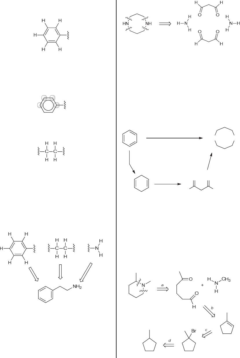 CHAPTER 22 953 aromatic ring. The integration of this signal is 5, which indicates that the ring is monosubstituted: The presence of a monosubstituted ring is confirmed by the four signals between 100 and 150 ppm in the 13C NMR spectrum (the region associated with sp2 hybridized carbon atoms), just as expected for a monosubstituted aromatic ring: In the 1H NMR spectrum, the pair of triplets (each with an integration of 2) indicates a pair of neighboring methylene groups: These methylene groups account for the two upfield signals in the 13C NMR spectrum. Thus far, we have accounted for all of the atoms in the molecular formula, except for one nitrogen atom and two hydrogen atoms, suggesting an amino group. This would indeed explain the singlet in the 1H NMR spectrum with an integration of 2. We have now analyzed all of the signals in both spectra, and we have uncovered the following three fragments, which can be connected to each other in only one way: 22.82. The product has four C-N bonds, each of which can be prepared via a reductive amination process. As such, the product can be made from the following starting materials (two equivalents of ammonia and two equivalents of a dialdehyde): The necessary dialdehyde has only three carbon atoms, but the starting material (benzene) has six carbon atoms. This suggests that we must somehow break apart the aromatic ring into two fragments. This might seem impossible at first, as we have seen that aromatic rings are particularly stable. We did, however, cover a reaction that destroys aromaticity (a Birch reduction will convert benzene into 1,4-cyclohexadiene). If a Birch reduction is followed by ozonolysis, the resulting dialdehyde can then be treated with ammonia and sodium cyanoborohydride (with an acid catalyst) to give the product: 3) DMS H O H O HN NH 1) Na, NH3, CH3OH 2) O3 4) [ H+ ], NaBH3CN, NH3Na, NH3 CH3OH 2) DMS 1) O3 NH3 NaBH3CN [ H+ ] 22.83. The starting material exhibits a five-membered ring, while the product exhibits a six-membered ring that contains a nitrogen atom. Since we have not learned a way to insert a nitrogen atom into an existing ring, we must consider opening the ring, and then closing it back up again (in a way that incorporates the nitrogen atom into the ring). There are certainly many acceptable synthetic routes. One such route derives from the following retrosynthetic analysis. An explanation of each of the steps (a-d) follows. www.MyEbookNiche.eCrater.com