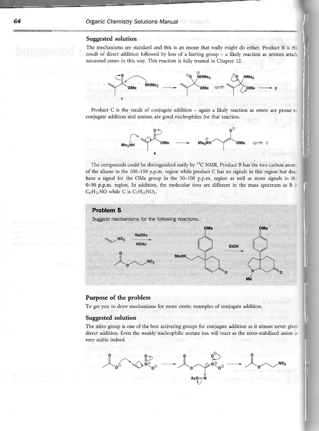64 Organic Chemistry Solutions Manual Suggested solution The mechanisms are standard and this is an enone that really might do either. Product B is the result of direct addition followed by loss of a leaving group - a likely reaction as amines saturated esters in this way. This reaction is fully treated in Chapter 12. 0 NHMe₂ 0 NMe₂ NHMe₂ OMe OMe OMe B A Product C is the result of conjugate addition - again a likely reaction as esters are prone to conjugate addition and amines are good nucleophiles for that reaction. 0 0 OMe Me₂NH Me₂NH OMe c A The compounds could be distinguished easily by ¹³C NMR. Product B has the two carbon of the alkene in the 100-150 p.p.m. region while product C has no signals in this region but does have a signal for the OMe group in the 50-100 p.p.m. region as well as more signals in the 0-50 p.p.m. region. In addition, the molecular ions are different in the mass spectrum as B is C₆H₁₁ NO while C is C₇H₁₅NO₂. Problem 5 Suggest mechanisms for the following reactions. OMe OMe NO₂ HOAc EtOH 0 MeHN NO₂ N Me Purpose of the problem To get you to draw mechanisms for more exotic examples of conjugate addition. Suggested solution The nitro group is one of the best activating groups for conjugate addition as it almost never gives direct addition. Even the weakly nucleophilic acetate ion will react as the nitro-stabilized anion is very stable indeed. 0 0 0 NO NO NO₂ 0 1 0 0 AcO H