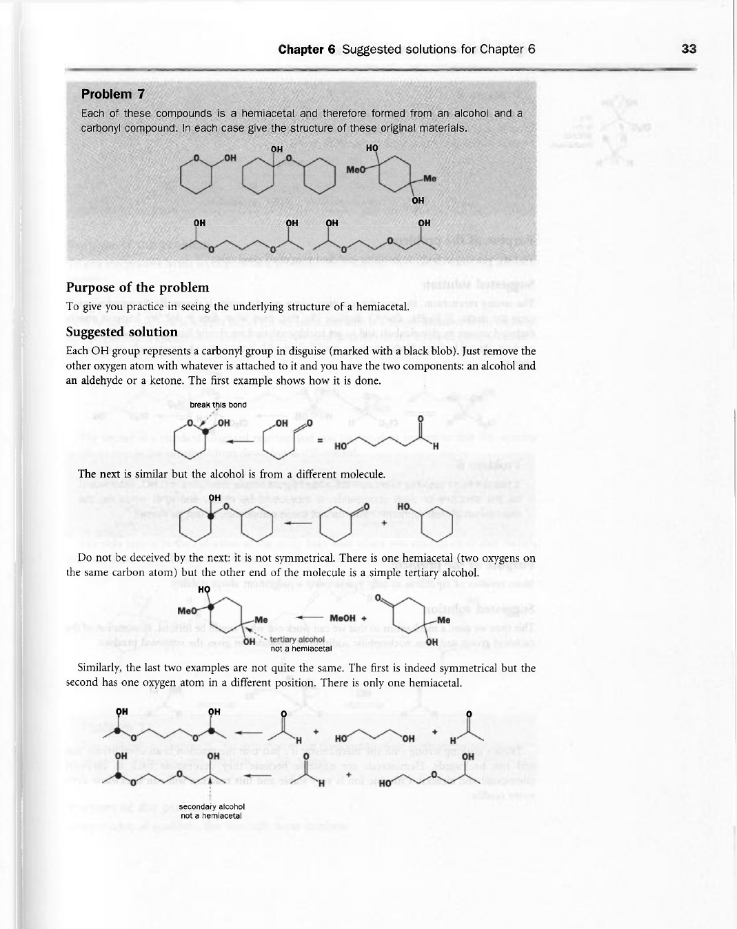 Chapter 6 Suggested solutions for Chapter 6 33 Problem 7 Each of these compounds is a hemiacetal and therefore formed from an alcohol and a carbonyl compound. In each case give the structure of these original materials. 0 MeO Me OH oH OH Purpose of the problem To give you practice in seeing the underlying structure of a hemiacetal. Suggested solution Each OH group represents a carbonyl group in disguise (marked with a black blob). Just remove the other oxygen atom with whatever is attached to it and you have the two components: an alcohol and an aldehyde or a ketone. The first example shows how it is done. break this bond 0 oH oH 0 0 = Ho H The next is similar but the alcohol is from a different molecule. 0 0 + Do not be deceived by the next: it is not symmetrical. There is one hemiacetal (two oxygens on the same carbon atom) but the other end of the molecule is a simple tertiary alcohol. 0 MeO Me MeOH + Me OH tertiary alcohol oH not a hemiacetal Similarly, the last two examples are not quite the same. The first is indeed symmetrical but the second has one oxygen atom in a different position. There is only one hemiacetal. OH OH 0 + + 0 0 H H OH OH 0 OH + 0 0 H secondary alcohol not a hemiacetal
