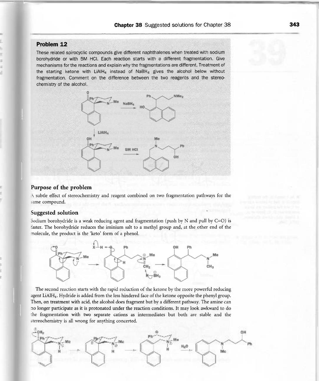 Chapter 38 Suggested solutions for Chapter 38 343 Problem 12 These related spirocyclic compounds give different naphthalenes when treated with sodium borohydride or with 5M HCI. Each reaction starts with a different fragmentation. Give mechanisms for the reactions and explain why the fragmentations are different. Treatment of the starting ketone with instead of NaBH₄ gives the alcohol below without fragmentation. Comment on the difference between the two reagents and the stereo- chemistry of the alcohol. 0 Ph NMe₂ Ph Me N NaBH₄ Ho Me Ph N Ph N Me 5M HCI OH Purpose of the problem A subtle effect of stereochemistry and reagent combined on two fragmentation pathways for the same compound. Suggested solution Sodium borohydride is a weak reducing agent and fragmentation (push by N and pull by C=O) is faster. The borohydride reduces the iminium salt to a methyl group and, at the other end of the molecule, the product is the 'keto' form of a phenol. 0 X H Ph OH Ph Ph Me Me N Me N N H CH₂ CH₃ N BH₃ The second reaction starts with the rapid reduction of the ketone by the more powerful reducing agent Hydride is added from the less hindered face of the ketone opposite the phenyl group. Then, on treatment with acid, the alcohol does fragment but by a different pathway. The amine can no longer participate as it is protonated under the reaction conditions. It may look awkward to do the fragmentation with two separate cations as intermediates but both are stable and the stereochemistry is all wrong for anything concerted. OH Ph Ph Me Me N Me N N Ph H H