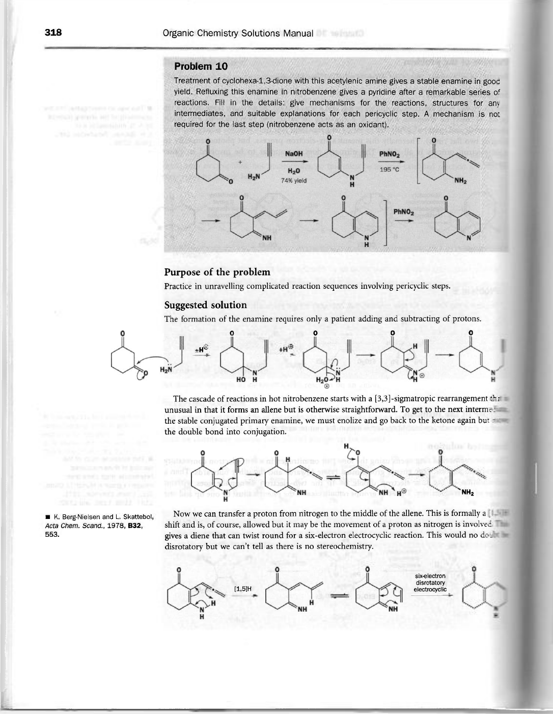 318 Organic Chemistry Solutions Manual Problem 10 Treatment of cyclohexa-1,3-dione with this acetylenic amine gives a stable enamine in good yield. Refluxing this enamine in nitrobenzene gives a pyridine after a remarkable series of reactions. Fill in the details: give mechanisms for the reactions, structures for any intermediates, and suitable explanations for each pericyclic step. A mechanism is not required for the last step (nitrobenzene acts as an oxidant). 0 NaOH PhNO₂ + H2O 195 °C 74% yield N 0 NH₂ H 0 0 0 PhNO₂ NH N N H Purpose of the problem Practice in unravelling complicated reaction sequences involving pericyclic steps. Suggested solution The formation of the enamine requires only a patient adding and subtracting of protons. 0 0 0 0 0 H 0 N N N N H H2O H H H + The cascade of reactions in hot nitrobenzene starts with a [3,3]-sigmatropic rearrangement that unusual in that it forms an allene but is otherwise straightforward. To get to the next interme the stable conjugated primary enamine, we must enolize and go back to the ketone again but the double bond into conjugation. H 0 0 0 0 H / N NH NH H + NH₂ H K. Berg-Nielsen and L. Skattebol, Now we can transfer a proton from nitrogen to the middle of the allene. This is formally a Acta Chem. Scand., 1978, B32, shift and is, of course, allowed but it may be the movement of a proton as nitrogen is involved. 553. gives a diene that can twist round for a six-electron electrocyclic reaction. This would no disrotatory but we can't tell as there is no stereochemistry. 0 0 o six-electron disrotatory [1,5]H electrocyclic H H N NH NH H