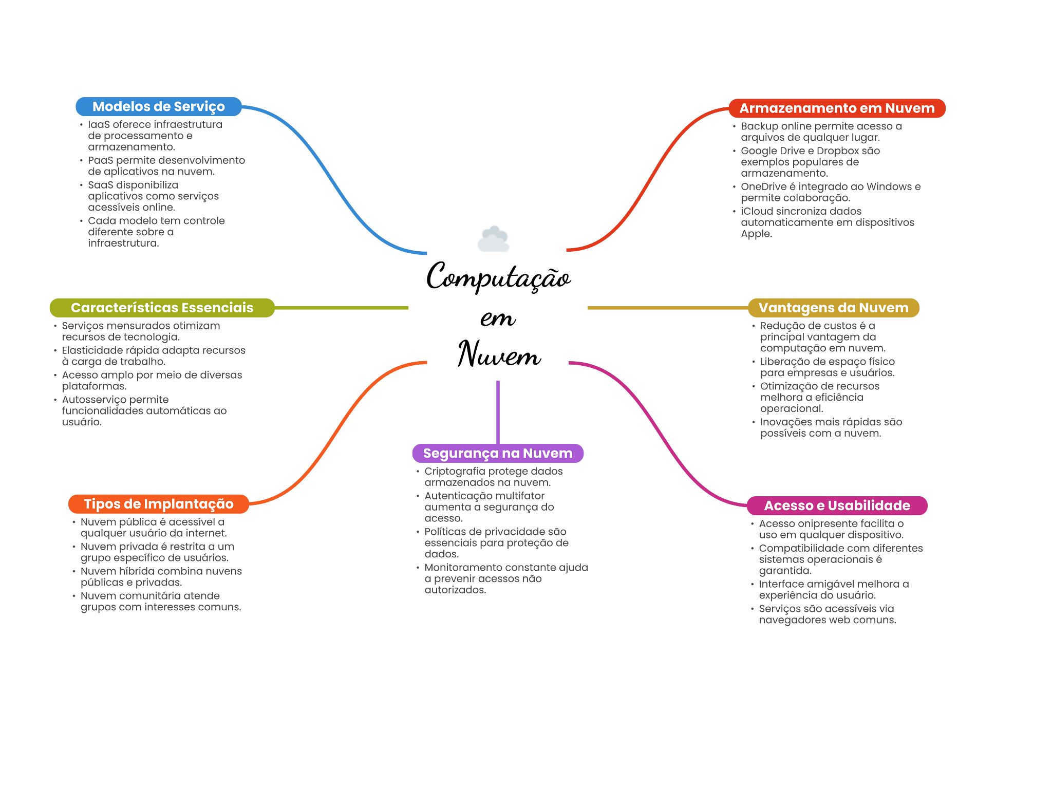 Modelos de Serviço Armazenamento em Nuvem Backup online permite a de processamento arquivos de qualquer lugar. Google Drive . Dropbox são permite desenvolvimento populares de de aplicativos na nuvem. ao Windows . aplicativos como serviços permite colaboração. online. dados Cada modelo controle automaticamente em dispositivos diferente sobre a Apple. Características Essenciais Vantagens da Nuvem Serviços mensurados otimizam Redução de custos é a recursos de tecnologia. principal vantagem da Elasticidade rápida adapta recursos computação em nuvem. carga de trabalho. Liberação de espaço físico Acesso amplo por meio de para empresas usuários. plataformas. Otimização de recursos Autosserviço permite melhora eficiência funcionalidades automáticas operacional. inovações são com a nuvem. Segurança na Nuvem Criptografia protage dados na nuvem. Autenticação multifator Tipos de Implantação a segurança do Acesso e Usabilidade pública 6 a acesso. Acesso onipresente facilita qualquer usuário da internet. Politicas de privacidade uso em qualquer dispositivo. privada é restrita a um para proteção de dados. Compatibilidade com diferentes grupo específico de usuários. sistemas é Nuvem hibrida combina nuvens constante ajuda garantida. públicas . privadas. a prevenir acessos não amigável melhora a Nuvern comunitária atende experiência do usuário. grupos com Serviços são via navegadores web comune.
