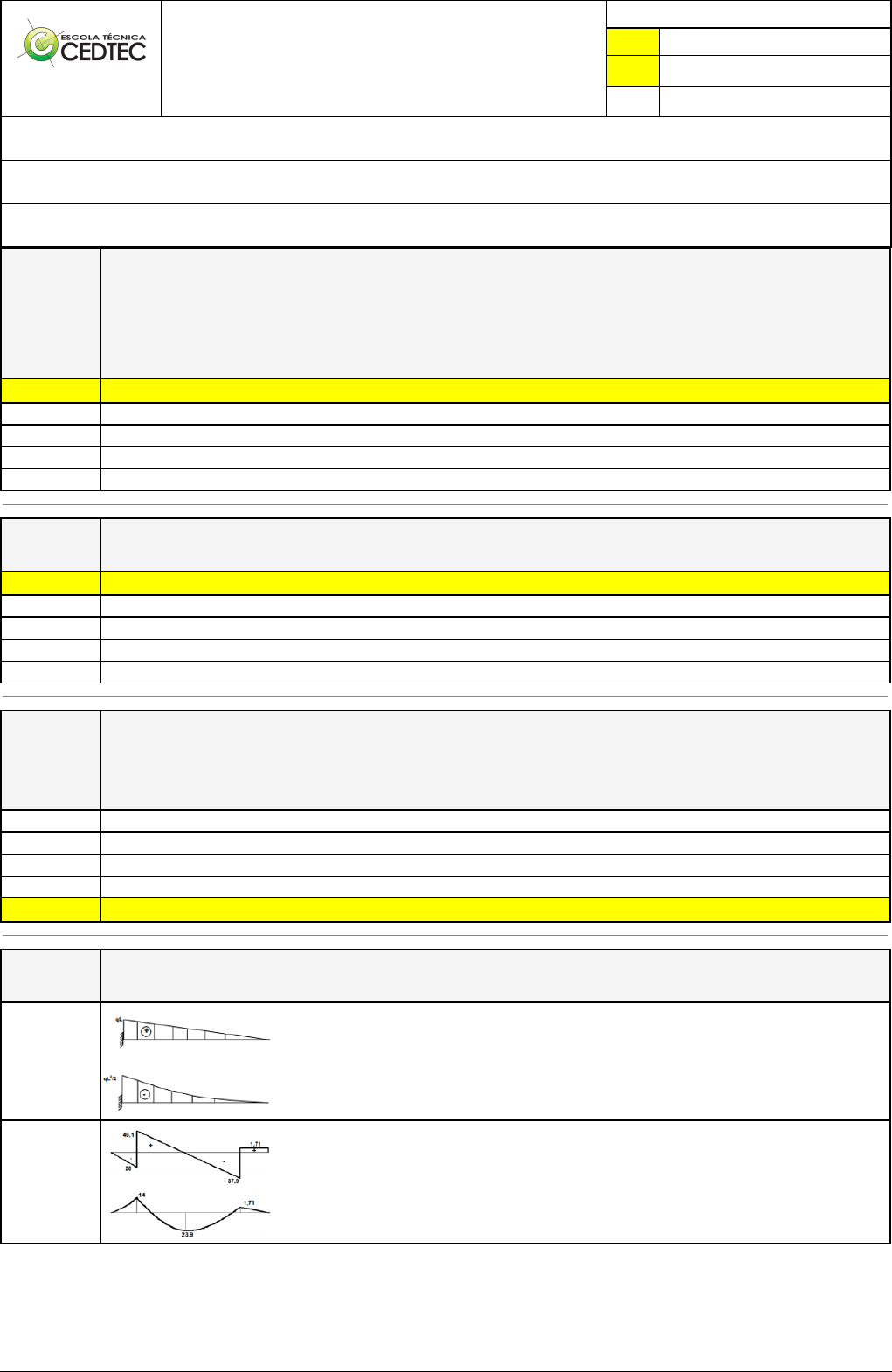 Pincel Atômico - 30/10/2025 19:54:13 1/2 KAIO CRISTHIAN DE OLIVEIRA AMORIM Exercício Caminho do Conhecimento - Etapa 4 (17712) Atividade finalizada em 30/10/2025 19:53:58 (5364859 / 1) LEGENDA Resposta correta na questão # Resposta correta - Questão Anulada X Resposta selecionada pelo Aluno Disciplina: ESTRUTURAS - LAJES [1960993] - Avaliação com 4 questões, com o peso total de 13,00 pontos [capítulos - 102] Turma: Curso Técnico: Edificações - Grupo: EAD - 09/25 - EAD EDI [187383] Aluno(a): 91853754 - KAIO CRISTHIAN DE OLIVEIRA AMORIM - Respondeu 3 questões corretas, obtendo um total de 9,75 pontos como nota [350290_73862] Questão 001 Indique se as alternativas abaixo são verdadeiras ou falsas: ( ) Os diagramas de força cortante para pórticos isostáticos são construídos da mesma forma que nas vigas isostáticas, obedecendo a rotação dos eixos. ( ) Na construção dos diagramas de momento fletor as barras perpendiculares têm seus diagramas independentes, mas quando as barras são paralelas os momentos são sequenciais. ( ) As forças normais são forças que atuam no sentido do eixo da peça da estrutura, provocando efeito de tração ou compressão. ( ) Para o cálculo do diagramas de forças cortantes para cargas concentradas em pórticos isostáticos não é necessário calcular os esforços externos reativos. X V – V – V – F V – V – F – F F – V – F – F V – F – V – V F – V – V – F [350292_73865] Questão 002 Qual das opções não representa uma linha de estado: X Diagrama de Força Resultante Diagrama de Esforço Cortante Diagrama de Esforço Normal Diagrama de Momento Torsor Diagrama de Momento Fletor [350291_73864] Questão 003 Indique se as alternativas abaixo são verdadeiras ou falsas: ( ) A linha que representa a variação de um determinado esforço é chamada de linha do tempo. ( ) Nos diagramas de esforço cortante, os esforços positivos são marcados do lado de baixos das hastes horizontais. ( ) Em um trecho com carga uniformemente distribuída, o diagrama de esforço cortante é uma parábola do 2º grau. ( ) Sob uma carga concentrada, o diagrama de esforço cortante sofre uma descontinuidade de intensidade igual a carga projetada sobre o plano da seção V – V – F – F F – V – V – F F – V – F – F V – V – V – F X V – F – V – V [350290_73869] Questão 004 Marque a alternativa que corresponde ao gráfico de DEC e DMF, respectivamente: Pincel Atômico - 30/10/2025 19:54:13 2/2 X