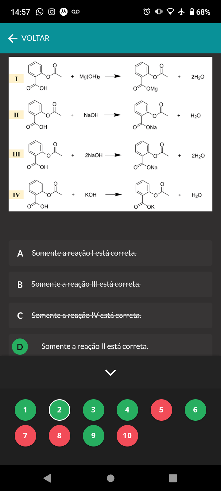 14:57 AA - 68% VOLTAR I + Mg(OH)₂ + OH OMg II + NaOH + OH ONa III + 2NaOH + OH ONa IV + + OH OK A Somente a reação está correta. B Somente a reação está correta. c Somente a reação IV está correta. D Somente a reação está correta. 1 2 3 4 5 6 7 8 9 10