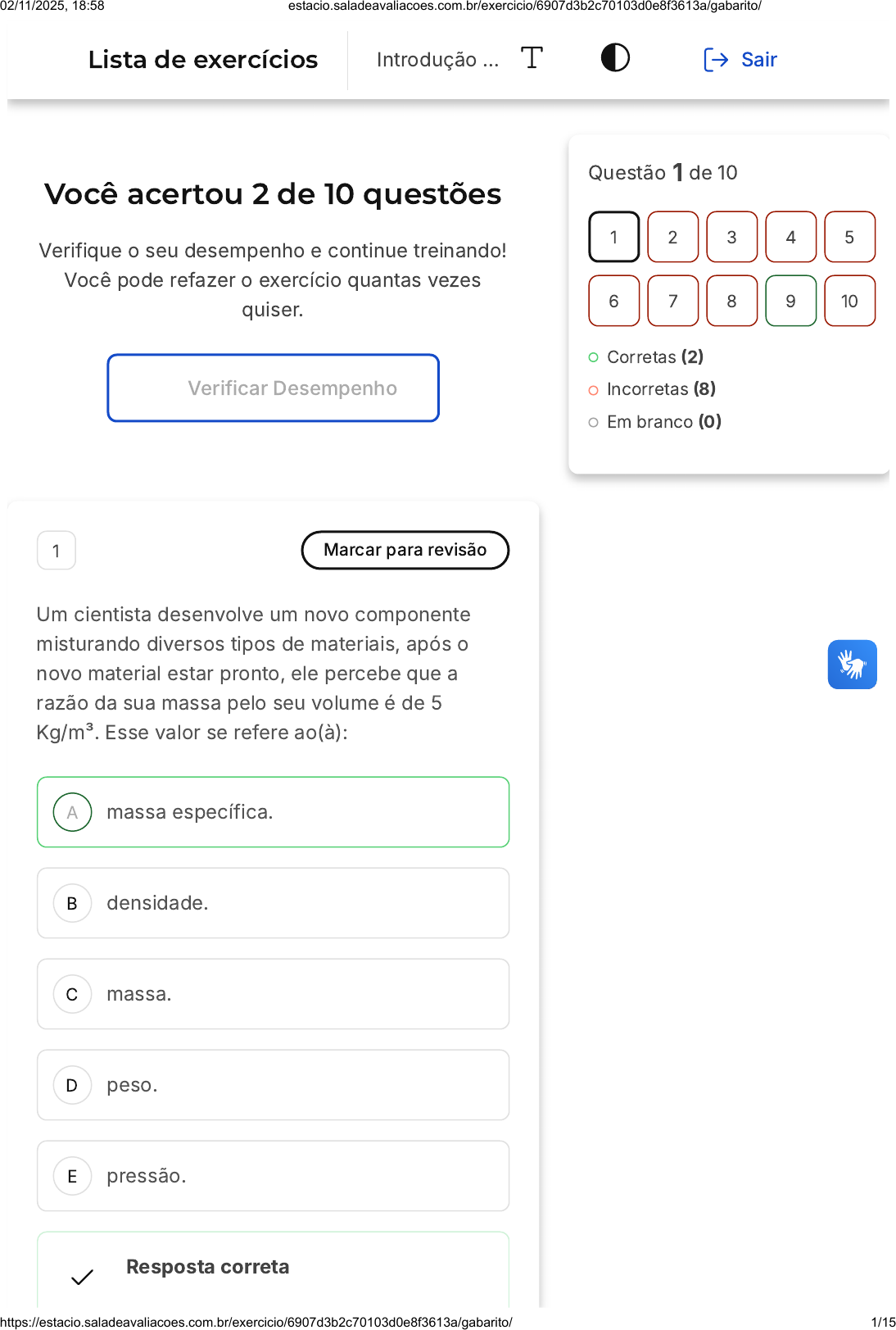 Você acertou 2 de 10 questões Verifique o seu desempenho e continue treinando! Você pode refazer o exercício quantas vezes quiser. Verificar Desempenho A B C D E 1 Marcar para revisão Um cientista desenvolve um novo componente misturando diversos tipos de materiais, após o novo material estar pronto, ele percebe que a razão da sua massa pelo seu volume é de 5 Kg/m³. Esse valor se refere ao(à): massa específica. densidade. massa. peso. pressão. Resposta correta Questão 1 de 10 Corretas (2) Incorretas (8) Em branco (0) 1 2 3 4 5 6 7 8 9 10 Lista de exercícios Introdução … Sair 02/11/2025, 18:58 estacio.saladeavaliacoes.com.br/exercicio/6907d3b2c70103d0e8f3613a/gabarito/ https://estacio.saladeavaliacoes.com.br/exercicio/6907d3b2c70103d0e8f3613a/gabarito/ 1/15 Parabéns, você selecionou a alternativa correta. Confira o gabarito comentado! Gabarito Comentado A opção correta é: massa específica. Como se trata de um material composto de várias substâncias, se trata de massa específica. Caso fosse um corpo homogêneo, seria densidade. 2 Marcar para revisão O princípio de Bernoulli descreve o comportamento de um fluido em movimento e afirma que em um fluxo constante, a soma da energia cinética, da energia potencial gravitacional e da energia potencial de pressão em qualquer ponto é constante, desde que a viscosidade do fluido seja desprezada. Analise as afirmativas a seguir com relação ao fenômeno que está relacionado com o princípio de Bernoulli: I. Aproximação lateral de moto e caminhão no momento da ultrapassagem. II. Flutuação de um imenso transatlântico no oceano. III. Movimento da cortina em um quarto devido à abertura ou fechamento da porta. IV. "Levitação" de uma bola de tênis de mesa devido a um secador de cabelo ligado abaixo dela. É correto o que se afirma em: 02/11/2025, 18:58 estacio.saladeavaliacoes.com.br/exercicio/6907d3b2c70103d0e8f3613a/gabarito/ https://estacio.saladeavaliacoes.com.br/exercicio/6907d3b2c70103d0e8f3613a/gabarito/ 2/15 A B C D E Apenas I, II e III. Apenas II, III e IV. Apenas III, IV I, II, III e IV. Apenas I, III, IV. Resposta incorreta Opa! A alternativa correta é a letra E. Confira o gabarito comentado! Gabarito Comentado A opção correta é: Apenas I, III, IV. I - Está relacionado com o princípio de Bernoulli. Quando um veículo de maior tamanho (como um caminhão) move-se rapidamente, ele empurra o ar à sua frente e cria uma região de baixa pressão atrás dele. Uma moto se aproximando lateralmente pode ser puxada para essa região de baixa pressão, criando uma sensação de "sucção". II - Não está relacionado com o princípio de Bernoulli. A flutuação é explicada pelo princípio de Arquimedes, que afirma que um corpo imerso em um fluido sofre um empuxo vertical para cima igual ao peso do fluido deslocado pelo corpo. III - Está relacionado com o princípio de Bernoulli. Ao abrir ou fechar rapidamente a porta, você está alterando a pressão do ar em uma área, fazendo com que o ar se mova e, consequentemente, movimentando a cortina. 02/11/2025, 18:58 estacio.saladeavaliacoes.com.br/exercicio/6907d3b2c70103d0e8f3613a/gabarito/ https://estacio.saladeavaliacoes.com.br/exercicio/6907d3b2c70103d0e8f3613a/gabarito/ 3/15 A B C D E IV - Está relacionado com o princípio de Bernoulli. O fluxo rápido do ar do secador de cabelo cria uma região de baixa pressão acima da bola, permitindo que a pressão atmosférica a mantenha flutuando no fluxo de ar. 3 Marcar para revisão Em procedimentos médicos, é muito comum injetar soro na veia dos pacientes. Para que o soro possa fluir para dentro da veia do paciente, os enfermeiros colocam a bolsa de soro em uma posição acima de onde se encontra a veia onde foi inserida a agulha. Esse procedimento é correto, pois está de acordo com o princípio de: Stevin Arquimedes Pascal Bernoulli Torricelli Resposta incorreta Opa! A alternativa correta é a letra A. Confira o gabarito comentado! Gabarito Comentado 02/11/2025, 18:58 estacio.saladeavaliacoes.com.br/exercicio/6907d3b2c70103d0e8f3613a/gabarito/ https://estacio.saladeavaliacoes.com.br/exercicio/6907d3b2c70103d0e8f3613a/gabarito/ 4/15 A alternativa correta é a letra A, que se refere ao princípio de Stevin. Este princípio explica que a pressão exercida por um fluido em repouso é diretamente proporcional à profundidade desse ponto no fluido, à densidade do fluido e à aceleração da gravidade. No contexto da questão, quando os enfermeiros colocam a bolsa de soro em uma posição acima da veia do paciente, eles estão utilizando o princípio de Stevin. A bolsa de soro, ao estar em uma posição elevada, possui energia potencial devido à sua altura. Essa energia é convertida em pressão à medida que o soro desce, permitindo que ele flua para a veia do paciente. Portanto, a diferença de pressão causada pela coluna de líquido (soro) é o que permite que o soro flua para dentro da veia do paciente, conforme explica o princípio de Stevin. 4 Marcar para revisão Um recipiente cilíndrico contendo determinado líquido é encerrado por um êmbolo móvel, conforme mostra a figura a seguir: Sem aplicar força alguma no êmbolo, a diferença de pressão entre os pontos A e B, distantes h = 10 cm, é de 3,0 x 105 Pa. A partir de determinado instante, uma força constante de 50 N é aplicada ao êmbolo, cuja seção reta é de 10 cm². 02/11/2025, 18:58 estacio.saladeavaliacoes.com.br/exercicio/6907d3b2c70103d0e8f3613a/gabarito/ https://estacio.saladeavaliacoes.com.br/exercicio/6907d3b2c70103d0e8f3613a/gabarito/ 5/15 A B C D E Dado: g = 10 m/s². Sabendo que a densidade do líquido é de 2,0 x 103 kg/m³, a diferença de pressão entre A e B a partir desse momento será igual a: 3,0 x 10 Pa5 3,5 x 10 Pa5 4,0 x 10 Pa5 4,5 x 10 Pa5 5,0 x 10 Pa5 Resposta incorreta Opa! A alternativa correta é a letra A. Confira o gabarito comentado! Gabarito Comentado A opção correta é: 3,0 x 10 Pa A diferença de pressão ent