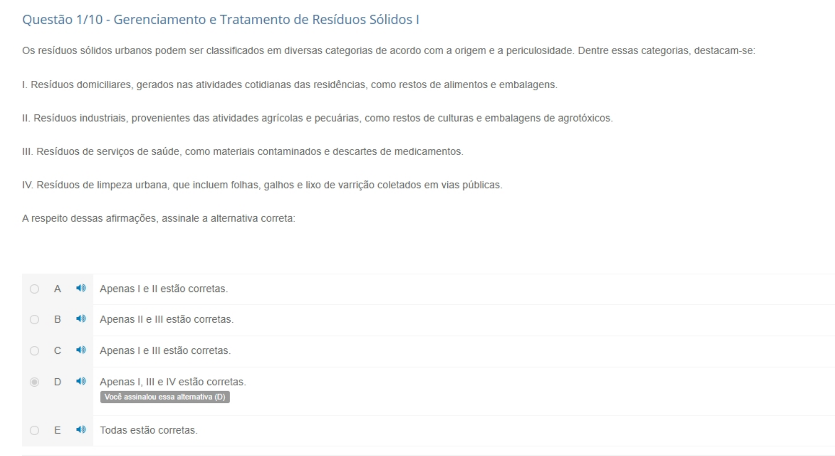 Questão 1/10 Gerenciamento e Tratamento de Resíduos Sólidos Os resíduos sólidos urbanos podem ser classificados em diversas categorias de acordo com a origem e a periculosidade. Dentre essas categorias, destacam-se: Resíduos domiciliares, gerados nas atividades cotidianas das residências, como restos de alimentos e embalagens. II. Resíduos industriais, provenientes das atividades agrícolas e pecuárias, como restos de culturas e embalagens de agrotóxicos. III. Resíduos de serviços de saúde, como materiais contaminados e descartes de medicamentos. IV. Resíduos de limpeza urbana, que incluem folhas, galhos e lixo de varrição coletados em vias públicas. A respeito dessas afirmações, assinale a alternativa correta: A Apenas e estão corretas. B Apenas e III estão corretas. C Apenas e III estão corretas. D Apenas I, III e IV estão corretas. Você assinalou essa alternativa (D) E Todas estão corretas.Questão 2/10 Gerenciamento e Tratamento de Resíduos Sólidos I Qual das seguintes opções descreve corretamente uma amostra composta, de acordo com a ABNT NBR 10.007/2004? A Amostra obtida de um único ponto ou profundidade específica. B Amostra coletada apenas em estado líquido para análise de pH. C Amostra formada pela soma de várias parcelas coletadas em diferentes pontos ou tempos. Você assinalou essa alternativa (C) D Amostra coletada apenas de resíduos perigosos para análise microbiológica. E Amostra composta exclusivamente por resíduos recicláveis.Questão 3/10 Gerenciamento e Tratamento de Resíduos Sólidos Ler em voz alta A logística reversa, instituída pela Política Nacional de Resíduos Sólidos (PNRS), é um dos instrumentos que visa garantir a devolução de produtos após 0 consumo para que sejam reutilizados, reciclados ou descartados de forma ambientalmente adequada, em um sistema de responsabilidade compartilhada. Essa medida busca minimizar 0 impacto ambiental dos resíduos, promovendo a reintegração de materiais ao ciclo produtivo e reduzindo a quantidade de lixo destinada aos aterros sanitários. Em relação à gestão de resíduos sólidos, analise as afirmações abaixo. I. A responsabilidade compartilhada pelo ciclo de vida dos produtos, conforme a PNRS, envolve fabricantes, importadores, distribuidores e comerciantes no gerenciamento adequado dos resíduos, ou seja, todos os agentes envolvidos, desde as etapas de extração, beneficiamento, produção e comercialização. II. Isso ocorre porque a logística reversa busca garantir que todos resíduos, independentemente de sua origem ou tipologia, sejam coletados e tratados adequadamente. A respeito dessas afirmações, assinale a alternativa correta: Você não pontuou essa questão A e estão corretas, e justifica I. B e estão corretas, mas não justifica I. C está correta, mas está incorreta. Você assinalou essa alternativa (C) D está incorreta, mas está correta. E e estão incorretas.Questão 4/10 Gerenciamento e Tratamento de Resíduos Sólidos Ler em alta A Política Nacional de Resíduos Sólidos (PNRS), instituída pela Lei n° 12.305, de 2 de agosto de 2010, estabelece diretrizes, objetivos e instrumentos para a gestão integrada e 0 gerenciamento adequado dos resíduos sólidos no Brasil. Ela prioriza uma série de ações para promover a responsabilidade compartilhada entre governo, empresas e sociedade para minimizar os impactos ambientais e promover desenvolvimento sustentável. De acordo com a PNRS, qual seria uma das primeiras possibilidades de ações a serem realizadas no âmbito da hierarquia da gestão de resíduos sólidos? A Reciclagem. B Redução na geração. Você assinalou essa alternativa (B) C Tratamento térmico. D Coleta e disposição final. E Compostagem. Questão 5/10 Gerenciamento e Tratamento de Resíduos Sólidos Ler em alta A Política Nacional de Resíduos Sólidos (PNRS), instituída pela Lei 12.305/2010, estabelece diretrizes para 0 gerenciamento dos resíduos sólidos no Brasil. Qual é principal objetivo da PNRS? A Aumentar a geração de resíduos sólidos urbanos. B Reduzir a coleta seletiva nos municípios brasileiros. Incentivar a incineração de resíduos perigosos em áreas urbanas. D Aumentar a utilização de aterros sanitários para resíduos recicláveis. E Promover a gestão integrada e 0 gerenciamento ambientalmente adequado dos resíduos Você assinalou essa alternativa (E)Questão 6/10 Gerenciamento e Tratamento de Resíduos Sólidos Ler em alta A Resolução CONAMA 275/2001 estabelece 0 código de cores para a identificação e separação dos diferentes tipos de resíduos, visando padronizar a coleta seletiva em todo 0 território nacional. Essa medida facilita 0 reconhecimento visual e promove a reciclagem e 0 descarte adequado dos resíduos, contribuindo para a gestão sustentável e a minimização dos impactos ambientais decorrentes da disposição inadequada dos materiais. Considerando a definição da resolução, qual das alternativas a seguir corresponde à cor de contentores de resíduos destinados ao descarte adequado de resíduos plásticos, incluindo embalagens plásticas, sacos, garrafas, potes, entre outros? A Azul Vermelho Você assinalou essa alternativa (B) Verde D Amarelo E Branco Questão 7/10 Gerenciamento e Tratamento de Resíduos Sólidos Ler em alta De acordo com a norma ABNT NBR 10.004/2004, OS resíduos perigosos (Classe I) são aqueles que apresentam características que podem oferecer riscos à saúde pública e ao meio ambiente. Qual das alternativas a seguir descreve corretamente uma característica de resíduos perigosos? A São inflamáveis, tóxicos ou corrosivos e podem causar danos à saúde. Você assinalou essa alternativa (A) B São biodegradáveis e não oferecem risco ao meio ambiente. C São compostos apenas por restos de alimentos e resíduos orgânicos. D Não apresentam nenhum tipo de perigo à saúde ou ao meio ambiente. E São formados por materiais recicláveis, como papel e