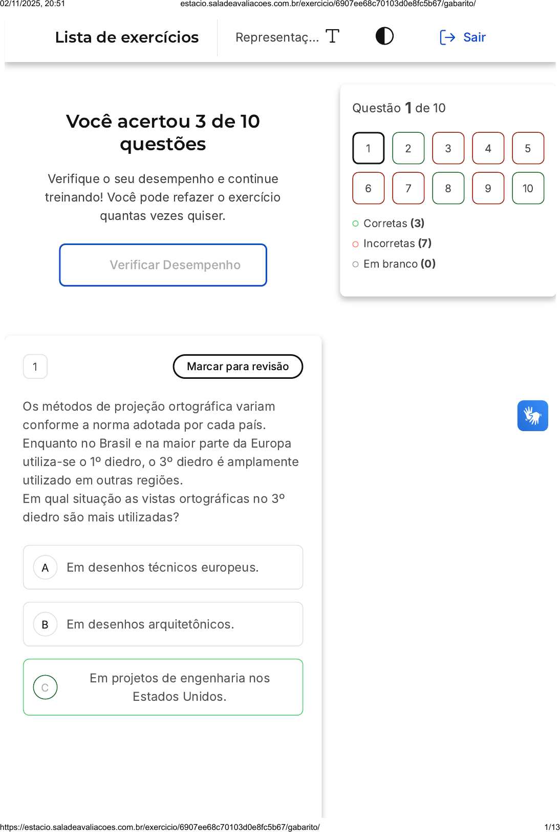 Você acertou 3 de 10 questões Verifique o seu desempenho e continue treinando! Você pode refazer o exercício quantas vezes quiser. Verificar Desempenho A B C 1 Marcar para revisão Os métodos de projeção ortográfica variam conforme a norma adotada por cada país. Enquanto no Brasil e na maior parte da Europa utiliza-se o 1º diedro, o 3º diedro é amplamente utilizado em outras regiões. Em qual situação as vistas ortográficas no 3º diedro são mais utilizadas? Em desenhos técnicos europeus. Em desenhos arquitetônicos. Em projetos de engenharia nos Estados Unidos. Questão 1 de 10 Corretas (3) Incorretas (7) Em branco (0) 1 2 3 4 5 6 7 8 9 10 Lista de exercícios Representaç… Sair 02/11/2025, 20:51 estacio.saladeavaliacoes.com.br/exercicio/6907ee68c70103d0e8fc5b67/gabarito/ https://estacio.saladeavaliacoes.com.br/exercicio/6907ee68c70103d0e8fc5b67/gabarito/ 1/13 D E Em mapas geográficos. Em ilustrações artísticas. Resposta incorreta Opa! A alternativa correta é a letra C. Confira o gabarito comentado! Gabarito Comentado O 3º diedro, também conhecido como método americano, é o sistema de projeção ortográfica adotado nos Estados Unidos e no Canadá, conforme as normas da ANSI (American National Standards Institute). Nesse método, as posições das vistas são diferentes do 1º diedro, mas as projeções resultantes são as mesmas, desde que a vista frontal seja mantida. Na Europa e no Brasil, o padrão utilizado é o do 1º diedro, conforme a NBR 10067. 2 Marcar para revisão A modelagem 3D tornou-se uma ferramenta indispensável no desenvolvimento de produtos e projetos de engenharia. Ao permitir simulações, visualizações e ajustes rápidos, ela contribui para a otimização do processo de criação, desde o esboço até a fabricação. Por que é importante compreender os conceitos e ambientes de modelagem 3D? 02/11/2025, 20:51 estacio.saladeavaliacoes.com.br/exercicio/6907ee68c70103d0e8fc5b67/gabarito/ https://estacio.saladeavaliacoes.com.br/exercicio/6907ee68c70103d0e8fc5b67/gabarito/ 2/13 A B C D E Para criar protótipos sem falhas. Para realizar cálculos de geometria descritiva. Para compreender a física dos objetos tridimensionais. Para desenvolver projetos de engenharia mais eficientes. Para explorar a arte da modelagem virtual. Resposta correta Parabéns, você selecionou a alternativa correta. Confira o gabarito comentado! Gabarito Comentado A compreensão dos conceitos e ambientes de modelagem 3D permite que o engenheiro simule, visualize e modifique projetos com mais rapidez e precisão, sem a necessidade de protótipos físicos. Isso resulta em processos mais ágeis, econômicos e seguros, aumentando as chances de sucesso desde a concepção até a produção. Por isso, é considerada uma das ferramentas mais poderosas na engenharia moderna. 02/11/2025, 20:51 estacio.saladeavaliacoes.com.br/exercicio/6907ee68c70103d0e8fc5b67/gabarito/ https://estacio.saladeavaliacoes.com.br/exercicio/6907ee68c70103d0e8fc5b67/gabarito/ 3/13 A B C D E 3 Marcar para revisão A alternativa que contém o conjunto de vistas ortográficas principais (1º diedro) da peça mostrada abaixo: A B C D E Resposta incorreta Opa! A alternativa correta é a letra A. Confira o gabarito comentado! Gabarito Comentado Resposta correta: A 02/11/2025, 20:51 estacio.saladeavaliacoes.com.br/exercicio/6907ee68c70103d0e8fc5b67/gabarito/ https://estacio.saladeavaliacoes.com.br/exercicio/6907ee68c70103d0e8fc5b67/gabarito/ 4/13 A B C D E 4 Marcar para revisão Analise as sentenças abaixo referentes aos conceitos de protótipo: I. O protótipo permite materializar um produto que está sendo planejado, fazer testes e aprimorar sua versão final para produção; II. Os protótipos físicos estão relacionados à utilização de simulação computacional, o que proporciona maior facilidade e flexibilidade para ajustes do que os protótipos virtuais; III. A prototipagem virtual necessariamente elimina a prototipagem física em todos os casos; IV. Protótipos físicos são produtos tangíveis, enquanto os protótipos virtuais representam o produto de maneira intangível. Está(ão) correta(s), apenas: I, III e IV III e IV IV I e IV II e IV Resposta incorreta Opa! A alternativa correta é a letra D. Confira o gabarito comentado! 02/11/2025, 20:51 estacio.saladeavaliacoes.com.br/exercicio/6907ee68c70103d0e8fc5b67/gabarito/ https://estacio.saladeavaliacoes.com.br/exercicio/6907ee68c70103d0e8fc5b67/gabarito/ 5/13 Gabarito Comentado As sentenças corretas são a I e a IV. A sentença I está correta porque um protótipo é, de fato, uma versão inicial de um produto que permite testes e aprimoramentos antes da produção final. A sentença IV também está correta, pois diferencia corretamente os protótipos físicos, que são tangíveis, dos protótipos virtuais, que são representações intangíveis do produto. As sentenças II e III estão incorretas. A II está errada porque, na verdade, os protótipos virtuais é que estão relacionados à simulação computacional e proporcionam maior facilidade para ajustes. A III está errada porque a prototipagem virtual não elimina necessariamente a prototipagem física em todos os casos, pois em muitas situações, o protótipo físico ainda é necessário para testes mais concretos. 5 Marcar para revisão A Geometria Descritiva é um campo fundamental para o desenho técnico, especialmente na representação de objetos em projetos de engenharia. Criada por Gaspard Monge, ela permite representar com exatidão formas tridimensionais em suportes bidimensionais, como o papel. Qual das alternativas define corretamente a Geometria Descritiva? 02/11/2025, 20:51 estacio.saladeavaliacoes.com.br/exercicio/6907ee68c70103d0e8fc5b67/gabarito/ https://estacio.saladeavaliacoes.com.br/exercicio/6907ee68c70103d0e8fc5b67/gabarito/ 6/13 A B C D E Um método de desenho artístico. Uma forma de representar objetos tridimensionais em duas dimensões. Um sistema para medi