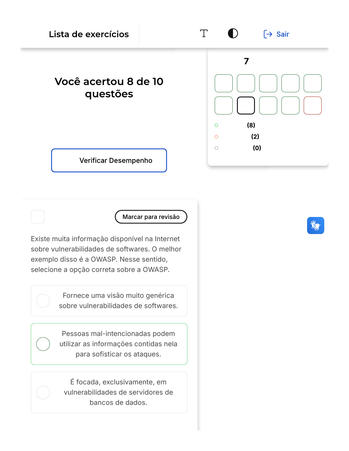 Verifique o seu desempenho e continue treinando! Você pode refazer o exercício quantas vezes quiser. A B C 1 Existe muita informação disponível na Internet sobre vulnerabilidades de softwares. O melhor exemplo disso é a OWASP. Nesse sentido, selecione a opção correta sobre a OWASP. Fornece uma visão muito genérica sobre vulnerabilidades de softwares. Pessoas mal-intencionadas podem utilizar as informações contidas nela para sofisticar os ataques. É focada, exclusivamente, em vulnerabilidades de servidores de bancos de dados. Questão de 10 Corretas Incorretas Em branco 1 2 3 4 5 6 7 8 9 10 Princípios … Firefox https://estacio.saladeavaliacoes.com.br/exercicio/68d187ce9db9a9cd72... 1 of 16 31/10/2025, 00:18 D E Apresenta o passo a passo de como identificar as principais vulnerabilidades em qualquer sistema. Só fornece informações úteis para especialistas avançados em desenvolvimento de software seguro. Parabéns, você selecionou a alternativa correta. Confira o gabarito comentado! A OWASP é o principal exemplo de uma fonte de informações disponível na Internet para quem queira acessar e aprender mais sobre vulnerabilidades de softwares. O objetivo é pedagógico, no sentido dos profissionais e estudantes aprenderem a evitar as vulnerabilidades. No entanto, essas informações também podem ser usadas por pessoas mal-intencionadas para explorar sistemas que não tem mecanismos de segurança. As demais estão erradas, pois a OWASP não é focada em apenas um tipo de aplicação e também não aborda todas as aplicações. Ela fornece informações técnicas importantes, mas funciona apenas como um guia para realizar estudos mais profundos. 2 Firefox https://estacio.saladeavaliacoes.com.br/exercicio/68d187ce9db9a9cd72... 2 of 16 31/10/2025, 00:18 A B C D E Uma boa prática para a definição de um projeto seguro é estabelecer, desde o início, as boas práticas de segurança. Infelizmente, ainda é bastante comum que muitas empresas não incentivem que os desenvolvedores de software trabalhem dessa forma. Nesse sentido, selecione a opção que contém o nome do princípio descrito no começo da questão. Segurança Inicial Diretrizes de Segurança Princípios de Segurança Static Security Security by Design Parabéns, você selecionou a alternativa correta. Confira o gabarito comentado! A Security by Design é focada na definição de atribuições de responsabilidade desde o início do projeto. Dessa forma, ela auxilia a criar um software seguro desde a concepção dele. As demais opções estão Firefox https://estacio.saladeavaliacoes.com.br/exercicio/68d187ce9db9a9cd72... 3 of 16 31/10/2025, 00:18 A B C D E erradas, pois não correspondem a princípios de segurança válidos. 3 Apesar de todos os cuidados que possamos ter com um sistema, ainda assim, estamos sujeitos a ataques. É claro que o interesse dos invasores aumenta com a importância dos dados que estamos trabalhando. Nesse sentido, selecione a opção correta que trata sobre uma forma eficiente de evitarmos que um sistema fique indisponível devido a um ataque. Utilizar apenas sistemas de empresas conhecidas Aplicar algoritmos de criptografia nos dados Utilizar versões redundantes do sistema Ter um plano conceitual de recuperação de desastres Utilizar versões do sistema de outros fornecedores Parabéns, você selecionou a alternativa correta. Confira o Firefox https://estacio.saladeavaliacoes.com.br/exercicio/68d187ce9db9a9cd72... 4 of 16 31/10/2025, 00:18 gabarito comentado! Existem diversas técnicas que podemos utilizar para evitar que um sistema fique indisponível depois de um ataque. Uma delas é utilizar versões redundantes do sistema que envolve, inclusive, questões relacionadas a infraestrutura da rede. A dificuldade de aplicar essa solução na prática é por causa dos custos envolvidos, portanto precisamos fazer um estudo de viabilidade. As demais soluções estão erradas, pois trazem soluções inadequadas para o contexto de disponibilidade como o uso dos algoritmos de criptografia, ou utilizar planos conceituais de recuperação de desastres. Ter um plano é importante, mas ele precisa ser validado na prática e ter responsáveis bem treinados, para que seja efetivo. 4 Para conseguirmos garantir que os dados sejam seguros, precisamos de um gerenciador deles que ofereça segurança. Esse gestor é o que chamamos de software seguro que pode ter diversas funcionalidades que vão do armazenamento a visualização e processamento dos dados. Neste sentido, selecione a opção correta que viabiliza desenvolvermos um código seguro. Firefox https://estacio.saladeavaliacoes.com.br/exercicio/68d187ce9db9a9cd72... 5 of 16 31/10/2025, 00:18 A B C D E Através de diversos testes antes de entregar o software para o usuário final. Com o uso de técnicas de embaralhamento de código que dificultam o entendimento deles por parte de invasores. Deixar que o próprio programa trate os erros e os exiba para o usuário final. Fazer uso de códigos obtidos em fóruns na Internet sem realizar testes. Através da aplicação de práticas de codificação segura. Parabéns, você selecionou a alternativa correta. Confira o gabarito comentado! A codificação segura aplica diversas técnicas que atuam em diferentes níveis dentro do sistema para garantir a proteção dos dados. As demais opções estão erradas, pois tratam, de forma equivocada, a codificação segura com base na terceirização das responsabilidades. Isso, infelizmente, é bastante comum e tem um potencial de danos muito alto. Firefox https://estacio.saladeavaliacoes.com.br/exercicio/68d187ce9db9a9cd72... 6 of 16 31/10/2025, 00:18 A B C D 5 Uma das técnicas úteis para garantir a confidencialidade é o uso de algoritmos de criptografia. Essencialmente, estes algoritmos fazem transformações dos dados de tal modo que apenas as pessoas autorizadas e com acesso a recursos específicos podem visualizá-los ou manipulá-los. Neste sentido, s