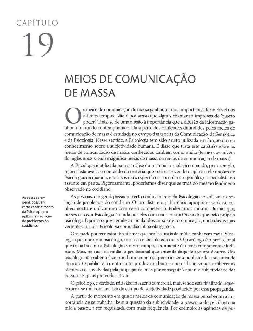 CAPÍTULO 19 MEIOS DE COMUNICAÇÃO DE MASSA S meios de comunicação de massa ganharam uma importância formidável nos últimos tempos. Não é por acaso que alguns chamam a imprensa de "quarto poder". Trata-se de uma alusão à importância que a difusão da informação ga- nhou no mundo Uma parte dos conteúdos difundidos pelos meios de comunicação de massa é estudada no campo das teorias da Comunicação, da Semiótica e da Psicologia. Nesse sentido, a Psicologia tem sido muito utilizada em função do seu conhecimento sobre a subjetividade humana. É disso que trata este capítulo sobre meios de comunicação de massa, conhecidos também como mídia (termo que advém do inglês mass media e significa meios de massa ou meios de comunicação de massa). A Psicologia é utilizada para a análise do material jornalístico quando, por exemplo, jornalista avalia conteúdo da matéria que está escrevendo e aplica a ele noções de Psicologia; ou quando, em casos mais específicos, consulta um psicólogo especialista no assunto em pauta. Rigorosamente, poderíamos dizer que se trata do mesmo fenômeno observado no cotidiano. As pessoas, em As pessoas, em geral, possuem certo conhecimento da Psicologia e aplicam na so- geral, possuem lução de problemas do cotidiano. O jornalista e o publicitário apropriam-se desse certo conhecimento nhecimento e utilizam-no com certa competência. Poderíamos mesmo afirmar que, da Psicologia e o aplicam na solução nesses casos, a Psicologia é usada por eles com mais competência do que pelo próprio de problemas do psicólogo. É por isso que a grade curricular dos cursos de comunicação, em todas as suas cotidiano. vertentes, inclui a Psicologia como disciplina obrigatória. Ora, pode parecer estranho afirmar que profissionais da mídia conhecem mais Psico- logia que o próprio psicólogo, mas isso é fácil de entender. O psicólogo é profissional que trabalha com a Psicologia e, nesse campo, certamente é mais competente e indi- cado. Mas, no caso da mídia, o profissional que entende daquele assunto é outro. Um psicólogo não saberia fazer um bom comercial por não ser a publicidade a sua área de atuação. O publicitário, entretanto, produz um bom comercial não só por conhecer as técnicas desenvolvidas pela propaganda, mas por conseguir "captar" a subjetividade das pessoas as quais pretende cativar. psicólogo, é verdade, não saberia fazer comercial, mas, sendo este finalizado, aque- le torna-se um bom analista do campo de subjetividade produzido por essa propaganda. A partir do momento em que os meios de comunicação de massa perceberam a im- portância de se trabalhar bem a questão da subjetividade, a presença do psicólogo na mídia passou a ser requisitada com mais frequência. Por exemplo: as agências de pu-MÍDIA 283 blicidade que constituem o mercado de trabalho mais desenvolvido para psicólogo especializado em mídia contratam-no para analisar qualitativamente as peças publici- tárias ainda em processo de produção. Mesmo não tendo as mesmas habilidades de um publicitário para produzir um comercial, psicólogo vem se tornando o profissional que assessora o setor de criação, ocupando cada vez mais espaços na mídia. MEIOS DE COMUNICAÇÃO E SUBJETIVIDADE os LIMITES ÉTICOS Uma questão importante e frequentemente lembrada quando se fala do uso da Psi- cologia nos meios de comunicação de massa e da participação de psicólogos nesse tra- balho refere-se à ética. Qual limite do trabalho com a subjetividade? A Psicologia e psicólogo têm poder de controlar as pessoas, de fazê-las comprar ou acreditar em algo que absolutamente não lhes interessa? Não é tarefa fácil responder à última pergunta, pois seu enunciado é em parte falso e em parte verdadeiro. Falso porque não se pode conferir tamanho poder nem à Psicologia nem aos meios de comunicação de massa, bem como é falso, também, afirmar que uma Saiba que.. mentira repetida mil vezes torna-se verdade. Essa história foi criada pelo alemão Assim, mesmo quando uma emissora de TV tem muita audiência, não é possível Goebbels, ministro que controle a informação de modo unilateral. Pesquisa realizada por Lins e Silva (Muito da Propaganda de além do Jardim Botânico: um estudo sobre a audiência do Jornal Nacional, da Globo, Adolf Hitler, na Ale- entre trabalhadores. São Paulo: Summus, 1985) demonstrou que o telespectador utiliza manha Nazista. Re- presenta escárnio mais de um critério para decodificar a mensagem e não somente o critério oferecido pela do agente de um emissora. regime autoritário O fato é que o público tem a sua forma de controlar a programação e faz pelo seletor e somente funcio- na quando há tolhi- de canais do seu controle remoto. Atualmente, há estudos sobre efeito da multiplici- mento da liberdade dade de canais oferecidos pelas TVs por assinatura (TVs digitais). As novas tecnologias de expressão. Mes- oferecem a possibilidade de centenas de opções de canais, o que diminui a força dos mo assim, o regi- me não sobreviveu, canais abertos. Há também fenômeno mercadológico da massificação da TV por as- apesar de sua ideo- sinatura, que hoje é utilizada de forma generalizada. Os estudos mencionados falam do logia manter-se vi- efeito zapping o giro que público telespectador faz pela programação e já há um va por meio de seus neologismo para designar comportamento: zapear a TV. simpatizantes. Com isso, diminui poder dos grupos que controlam a emissão televisiva em nos- país. O momento atual aponta para uma maior participação do telefone e para a programação interativa utilizando o recurso da internet. Entretanto, é preciso consi- derar que o acesso ao avanço tecnológico ocorre de forma piramidal, isto é, somente o grupo social mais favorecido e com maior poder de consumo terá acesso à tecnolo- gia de ponta, que, aos poucos, será oferecida a preços mais populares. Com isso, boa parte da p