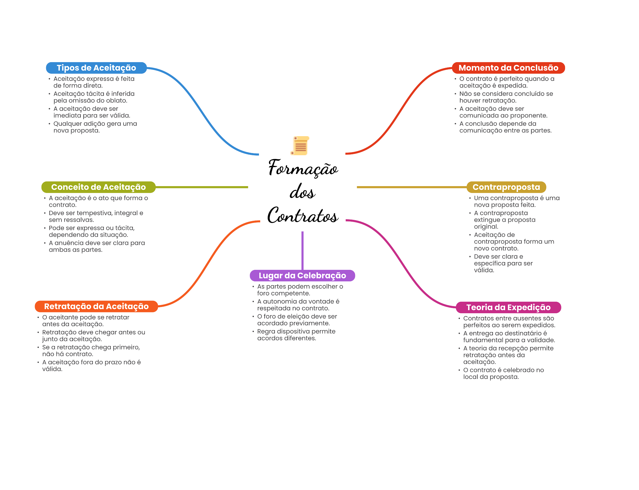 Tipos de Aceitação Momento da Conclusão expresed é contrato perfeito quando a de forma aceitação expedida. Aceitação é Não considera concluído se pela do houver retratação. A aceitação deve ser A dave ser para comunicada proponente. Qualquer adição gera uma A conclusão depende da nova proposta. comunicação entre Conceito de Aceitação Contraproposta A aceitação é o ato que forma Uma contraproposta uma contrato. nova proposta Dave ser tempestiva, integral e A contraproposta sem extingue a proposta Pode ser ou original. dependendo da Aceitação de A anuência deve ser clara para contraproposta forma um as partes. novo contrato. ser específica para ser Lugar da Celebração As partes podem escolher foro competente. A autonomia da vontade é Retratação da Aceitação no contrato. Teoria da Expedição aceitante pode foro de deve ser Contratos entre são da acordado perfeitos serem expedidos. Retratação deve chegar antes ou Regra permite A entrega é junto da acordos diferentes. fundamental para a validade. Se a retratação chega primeiro, A teoria da recepção permite não há contrato. retratação antes da A fora do prazo não contrato é celebrado no local da proposta.
