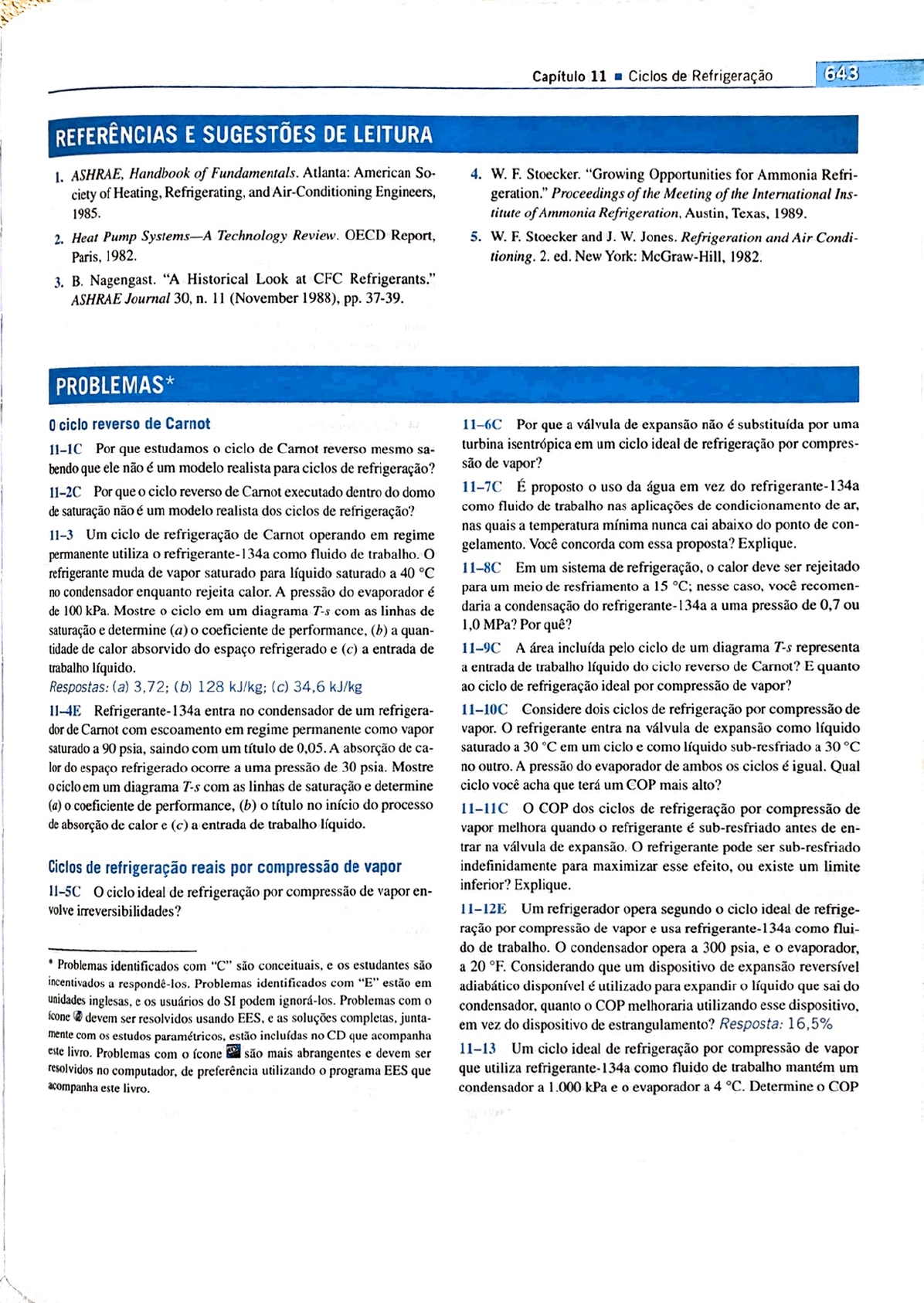 Capítulo 11 Ciclos de Refrigeração 643 REFERÊNCIAS E SUGESTÕES DE LEITURA 1. ASHRAE, Handbook of Fundamentals. Atlanta: American So- 4. W. F. Stoecker. "Growing Opportunities for Ammonia Refri- ciety of Heating, Refrigerating, and Air-Conditioning Engineers, geration." Proceedings of the Meeting of the International Ins- 1985. titute of Ammonia Refrigeration, Austin, Texas, 1989. 2. Heat Pump Systems-A Technology Review. OECD Report, 5. W. F. Stoecker and J. W. Jones. Refrigeration and Air Condi- Paris, 1982. tioning. 2. ed. New York: McGraw-Hill, 1982. 3. B. Nagengast. "A Historical Look at CFC Refrigerants." ASHRAE Journal 30, n. 11 (November 1988), pp. 37-39. PROBLEMAS* ciclo reverso de Carnot 11-6C Por que a válvula de expansão não é substituída por uma 11-1C Por que estudamos o ciclo de Carnot reverso mesmo sa- turbina isentrópica em um ciclo ideal de refrigeração por compres- bendo que ele não é um modelo realista para ciclos de refrigeração? são de vapor? 11-2C Por que o ciclo reverso de Carnot executado dentro do domo 11-7C É proposto o uso da água em vez do refrigerante-134a de saturação não é um modelo realista dos ciclos de refrigeração? como fluido de trabalho nas aplicações de condicionamento de ar, nas quais a temperatura mínima nunca cai abaixo do ponto de con- 11-3 Um ciclo de refrigeração de Carnot operando em regime gelamento. Você concorda com essa proposta? Explique. permanente utiliza o refrigerante-134a como fluido de trabalho. refrigerante muda de vapor saturado para líquido saturado a 40 °C 11-8C Em um sistema de refrigeração, o calor deve ser rejeitado no condensador enquanto rejeita calor. A pressão do evaporador é para um meio de resfriamento a 15 °C; nesse caso, você recomen- de 100 kPa. Mostre o ciclo em um diagrama T-s com as linhas de daria a condensação do refrigerante-134a a uma pressão de 0,7 ou saturação e determine (a) o coeficiente de performance, (b) a quan- 1,0 MPa? Por quê? tidade de calor absorvido do espaço refrigerado e (c) a entrada de 11-9C A área incluída pelo ciclo de um diagrama T-s representa trabalho líquido. a entrada de trabalho líquido do ciclo reverso de Carnot? E quanto Respostas: (a) 3,72; (b) 128 kJ/kg; (c) 34,6 kJ/kg ao ciclo de refrigeração ideal por compressão de vapor? 11-4E Refrigerante-134a entra no condensador de um refrigera- 11-10C Considere dois ciclos de refrigeração por compressão de dor de Carnot com escoamento em regime permanente como vapor vapor. refrigerante entra na válvula de expansão como líquido saturado a 90 psia, saindo com um título de 0,05. A absorção de ca- saturado a °C em um ciclo e como líquido sub-resfriado a °C lor do espaço refrigerado ocorre a uma pressão de 30 psia. Mostre no outro. A pressão do evaporador de ambos os ciclos é igual. Qual o ciclo em um diagrama T-s com as linhas de saturação e determine ciclo você acha que terá um COP mais alto? (a) coeficiente de performance, (b) o título no início do processo 11-11C COP dos ciclos de refrigeração por compressão de de absorção de calor e (c) a entrada de trabalho líquido. vapor melhora quando o refrigerante é sub-resfriado antes de en- trar na válvula de expansão. refrigerante pode ser sub-resfriado Ciclos de refrigeração reais por compressão de vapor indefinidamente para maximizar esse efeito, ou existe um limite 11-5C o ciclo ideal de refrigeração por compressão de vapor en- inferior? Explique. volve irreversibilidades? 11-12E Um refrigerador opera segundo o ciclo ideal de refrige- ração por compressão de vapor e usa refrigerante-134a como flui- do de trabalho. condensador opera a 300 psia, e o evaporador, Problemas identificados com "C" são conceituais, e os estudantes são a 20 °F. Considerando que um dispositivo de expansão reversível incentivados a respondê-los. Problemas identificados com "E" estão em adiabático disponível é utilizado para expandir o líquido que sai do unidades inglesas, e os usuários do SI podem ignorá-los. Problemas com o condensador, quanto o COP melhoraria utilizando esse dispositivo, icone devem ser resolvidos usando EES, e as soluções junta- em vez do dispositivo de estrangulamento? Resposta: 16,5% mente com os estudos paramétricos, estão incluídas no CD que acompanha este livro. Problemas com o ícone são mais abrangentes e devem ser 11-13 Um ciclo ideal de refrigeração por compressão de vapor resolvidos no computador, de preferência utilizando o programa EES que que utiliza refrigerante-134a como fluido de trabalho mantém um acompanha este livro. condensador a 1.000 kPa e o evaporador a 4 °C. Determine o COP644 Termodinâmica desse sistema e a potência necessária para atender uma carga de 11-18E Um refrigerador utiliza refrigerante-134a como fluido de resfriamento de 400 kW. Respostas: 6,46; 61,9 kW trabalho e opera segundo o ciclo ideal de refrigeração por compres. são de vapor. refrigerante evapora a 5 °F e condensa a 180 psia. Essa unidade atende uma carga de resfriamento de 45.000 QH Determine a vazão mássica do refrigerante e a potência que essa unidade irá exigir. 11-19E Usando o EES (ou outro programa), repita 0 Prob. 11-18E, substituindo o refrigerante-134a pela amônia. 2 11-20 Um refrigerador comercial com refrigerante-134a como fluido de trabalho é usado para manter o espaço refrigerado a 3 °C, rejeitando o calor dissipado para a água de resfriamento Condensador que entra no condensador a 18 °C a uma taxa de 0,25 kg/s, saindo Compressor a 26 °C. refrigerante entra no condensador a 1,2 MPa e Evaporador saindo a 42 °C. estado de entrada do compressor é kPa e Dispositivo de estrangulamento °C, e o compressor deve ganhar um calor líquido de 450 W da vizinhança. Determine (a) o título do refrigerante na entrada do evaporador, (b) a carga de refrigeração, (c) o COP do refrigerador 4 e (d) a carga máxima teórica de refrigeração para a mesma entrada de potência no comp
