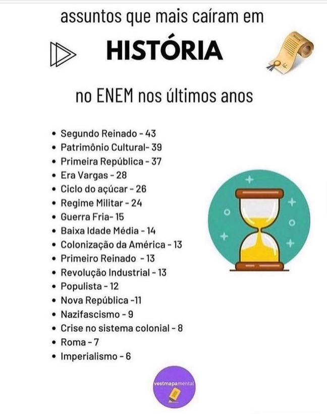 assuntos que mais caíram em HISTÓRIA no ENEM nos últimos anos Segundo Reinado - 43 Patrimônio Cultural- 39 Primeira República - 37 Era Vargas - 28 Ciclo do açúcar - 26 Regime Militar - 24 + Guerra Fria- 15 Baixa Idade Média - 14 Colonização da América - 13 Primeiro Reinado - 13 Revolução Industrial - 13 Populista - 12 Nova República -11 Nazifascismo - 9 Crise no sistema colonial - 8 Roma 7 Imperialismo - 6 vestmapamental