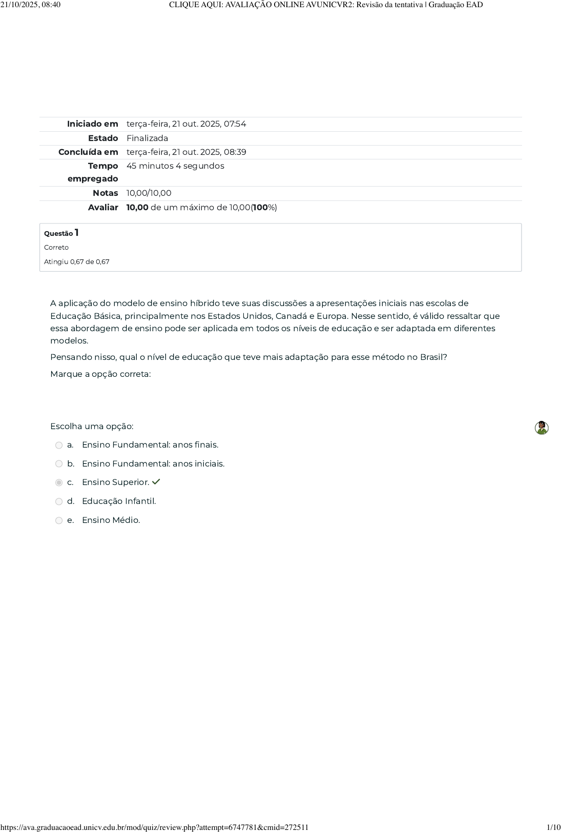 Iniciado em terça-feira, 21 out. 2025, 07:54 Estado Finalizada Concluída em terça-feira, 21 out. 2025, 08:39 Tempo empregado 45 minutos 4 segundos Notas 10,00/10,00 Avaliar 10,00 de um máximo de 10,00(100%) Questão 1 Correto Atingiu 0,67 de 0,67 A aplicação do modelo de ensino híbrido teve suas discussões a apresentações iniciais nas escolas de Educação Básica, principalmente nos Estados Unidos, Canadá e Europa. Nesse sentido, é válido ressaltar que essa abordagem de ensino pode ser aplicada em todos os níveis de educação e ser adaptada em diferentes modelos. Pensando nisso, qual o nível de educação que teve mais adaptação para esse método no Brasil? Marque a opção correta: Escolha uma opção: a. Ensino Fundamental: anos finais. b. Ensino Fundamental: anos iniciais. c. Ensino Superior. ✓ d. Educação Infantil. e. Ensino Médio. 21/10/2025, 08:40 CLIQUE AQUI: AVALIAÇÃO ONLINE AVUNICVR2: Revisão da tentativa | Graduação EAD https://ava.graduacaoead.unicv.edu.br/mod/quiz/review.php?attempt=6747781&cmid=272511 1/10 Questão 2 Correto Atingiu 0,67 de 0,67 Questão 3 Correto Atingiu 0,67 de 0,67 Leia o excerto a seguir: “Esta tecnologia, que automaticamente grava as aulas, foi originalmente criada para enriquecer o modelo de sala de aula, possibilitando que os alunos regulares de uma sala pudessem assistir às aulas expositivas quantas vezes quisessem — em outras palavras, uma forma de tarefa de casa ou revisão” (BATES, 2017, p. 157). BATES, Tony. Educar na era digital: design, ensino e aprendizagem. São Paulo: Artesanato Educacional, 2017. A que se refere o texto acima? Assinale a alternativa correta: Escolha uma opção: a. Gravação de aulas expositivas. ✓ b. Aprendizagem colaborativa online. c. Ensino em pequenos grupos. d. Ensino baseado em recursos tecnológicos e ensino individualizado. e. Cursos utilizando ambientes virtuais de aprendizagem. É válido enfatizar que um dos fatos que está cada vez mais associado com a educação no século XXI, o da era digital, é o uso da tecnologia e dos diversos recursos tecnológicos que estão ao nosso dispor. Sobre o impacto que isso gera na Educação do atual século, analise as assertivas abaixo: I – Professores e alunos não modificaram seus pensamentos e forma de agir por conta das novas tecnologias apresentadas no século XXI. II – Estamos inseridos em uma nova realidade da Educação, a qual está baseada na era da informação e da tecnologia. III – Um dos principais fatores do não uso das tecnologias de forma assertiva e efetiva no processo de ensino e aprendizagem está relacionado à falta de conhecimento sobre as mesmas. IV – Um dos grandes desafios que as instituições escolares apresenta é a falta de conhecimento relacionada aos novos modelos e metodologias de ensino aliados às novas tecnologias. É correto o que se afirma em: Escolha uma opção: a. I, II e IV, apenas. b. I, III e IV, apenas. c. Todas as afirmativas estão corretas. d. I, II e III, apenas. e. II, III e IV, apenas. ✓ 21/10/2025, 08:40 CLIQUE AQUI: AVALIAÇÃO ONLINE AVUNICVR2: Revisão da tentativa | Graduação EAD https://ava.graduacaoead.unicv.edu.br/mod/quiz/review.php?attempt=6747781&cmid=272511 2/10 Questão 4 Correto Atingiu 0,67 de 0,67 Brito e Purificação (2015, p. 22) enfatizam que os grupos sociais vão criando novas formas de transmitir “[...] conhecimentos, valores, regras, normas e procedimentos, com o intuito de garantir o convívio entre homens e difundir a cultura de cada sociedade, o que ocorre por meio da educação”. BRITO, Glaucia Silva; PURIFICAÇÃO, Ivonélia da. Educação e novas tecnologias: um (re) pensar. 2 ed. Curitiba: InterSaberes, 2015. Mediante à educação e à tecnologia, analise as assertivas abaixo: I – Ninguém escapa da educação, pois a mesma está relacionada ao cotidiano das pessoas, como no ato de aprender, de ensinar, de aprender e ensinar, de saber, de fazer ou conviver. II – A educação, em conjunto com a tecnologia, é entendida como uma maneira de proporcionar aos indivíduos uma construção de seu conhecimento de forma atualizada, para que, assim as pessoas estejam preparadas para criar recursos tecnológicos. III – Vida e educação são coisas distintas e não estão relacionadas em nosso cotidiano. IV – As pessoas precisam saber utilizar e desenvolver os recursos tecnológicos, a fim de sempre compreender a sua importância e mudanças constantes. É correto o que se afirma em: Escolha uma opção: a. II, III e IV, apenas. b. I e III, apenas. c. I, II e IV, apenas. ✓ d. I, III e IV, apenas. e. I, II e III, apenas. 21/10/2025, 08:40 CLIQUE AQUI: AVALIAÇÃO ONLINE AVUNICVR2: Revisão da tentativa | Graduação EAD https://ava.graduacaoead.unicv.edu.br/mod/quiz/review.php?attempt=6747781&cmid=272511 3/10 Questão 5 Correto Atingiu 0,67 de 0,67 Questão 6 Correto Atingiu 0,67 de 0,67 É importante enfatizar que no Tecnopólio a tecnologia passa cada vez mais fazer parte de nossas vidas e instituições, e por conta disso, quando menos percebemos estamos ministrando assuntos e conteúdos sem motivos aparentes, simplesmente pelo fato de que o processo que deve acontecer é dessa forma, dando origem à diversos questionamentos. Sobre o tecnopólio, analise as asserções abaixo: I – A tecnologia passou a ser compreendida como o processo soberano do conhecimento. II – A sociedade em geral passou a ser compreendida como rendida e serva do soberano que está relacionado com a tecnologia. III – O tecnopólio passou a ser discutido como sendo um estado de cultura que envolve as crenças gerais da sociedade e define o seu rumo de acordo com o desenvolvimento e progresso da mesma, não tendo seus dogmas próprios. IV – Devido ser entendido como um estado de cultura, o tecnopólio se tornou o principal reconhecimento social do indivíduo, onde o mesmo passou a encontrar o sentido de suas ações por meio da tecnologia. É correto o que se