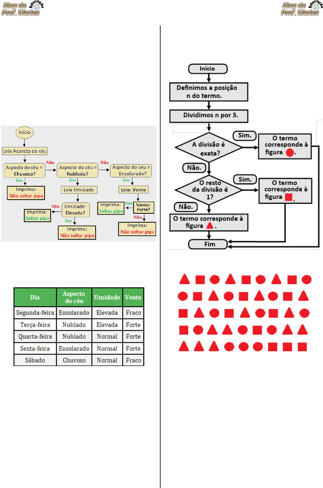 • (EM13MAT315). Investigar e registrar, por meio de um fluxograma, quando possível, um algoritmo que resolve um problema. -------------------------------------------------------------------------------------------------------------------------------------------------- ================================= (MEC-CAED - ADF). Dois amigos estruturaram um algoritmo para decidir se eles soltariam ou não pipa, em função das condições climáticas do dia. Nesse algoritmo, eles consideraram certos parâmetros climáticos do dia que são o “aspecto do céu”, a “umidade” e o “vento”. Cada um desses parâmetros tem suas gradações e indicam decisões de acordo com suas classificações. Observe abaixo o fluxograma desse algoritmo criado por esses dois amigos. Na semana passada esses amigos tinham, ambos, disponibilidade para soltar pipa na segunda-feira, na terça-feira, na quarta-feira, na sexta-feira e no sábado. Observe abaixo as classificações dos parâmetros climáticos desses 5 dias. De acordo com o algoritmo elaborado por esses dois amigos, em quais desses dias eles soltaram pipa? A) Quarta-feira e sexta-feira. B) Quarta-feira, sexta-feira e sábado. C) Segunda-feira e sexta-feira. D) Terça-feira e sexta-feira. E) Todos os dias. ================================= (BPW). Pedrinho elaborou um fluxograma para obter os termos (n = 3, 4, 5, 6, ...) de uma sequência de figuras. Observe esse fluxograma a seguir: Qual das sequências de figuras pode ser determinada por esse fluxograma? A) , , , , , , , , ,... B) , , , , , ,, , , ... C) , , , , , ,, , , ... D) , ,,, , , , ,, ... E) ,,. , , , , , , ... ================================= (BPW). Jotinha elaborou um fluxograma para os termos de uma sequência numérica. Observe esse fluxograma a seguir: Qual das sequências de números pode ser determinada por esse fluxograma? A) 0, – 3, – 8, – 15, – 24, – 35. B) 0, 1, 4, 9, 16, 25. C) 1, 0, – 1, – 2, – 3, – 4. D) 0, – 1, – 2, – 3, – 4, – 5. E) – 1, – 4, – 9, – 16, – 25, – 36. ================================= (BPW). Observe o fluxograma a seguir: Com base nisso, assinale a alternativa que melhor representa a execução correta desse algoritmo. A) O algoritmo divide o número por 2 e, se o quociente for zero, o número é par. B) O algoritmo verifica se o número é divisível por 2, e caso o resto seja zero, o número é par; caso contrário, é ímpar. C) O algoritmo multiplica o número por 2 para verificar se ele é par. D) O algoritmo compara o número diretamente com o valor 2 para decidir se é par ou ímpar. E) O algoritmo considera que todos os números diferentes de zero são ímpares. ================================= (BPW). Observe o fluxograma a seguir: Com base nesse algoritmo, assinale a alternativa que melhor descreve o objetivo principal do procedimento apresentado. A) Determinar automaticamente a resposta correta de qualquer problema matemático. B) Criar um programa que resolva problemas sem a necessidade de interpretação humana. C) Representar o raciocínio lógico usado para resolver um problema, desde a leitura até a verificação da resposta. D) Ensinar a realizar cálculos numéricos por meio de operações sucessivas e repetitivas. E) Mostrar apenas o passo de execução da estratégia matemática escolhida. ================================= (BPW). Observe o fluxograma a seguir: Com base no algoritmo, analise as situações a seguir e marque a alternativa correta sobre o valor a ser pago: A) Um veículo que permaneceu 8 minutos no estacionamento pagará R$ 5,00. B) Um veículo que permaneceu 1 hora e 45 minutos pagará R$ 5,00. C) Um veículo que permaneceu 2 horas e 30 minutos pagará R$ 5,00. D) Um veículo que permaneceu 3 horas e 10 minutos pagará R$ 7,00. E) Um veículo que permaneceu 9 minutos pagará R$ 1,00. ================================= (BPW). Observe o fluxograma a seguir: Com base nesse algoritmo, analise as situações e marque a alternativa correta. A) Um quadrilátero com apenas um par de lados paralelos é identificado como paralelogramo. B) Um quadrilátero com dois pares de lados paralelos e ângulos de 90° é identificado como losango. C) Um quadrilátero com dois pares de lados paralelos, lados iguais e ângulos de 90° é identificado como quadrado. D) Um quadrilátero sem lados paralelos é identificado como retângulo. E) Um quadrilátero com lados iguais e sem ângulos de 90° é identificado como trapézio. ================================= (BPW). Observe o fluxograma a seguir: Esse algoritmo realiza uma sequência de operações e associa o resultado a uma letra e a um país. Com base nesse processo, assinale a alternativa correta. A) O algoritmo serve para descobrir o nome de um país a partir de um número qualquer, mas o resultado final sempre será aleatório. B) Independentemente do número escolhido, após somar os algarismos repetidamente, o resultado final sempre será 9, levando à letra I do alfabeto. C) O algoritmo é usado para testar se um número é divisível por 9, mas não envolve letras nem países. D) O algoritmo só funciona se o número inicial for menor que 9. E) O algoritmo apresenta resultados diferentes para cada número natural escolhido. ================================= (BPW). Observe o fluxograma a seguir: Com base nesse algoritmo, assinale a alternativa que melhor descreve sua função. A) O algoritmo trata de escolher entre ligar ou não o rádio. B) O algoritmo descreve como desligar o rádio quando a estação não for adequada. C) O algoritmo mostra um procedimento aleatório que não depende de decisão. D) O algoritmo representa um processo repetitivo de ajuste de estação até encontrar uma que agrade o ouvinte. E) O algoritmo serve apenas para verificar se o rádio está funcionando corretamente. ================================= (BPW). Observe o fluxograma a seguir: Um processo de Aprovação de Solicitações de Crédito Bancário foi representado u