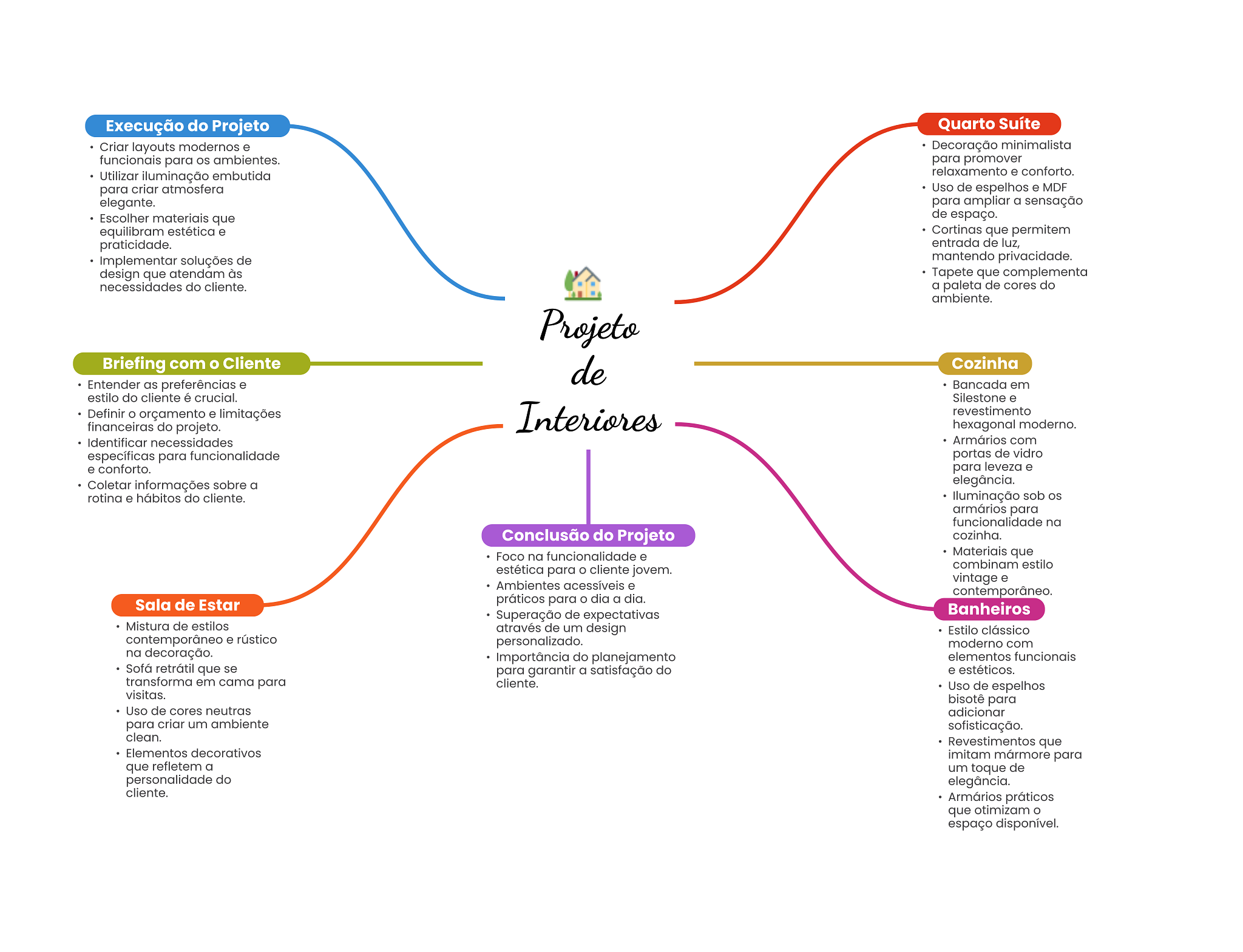 Execução do Projeto Quarto Suíte Criar layouts modernos e Decoração minimalista funcionais para os ambientes. para promover Utilizar iluminação embutida relaxamento e conforto. para criar atmosfera Uso de espelhos e MDF elegante. para ampliar a sensação Escolher materiais que de espaço. equilibram estética e Cortinas que permitem praticidade. entrada de luz, Implementar soluções de mantendo privacidade. design que atendam às Tapete que complementa necessidades do cliente. a paleta de cores do ambiente. Projeto Briefing com Cliente de Cozinha Entender as preferências e Bancada em estilo do cliente é crucial. Silestone e Definir O orçamento e limitações Interiores revestimento financeiras do projeto. hexagonal moderno. Identificar necessidades Armários com específicas para funcionalidade portas de vidro e conforto. para leveza e Coletar informações sobre a elegância. rotina e hábitos do cliente. sob armários para na Conclusão do Projeto cozinha. Foco na funcionalidade e Materiais que estética para o cliente jovem. combinam estilo vintage e Ambientes acessíveis e contemporâneo. Sala de Estar práticos para dia a dia. Superação de expectativas Banheiros Mistura de estilos através de um design Estilo clássico contemporâneo e rústico personalizado. moderno com na decoração. Importância do planejamento elementos funcionais Sofá retrátil que se para garantir a satisfação do e estéticos. transforma em cama para cliente. Uso de espelhos visitas. bisotê para Uso de cores neutras adicionar para criar um ambiente sofisticação. clean. Revestimentos que Elementos decorativos imitam mármore para que refletem a um toque de personalidade do elegância. cliente. Armários práticos que otimizam espaço disponível.