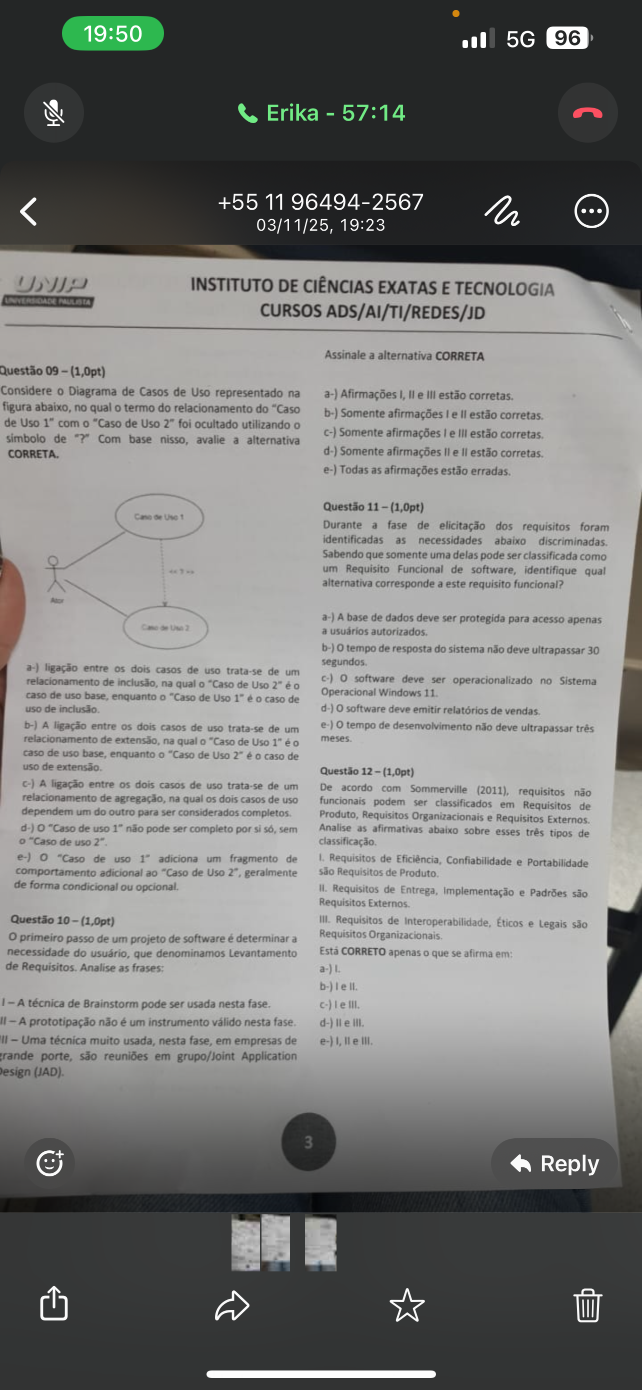 19:50 5G 96 Erika 57:14 +55 11 96494-2567 03/11/25, 19:23 UNIP INSTITUTO DE CIÊNCIAS EXATAS E TECNOLOGIA UNIVERSIDADE PAULISTA CURSOS ADS/AI/TI/REDES/JD Assinale a alternativa CORRETA Questão 09 (1,Opt) Considere 0 Diagrama de Casos de Uso representado na a-) Afirmações I, e III estão corretas. figura abaixo, no qual 0 termo do relacionamento do "Caso b-) Somente afirmações le estão corretas. de Uso 1" com 0 "Caso de Uso 2" foi ocultado utilizando simbolo de "?" Com base nisso, avalie a alternativa c-) Somente afirmações le III estão corretas. CORRETA. d-) Somente afirmações e estão corretas. e-) Todas as afirmações estão erradas. Questão 11 (1,Opt) Caso de Use Durante a fase de elicitação dos requisitos foram identificadas as necessidades abaixo discriminadas. Sabendo que somente uma delas pode ser classificada como um Requisito Funcional de software, identifique qual alternativa corresponde a este requisito funcional? a-) A base de dados deve ser protegida para acesso apenas de Use 2 a usuários autorizados. b-) tempo de resposta do sistema não deve ultrapassar 30 segundos. a-) ligação entre os dois casos de uso trata-se de um relacionamento de inclusão, na qual "Caso de Uso 2" é 0 c-) software deve ser operacionalizado no Sistema caso de uso base, enquanto "Caso de Uso 1" é caso de Operacional Windows 11. uso de software deve emitir relatórios de vendas. b-) A ligação entre os dois casos de uso trata-se de um o tempo de desenvolvimento não deve ultrapassar três relacionamento de extensão, na qual "Caso de Uso 1" é caso de uso base, enquanto "Caso de Uso 2" é caso de uso de extensão. Questão 12 (1,Opt) c-) A ligação entre os dois casos de uso trata-se de um De acordo com Sommerville (2011), requisitos não relacionamento de agregação, na qual os dois casos de uso funcionais podem ser classificados em Requisitos de dependem um do outro para ser considerados completos. Produto, Requisitos Organizacionais e Requisitos Externos. d-) "Caso de uso 1" não pode ser completo por si só, sem Analise as afirmativas abaixo sobre esses três tipos de "Caso de uso 2". classificação. e-) o "Caso de uso 1" adiciona um fragmento de Requisitos de Eficiência, Confiabilidade e Portabilidade comportamento adicional ao "Caso de Uso 2", geralmente são Requisitos de de forma condicional ou opcional. IL Requisitos de Entrega, Implementação e Padrões são Requisitos Externos. Questão 10 (1,Opt) III. Requisitos de Interoperabilidade, Éticos e Legais são primeiro passo de um projeto de software determinar a Requisitos Organizacionais. necessidade do usuário, que denominamos Levantamento Está CORRETO apenas que se afirma em: de Requisitos. Analise as frases: b-) A técnica de Brainstorm pode ser usada nesta fase. III. A prototipação não é um instrumento válido nesta fase. d-) Uma técnica muito usada, nesta fase, em empresas de e-) III. porte, são reuniões em grupo/Joint Application (JAD). 3 Reply