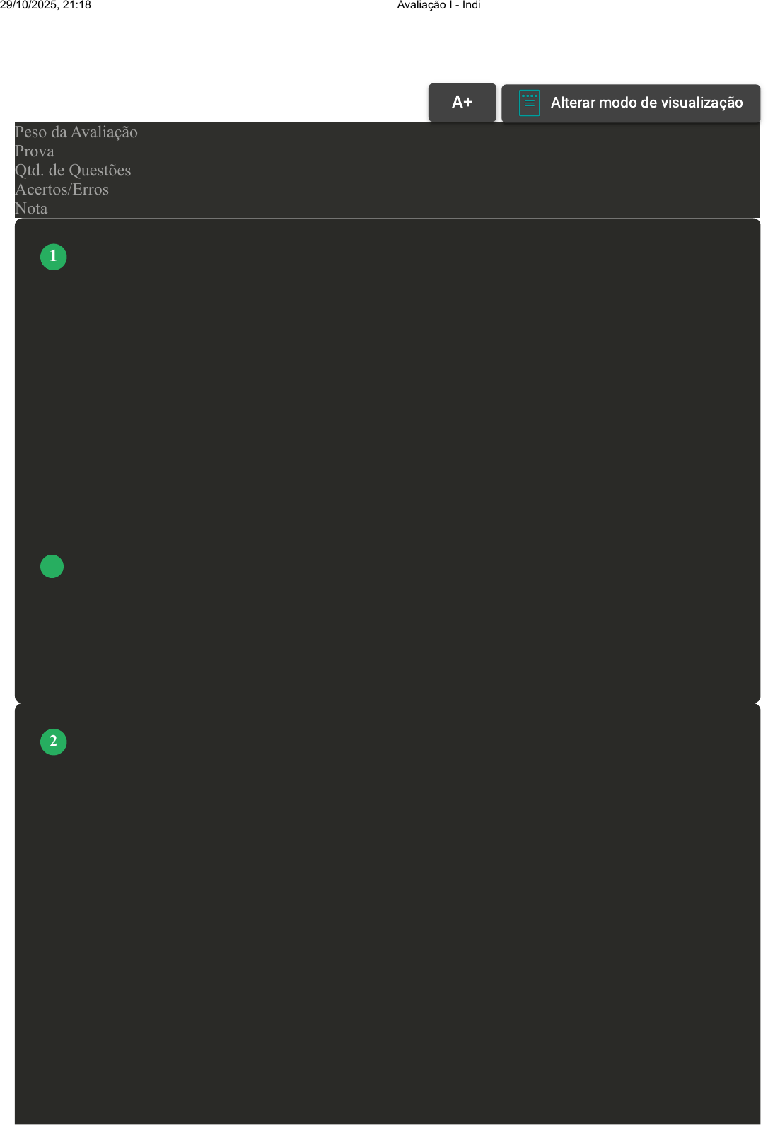 Prova Impressa GABARITO | Avaliação I - Individual (Cod.:1522024) Peso da Avaliação 2,00 Prova 108329971 Qtd. de Questões 10 Acertos/Erros 10/0 Nota 10,00 O método de Rousseau serviu de inspiração para Pestalozzi e outros métodos universais pedagógicos. No contexto de sua época, formulou princípios educacionais que permanecem até nossos dias, principalmente quando afirmava que a verdadeira finalidade da educação era ensinar a criança a viver e aprender a exercer a liberdade. Assim, Jean-Jacques Rousseau, um dos expoentes teóricos para a pedagogia contemporânea, propôs alguns modelos educativos para formação do homem. Sobre esses princípios, analise as sentenças a seguir: I- Defende a ideia da infância como idade autônoma e dotada de características específicas. II- Defende a ideia da infância com várias fases de desenvolvimento, sobretudo no aspecto cognitivo. III- Defende a ideia do jovem como uma pessoa incompleta. IV- Defende a idade da "Educação pela Instrução". Assinale a alternativa CORRETA: A As sentenças I, II e III estão corretas. B As sentenças I e II estão corretas. C Somente a sentença IV está correta. D As sentenças III e IV estão corretas. Na perspectiva do pensamento pedagógico moderno, vários pensadores se destacaram, dentre eles, Johann Friedrich Herbart. O filósofo alemão nasceu em Oldenburg, na Alemanha, em 1776, conheceu alguns dos mais importantes intelectuais da época e assim como Pestalozzi. Herbart tomou a intuição como ponto de partida no ensino. Sobre o pensamento pedagógico de Herbart, analise as sentenças a seguir: I- Herbart parte do princípio de que a alma é uma tábula rasa que precisa ser preenchida com experiências sucessivas. II- Herbet entendia que a criança deve tornar-se adaptável, mas sempre mantendo a sua individual capacidade criadora, a sua curiosidade e iniciativa. III- Herbart propõe um método sistematizado de instrução com cinco passos formais. IV- Herbart estabeleceu os passos formais da aprendizagem que se resumem na apresentação, situação problema, associação, sistematização e validação, os quais foram, posteriormente, reformulados por sua discípula Maria Montessori. Assinale a alternativa CORRETA: A Somente a sentença IV está correta. B As sentenças III e IV estão corretas. VOLTAR A+ Alterar modo de visualização 1 2 29/10/2025, 21:18 Avaliação I - Individual about:blank 1/6 C As sentenças I, II e III estão corretas. D As sentenças I e IV estão corretas. Discípulo de Rousseau, Pestalozzi foi um dos primeiros a pensar na libertação do povo através da educação e da agricultura. Pestalozzi dedicou seus esforços, tempo, recursos financeiros e sua própria família à vivência de suas ideias pedagógicas. Fundou orfanatos e educou meninos e meninas pobres e abandonados, procurando formar o caráter de cada um. Mais do que ensinar a ler, escrever e transmitir outros conteúdos considerados relevantes para a formação intelectual, Pestalozzi interessava-se pela formação integral, pela construção da personalidade individual da criança. Sobre os pressupostos de Pestalozzi, analise as sentenças a seguir: I- Heinrich Pestalozzi foi um dos defensores da ideia de que a aprendizagem profissional deve centrar-se nas habilidades tecnológicas, por meio da realização de atividades de memorização. II- Heinrich Pestalozzi foi um dos defensores do materialismo histórico, a escola é o centro irradiador do processo revolucionário, pois tem a responsabilidade de encaminhar a superação efetiva dos modos de produção na sua totalidade. III- Heinrich Pestalozzi não confiava em julgamento externo, por isso, em suas escolas não havia notas ou avaliações, punições ou recompensas. Assinale a alternativa CORRETA: A Somente a sentença III está correta. B As sentenças I e II estão corretas. C Somente a sentença I está correta. D As sentenças II e III estão corretas. A utilização dos computadores e da internet em sala de aula é uma realidade cada vez mais frequente. Os computadores e sua utilização devem estar presentes no ensino, destacando que o uso do computador como recurso pedagógico favorece valores culturais, sociopolíticos, pedagógicos e tecnológicos da sociedade brasileira. Com relação ao processo instrucionista, sobre a finalidade do computador no ensino, analise as seguintes opções: I- Instrução de programação e aplicação de projetos-piloto. II- Fixação de conceitos e transmissão de informação. III- Capacitação e formação de recursos humanos. IV- Profissionalização e utilização de redes sociais. Assinale a alternativa CORRETA: A As opções I e II estão corretas. B As opções I e III estão corretas. C As opções III e IV estão corretas. D Somente a opção II está correta. 3 4 29/10/2025, 21:18 Avaliação I - Individual about:blank 2/6 A Didática Magna tem como proposição mostrar a arte de ensinar tudo a todos, a pansofia de maneira certa e eficiente em todos os lugares, para toda a juventude, sem discriminação de sexo ou classe social, compreendendo a educação de forma global. A didática surgiu no século XVII, com o objetivo de orientar os educadores para que pudessem formar as novas gerações, é importante saber que a palavra didática tem a sua origem no verbo grego "didasko". Sobre o significado da palavra didática, assinale a alternativa CORRETA: A O significado da palavra didática refere-se aos métodos de cada matéria, visualizada como um conjunto de receitas prontas de como e o que ensinar. B O significado da palavra didática refere-se à arte de ensinar, compreendida em seu caráter prático de apoio à concretização do trabalho docente. C O significado da palavra didática refere-se à busca mais adequada das formas de atualização pedagógica e cultural. D O significado da palavra didática refere-se aos conhecimentos sistematizados, compreendida em seu caráter teórico de apoi