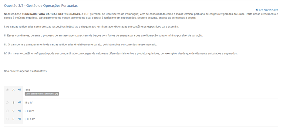 Questão 3/5 Gestão de Operações Portuárias Ler em alta No texto-base TERMINAIS PARA CARGAS REFRIGERADAS, TCP (Terminal de de Paranagua) vem se consolidando como 0 maior terminal portuário de cargas refrigeradas do Brasil Parte desse crescimento é devido a indústria particularmente de frango, alimento no qual 0 Brasil e fortissimo em Sobre 0 analise as afirmativas a As cargas refrigeradas saem de suas respectivas indústrias e chegam aos terminais acondicionadas em especificos para esse Esses durante 0 processo de precisam de berços com fontes de energia para que a refrigeração sofra 0 minimo possivel de III. O transporte e armazenamento de cargas refrigeradas e relativamente pois muitos concorrentes nesse IV. Um mesmo conteiner refrigerado pode ser com cargas de naturezas diferentes (alimentos e produtos por desde que devidamente embalados e corretas apenas as A Você essa B III IV C IV D III IV