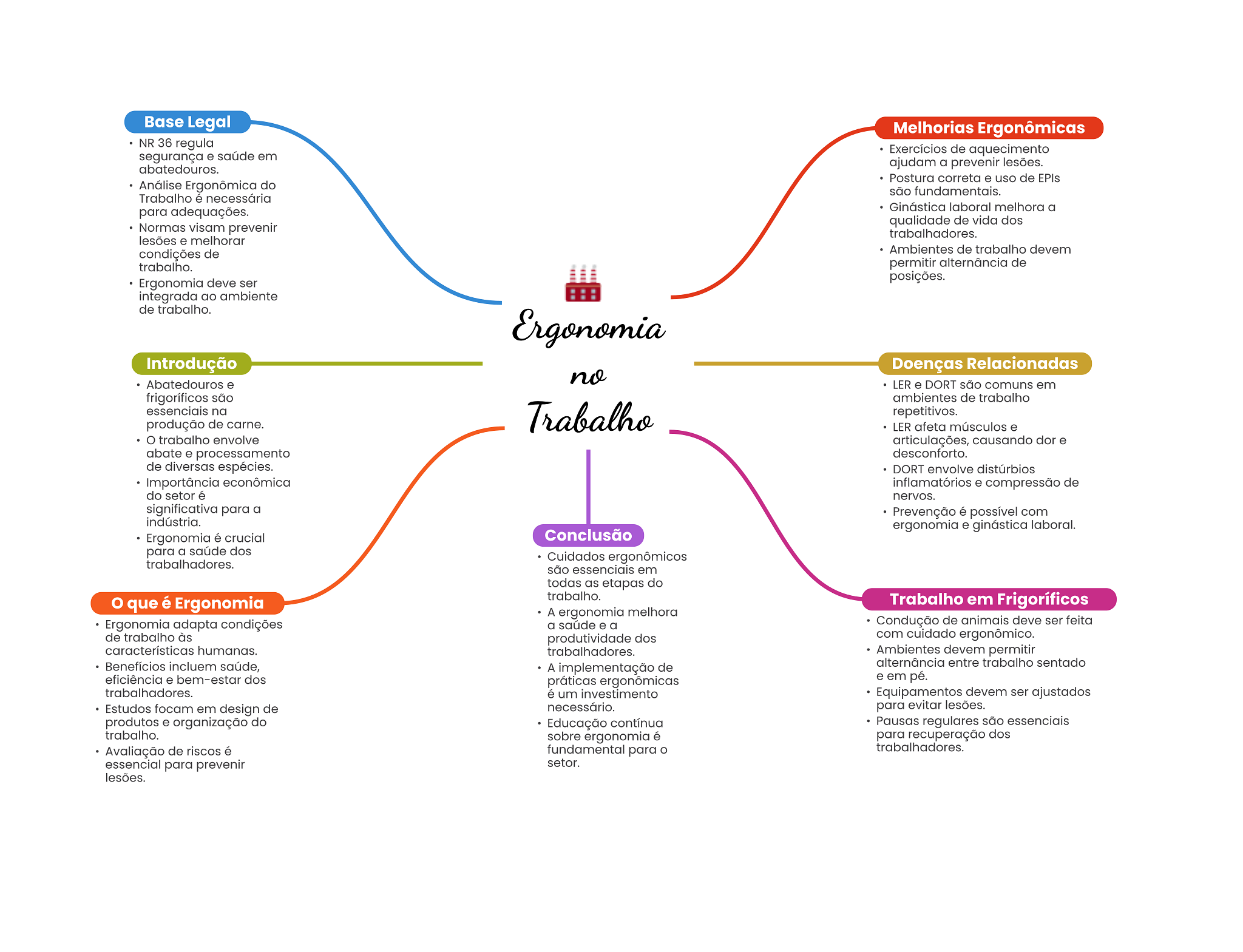 Base Legal Melhorias Ergonômicas NR 36 regula Exercícios de aquecimento segurança e saúde em abatedouros. ajudam a prevenir lesões. Postura correta e uso de EPIs Análise Ergonômica do são fundamentais. Trabalho é necessária para adequações. Ginástica laboral melhora a qualidade de vida dos Normas visam prevenir trabalhadores. lesões e melhorar condições de Ambientes de trabalho devem trabalho. permitir alternância de posições. Ergonomia deve ser integrada ao ambiente de trabalho. Ergonomia Introdução Doenças Relacionadas no Abatedouros e LER e DORT são comuns em frigoríficos são ambientes de trabalho essenciais na produção de carne. Trabalho repetitivos. LER afeta músculos e trabalho envolve articulações, causando dor e abate e processamento desconforto. de diversas espécies. DORT envolve distúrbios Importância econômica inflamatórios e compressão de do setor é nervos. significativa para a Prevenção é possível com indústria. ergonomia e ginástica laboral. Ergonomia é crucial Conclusão para a saúde dos Cuidados ergonômicos trabalhadores. são essenciais em todas as etapas do trabalho. que é Ergonomia Trabalho em Frigoríficos A ergonomia melhora Ergonomia adapta condições a saúde e a Condução de animais deve ser feita de trabalho às produtividade dos com cuidado ergonômico. características humanas. trabalhadores. Ambientes devem permitir Benefícios incluem saúde, A implementação de alternância entre trabalho sentado eficiência e bem-estar dos práticas ergonômicas e em pé. trabalhadores. é um investimento Equipamentos devem ser ajustados Estudos focam em design de necessário. para evitar lesões. produtos e organização do Educação contínua Pausas regulares são essenciais trabalho. sobre ergonomia é para recuperação dos Avaliação de riscos é fundamental para trabalhadores. essencial para prevenir setor. lesões.