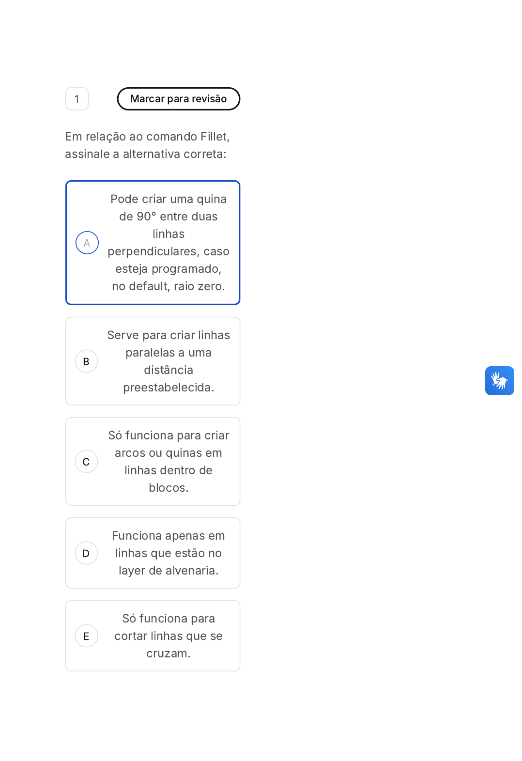 A B C D E 1 Marcar para revisão Em relação ao comando Fillet, assinale a alternativa correta: Pode criar uma quina de 90° entre duas linhas perpendiculares, caso esteja programado, no default, raio zero. Serve para criar linhas paralelas a uma distância preestabelecida. Só funciona para criar arcos ou quinas em linhas dentro de blocos. Funciona apenas em linhas que estão no layer de alvenaria. Só funciona para cortar linhas que se cruzam. A B C D E 2 Marcar para revisão Em relação ao AutoCAD, assinale a alternativa incorreta: Para fazer o projeto de uma planta baixa, os comandos Line, Offset e Trim são os mais usados. Tentar desenhar os cômodos de forma isolada, um a um, é mais demorado e pode gerar mais imprecisões. O ideal na hora de inserir um bloco é já deixar o layer correspondente acionado para, depois, não precisar corrigir os elementos em layers errados. É muito mais prático desenhar todas as esquadrias que inserir seus respectivos blocos. É importante colocar um texto com o nome dos ambientes para humanizar a planta. A B C D E 3 Marcar para revisão A norma que contém alguns símbolos essenciais para representação gráfica arquitetônica é: NBR 8404 NBR 6023 NBR 8196 NBR 6492 NBR 10582 4 Marcar para revisão (FCC / TRT – 11a Região (AM e RR) / Analista Judiciário – Arquitetura – 2012) Finalizado o desenho em AutoCAD, para exportar o projeto em PDF, deve-se clicar em: A B C impressão > Plotar > impressora / Plotadora > PDF > tamanho do papel > o que Plotar> janela > seleciona desenho > visualizar > ok > salvar em > nomear > salvar. impressão > Plotar > impressora / Plotadora / publishto web PDF > tamanho do papel > o que Plotar> janela > seleciona desenho > visualizar > ok > imprimir > ok. menu > enviar > transmissão eletrônica > criar transmissão > selecionar arquivo > ok > salvar em > nomear > salvar. 00 hora : 35 min : 32 seg Ocultar Questão 10 de 10 1 2 3 4 5 6 7 8 9 10 SM2 Projeto Assistido Por Computador D E impressão > Plotar > impressora / Plotadora > PDF > tamanho do papel > o que Plotar> janela > seleciona desenho > visualizar > ok > imprimir > ok. salvar como > outros formatos > arquivos tipos > nomear > salvar. 5 Marcar para revisão No AutoCAD, o comando Copy é utilizado para duplicar objetos dentro do desenho sem alterar suas propriedades. Com base nesse contexto, analise as afirmações a seguir e assinale a alternativa que corresponde corretamente ao funcionamento do comando Copy. Respondidas (10) Em branco (0) Finalizar prova A B C D E Podemos copiar um desenho de um arquivo e, utilizando [Ctrl + Shift + C] [Ctrl + V], colar em outro. O comando Copy permite copiar objetos apenas uma vez, exigindo que o usuário reinicie o comando para cada nova cópia. O comando Copy exige que os objetos copiados sejam convertidos em Blocos antes de serem duplicados. O comando Copy não permite definir um ponto base para a cópia, sendo a duplicação feita automaticamente. Para copiar objetos, o AutoCAD exige que seja utilizada exclusivamente a entrada de coordenadas, não sendo possível mover a cópia com o mouse. A B 6 Marcar para revisão No AutoCAD, o uso de coordenadas é essencial para desenhar com precisão. Existem diferentes tipos de coordenadas, como absolutas, relativas e polares, que podem ser inseridas por meio de comandos específicos. Além disso, ferramentas como o Dynamic Input ajudam a visualizar e inserir essas coordenadas diretamente na área de desenho. Com base nessas informações, assinale a alternativa correta. O uso do símbolo @ é utilizado para coordenadas relativas, o que é comum em softwares de desenho técnico como o AutoCAD. Ao dar o comando Line, clicar em um ponto na tela, e digitar @150