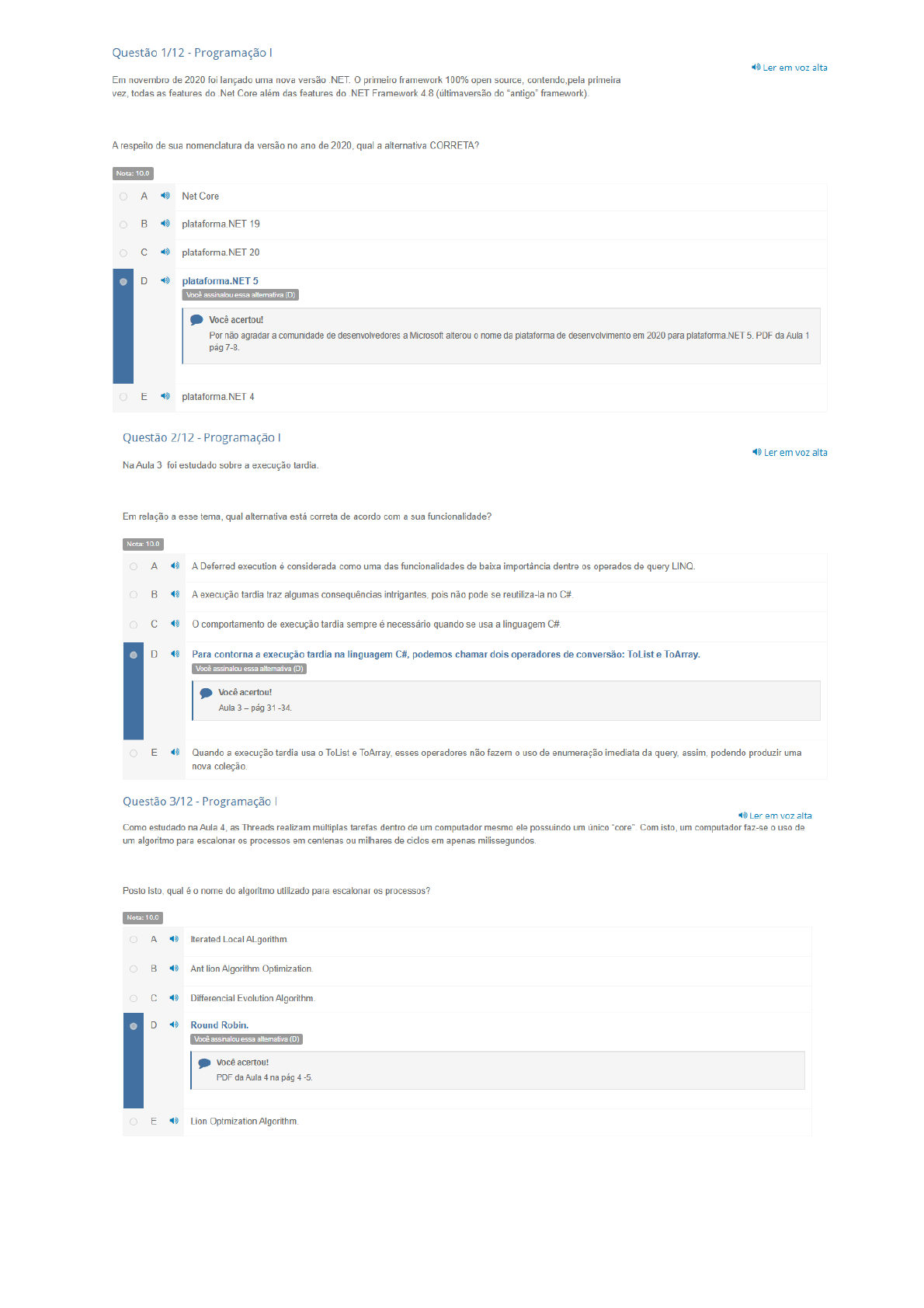 Questão 1/12 Programação Ler em alta Em novembro de 2020 foi lançado uma nova versão primeiro framework 100% open source, contendo,pela primeira vez, todas as features do Net Core além das features do NET Framework 4.8 (últimaversão do "antigo" framework). A respeito de sua nomenclatura da versão no ano de 2020, qual a alternativa CORRETA? Nota: 10.0 A Net Core NET 19 plataforma.NET 20 D plataforma.NET 5 Você assinalou essa alternativa (D) Você acertou! Por não agradar a comunidade de desenvolvedores a Microsoft alterou 0 nome da plataforma de desenvolvimento em 2020 para plataforma NET 5. PDF da Aula 1 pág 7-8. E plataforma.NET 4 Questão 2/12 Programação Ler em voz alta Na Aula 3 foi estudado sobre a execução tardia. Em relação a esse tema, qual alternativa está correta de acordo com a sua funcionalidade? Nota: 10.0 A A Deferred execution é considerada como uma das funcionalidades de baixa importância dentre os operados de query A execução tardia traz algumas consequências intrigantes, pois não pode se reutiliza-la no C#. comportamento de execução tardia sempre é necessário quando se usa a linguagem C#. D Para contorna a execução tardia na linguagem C#, podemos chamar dois operadores de conversão: ToList e ToArray. Você assinalou essa alternativa (D) Você acertou! Aula 3 pág 31 -34. E Quando a execução tardia usa 0 ToList e ToArray, esses operadores não fazem 0 uso de enumeração imediata da query, assim, podendo produzir uma nova coleção. Questão 3/12 Programação Ler em voz alta Como estudado na Aula 4, as Threads realizam múltiplas tarefas dentro de um computador mesmo ele possuindo um único "core". Com isto, um computador faz-se 0 uso de um algoritmo para escalonar os processos em centenas ou milhares de ciclos em apenas milissegundos. Posto isto, qual é 0 nome do algoritmo utilizado para escalonar processos? Nota: 10.0 A Iterated Local ALgorithm. Ant lion Algorithm Optimization. Differencial Evolution Algorithm. D Round Robin. Você assinalou essa alternativa (D) Você acertou! PDF da Aula 4 na pág E Lion Optmization Algorithm.Questão 4/12 Programação Ler em voz alta Como visto na Aula 6, 0 Web services e Web APIs são aplicações web de serviços para fornecer resultados e funcionalidade dentro da web. Posto isto, assinale a alternativa correta sobre 0 Web services e Web APIs. Nota: 10.0 A Os Web Services são sistemas de informação, utilizam um conjunto de tecnologias que são padrões da internet e Web APIs são menos restritivos, utilizam protocolo HTTP e podem receber e retornar dados em diferentes formatos Você assinalou essa alternativa (A) Você acertou! PDF da Aula 6 Web services pág 6-7; e PDF da Aula 6 Web APIs pág 18-19 Os Web Services são menos restritivos, utilizam protocolo HTTP e podem receber e retornar dados em diferentes formatos e Web APIs são sistemas de informação, utilizam um conjunto de tecnologias que são padrões da internet Os Web Services são menos restritivos, utilizam protocolo POP3 e podem receber e retornar dados em diferentes formatos e Web APIs são sistemas de informação, utilizam um conjunto de tecnologias que são padrões da internet. D Os Web Services são sistemas de informação, utilizam um conjunto de tecnologias que são padrões da internet e Web APIs são menos restritivos, utilizam protocolo POP3 e podem receber e retornar dados em diferentes formatos E ) Os Web Services são sistemas de informação, utilizam um conjunto de tecnologias que são padrões da internet e os Web APIs são menos restritivos, utilizam protocolo HTTP e não podem receber e retornar dados em diferentes formatos. Questão 5/12 Programação De acordo com a Aula 2, os generics são como templates (ou modelos) que podem ser reutilizáveis na programação utilizando a linguagem C#. Assinale a única alternativa CORRETA que apresente um exemplo de semântica generics. Nota: 0.0 Você não pontuou essa questão A Public class CustomStack =T uso da classe generics é conhecida pela semântica Public class CustomStack PDF Aula 2 pag 11-12. Public class CustomStack >TT> Você assinalou essa alternativa (D) E Public class CustomStackQuestão 7/12 Programação Ler em voz alta Conforme estudado na Aula 3, 0 operador Select pode retornar um objeto especial. Quando este objetivo especial é retornado na linguagem C#, ele é definido como uma classe que não possui nome específico nem método, mas possui propriedades criadas em tempo de execução pelo operador Select quando combinado com a palavra-chave "new{...}". Posto isto, assinale a alternativa CORRETA que apresente 0 nome deste objeto especial dentro do operador Nota: 10.0 A Anonymous tipo Anonymous new C Anonymous type Você assinalou essa alternativa (C) Você acertou! Aula 3 pág 41-42 D Anonymous select E Anonymous foreach Questão 8/12 Programação Ler em voz Como visto na Aula 2, a Array tem uma característica básica que a defini de outras semânticas dentro do C#. Esta característica está associada com 0 tamanho de armazenamento e 0 tipo de variável (eis) a ser (em) guardado(s) e entre outras características. Sobre as possíveis características de Array, assinale a alternativa Nota: 0.0 Você não pontuou essa questão A Todo Array no C# herda da classe System File variáveis primitivas com tamanho único; A classe Array não une types, fazendo com que todas as coleções compartilhem métodos e comportamentos previstos no System.Array; Tamanho variável e diferentes tipos de variáveis; D Tamanho multivariável e único tipo de variável; Você assinalou essa alternativa (D) E No C# tipo básico que pode ser encontrado é Array, como uma implementação nativa da CLR. No C#, podemos encontrar 0 tipo básico "Array", como uma implementação nativa da CLR, mesmo sendo um tipo muito básico e demandar demasiado esforço quando precisar implementar controles mais avançados. Aula 2 pág 5-6. Questão 9/12 Programação Na Aula 4, foi cit