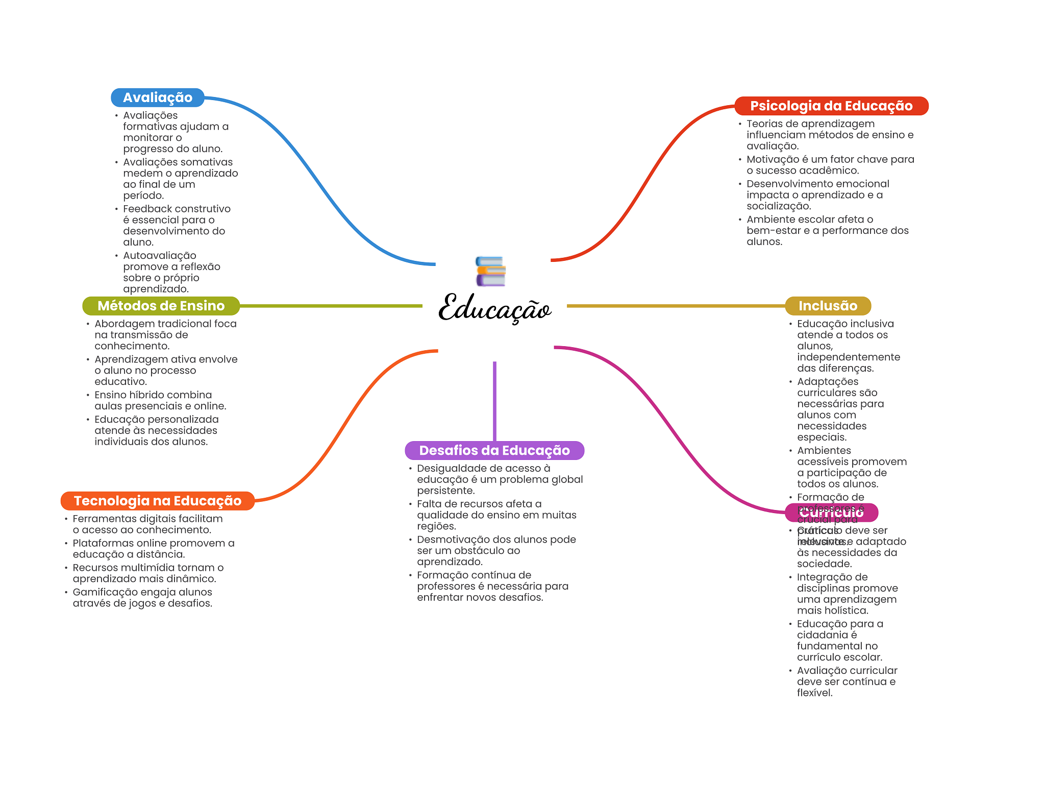 Avaliação Psicologia da Educação Avaliações formativas ajudam a Teorias de aprendizagem monitorar influenciam métodos de ensino e progresso do aluno. avaliação. Avaliações somativas Motivação é um fator chave para medem aprendizado sucesso acadêmico. ao final de um Desenvolvimento emocional período. impacta aprendizado e a Feedback construtivo socialização. é essencial para Ambiente escolar afeta desenvolvimento do bem-estar e a performance dos aluno. alunos. Autoavaliação promove a reflexão sobre próprio aprendizado. Métodos de Ensino Educação Inclusão Abordagem tradicional foca Educação inclusiva na transmissão de atende a todos OS conhecimento. alunos, Aprendizagem ativa envolve independentemente aluno no processo das diferenças. educativo. Adaptações Ensino híbrido combina curriculares são aulas presenciais e online. necessárias para Educação personalizada alunos com atende às necessidades necessidades individuais dos alunos. especiais. Desafios da Educação Ambientes acessíveis promovem Desigualdade de acesso à a participação de educação é um problema global todos alunos. persistente. Tecnologia na Educação Formação de Falta de recursos afeta a Ferramentas digitais facilitam qualidade do ensino em muitas O acesso ao conhecimento. regiões. deve ser Plataformas online promovem a Desmotivação dos alunos pode adaptado educação a distância. ser um obstáculo ao às necessidades da Recursos multimídia tornam O aprendizado. sociedade. aprendizado mais dinâmico. Formação contínua de Integração de Gamificação engaja alunos professores é necessária para disciplinas promove enfrentar novos desafios. através de jogos e desafios. uma aprendizagem mais holística. Educação para a cidadania é fundamental no escolar. Avaliação curricular deve ser contínua e flexível.