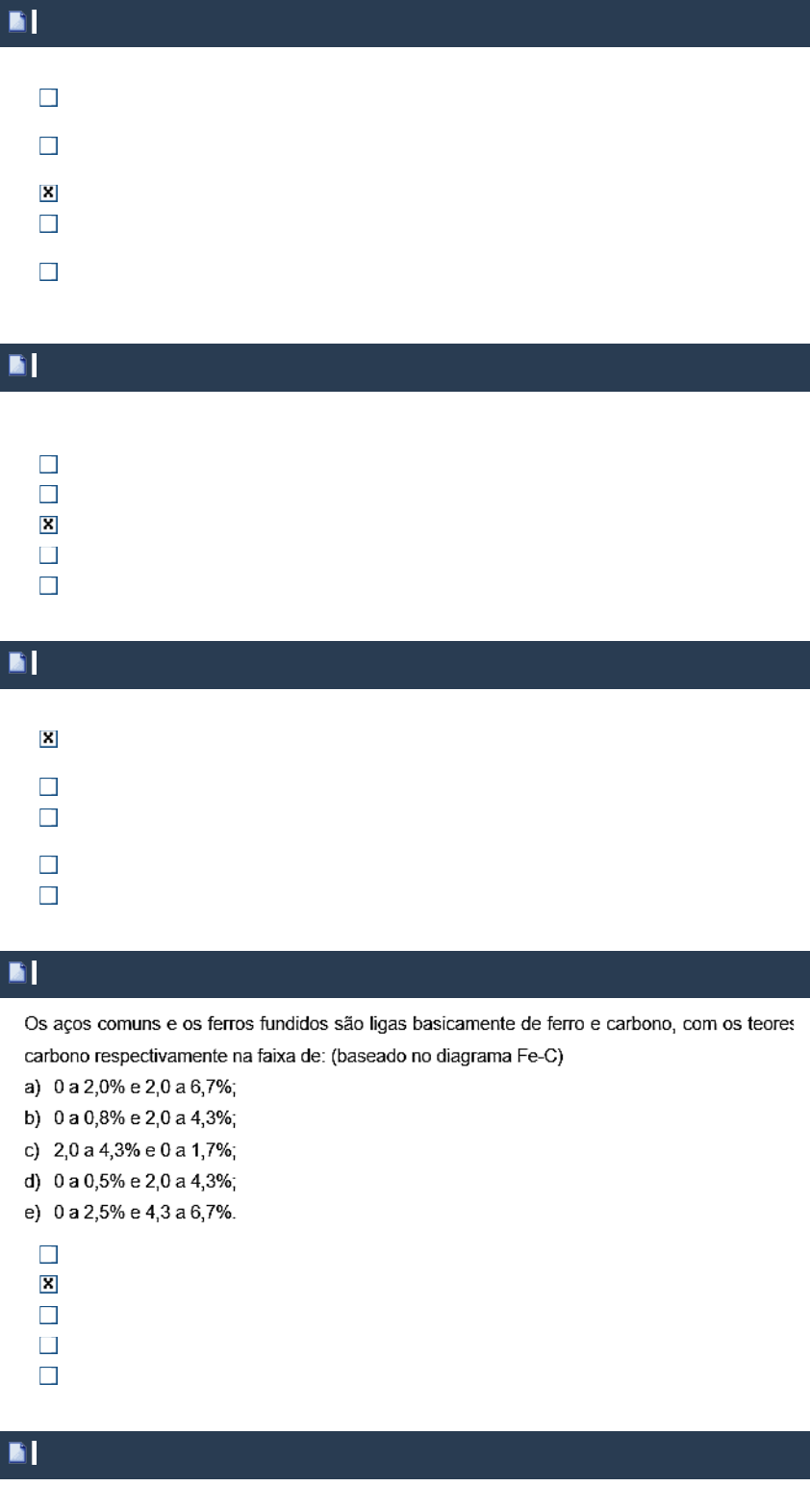 1a Questão Respondido em 04/11/2025 19:10 Ref.: 202217150431 Qual das alternativas abaixo, não é a verdadeira: O processo de soldagem gás combustível pode ser feito com ou sem adição de material. O processo de soldagem gás combustível é muito comum em chapas de menor espessura. O processo de soldagem a gás combustível utiliza gases inerte e ativos. O processo de soldagem a gás combustível, utiliza valvulas de proteção nas extremidades das mangueiras. o processo de soldagem a gás combustivel utiliza reguladores de pressão como um de seus equipamentos. 2a Questão Respondido em 04/11/2025 19:11 Ref.: 202217150436 No processo de oxi soldagem, utliza-se como um de seus gases, um gás combustível, das opções a seguir, qual delas não é um gás combustível utilizado no processo: Propano Metano Acetileno GLP Argônio 3a Questão Respondido em 04/11/2025 19:14 Ref.: 202217150905 O que é a zona termicamente afetada (ZTA) em uma junta soldada? É a área imediatamente adjacente à solda, que sofre alterações microestruturais devido ao aquecimento e resfriamento durante o processo de soldagem. É a região onde ocorre a solidificação da solda. É a região onde são adicionados os materiais de enchimento durante a soldagem. É a área onde é aplicada a corrente elétrica durante a soldagem. É a região onde ocorre a fusão dos metais de base. 4a Questão Respondido em 04/11/2025 19:18 Ref.: 202217154569 D A B C E 5a Questão Respondido em 04/11/2025 19:22 Ref.: 202217207995 A soldagem é um processo de união de materiais, geralmente metais, no qual se utiliza calor e/ou pressão para fundir as partes a serem unidas, permitindo que se solidifiquem e formem uma única peça quando esfriam. É um dos principais métodos de fabricação e é amplamente utilizado na indústria para criar estruturas e componentes duráveis. Sobre o processo de soldagem TIG, sigla para Tungsten Inert Gas, também é conhecido como GTAW (Gas Tungsten Arc Welding) indique as alternativas verdadeiras. I - No processo TIG, o eletrodo de tungstênio não é consumido durante a soldagem. Em vez disso, ele serve para criar e manter o arco elétrico II - Durante a soldagem TIG, um gás inerte, como argônio ou hélio, é usado para proteger a poça de fusão e o eletrodo da contaminação atmosférica. Esse gás cria um ambiente livre de oxigênio, impedindo a oxidação dos metais. III - O TIG é conhecido por sua capacidade de fornecer soldagens de alta qualidade, com controle preciso da temperatura e da quantidade de metal de adição, tornando-o adequado para soldar uma variedade de metais, incluindo aço inoxidável, alumínio, cobre e ligas de níquel. somente a afirmativa II está correta somente a afirmativa III está correta Todas as afirmativas estão corretas as afirmativas I e III estão corretas as afirmativas II e III estão corretas 6a Questão Respondido em 04/11/2025 19:24 Ref.: 202217155822 Durante um processo de soldagem a arco elétrico, a velocidade de soldagem rápida pode implicar: Em uma solda mais uniforme Em uma maior penetração Em uma fusão mais concentrada Em uma solda mais alta em uma penetração menor 7a Questão Respondido em 04/11/2025 19:25 Ref.: 202217179428 Processo de soldagem a arco elétrico com eletrodo(s) consumível(eis), no qual o arco elétrico e a poça de fusão são protegidos do ambiente pelos produtos resultantes da queima de um fluxo, que é adicionado por via independente à do eletrodo durante toda a soldagem. Esta definição é aplicada a qual processo de soldagem? b) Arame tubular. c) Arco submerso; a) Eletrodo revestido; d) MIG/MAG; e) TIG 8a Questão Respondido em 04/11/2025 19:32 Ref.: 202217186713 A respeito da inspeção de soldagem utilizando-se o ultrassom, marque a alternativa correta: O ultrassom permite medir a distância (profundiade) da trinca A emissão de ondas independe do meio de propagação O ultrassom é a única metodologia de inspeção que permite avaliar a qualidade de um cordão de solda O ultrassom não necessita do uso de um líquido entre o aparelho emissor de ondas e a peça O ultrassom é uma forma de inspeção que utiliza ondas eletromagnéticas 9a Questão Respondido em 04/11/2025 19:34 Ref.: 202217186642 Com relação a soldagem por resistência, marque a alternativa correta Na soldagem por resistência é necessário empregar uma força mecância para unir os metais a serem soldados e aplicar uma corrente elétrica para que ocorra o efeito joule e haja o aumento da temepratura do sistema, atingindo, assim, o ponto de fusão das peças a serem unidas. Na soldagem por resistência, os eletrodos devem apresentar baixo ponto de amolecimento Materiais poliméricos são os principais materiais soldados pela soldagem por resistência Na soldagem por resistência, não há a utilização de corrente elétrica para geração de calor Na soldagem por resistência é importante que o eletrodo não tennha grande capacidade de troca térmica 10a Questão Respondido em 04/11/2025 19:35 Ref.: 202217154579 Identifique os tipos de defeitos de soldagem apresentados Falta de Penetração, Mordedura, Falta de Fusão, Inclusão de Escória, Inclusão de Escória, Falta de Penetração, Mordedura, Falta de Fusão Mordedura, Inclusão de Escória, Falta de Penetração, Falta de Fusão Falta de Penetração, Inclusão de Escória, , Mordedura, Falta de Fusão Todas com Falta de Penetração image4.png image5.png image1.gif image2.gif image3.gif