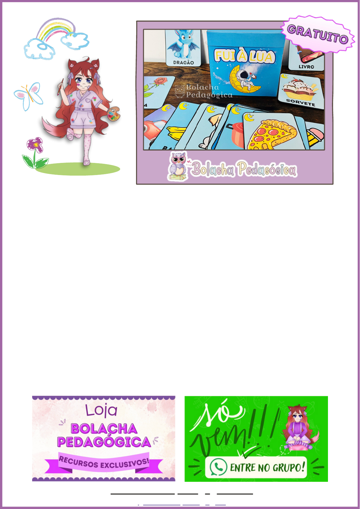 www.bolachapedagogica.com @bolacha_pedagogica Este arquivo é 100% GRATUITO e pode ser compartilhado à vontade. Pedimos que nos dê os créditos. É PROIBIDO A VENDA e qualquer alteração do arquivo. Clique na imagem para acessar Jogo Fui à Lua Como brincar de “Fui à Lua”: A primeira criança diz: “Fui à Lua e levei...” E completa com um objeto, por exemplo: “... uma escova de dentes.” A próxima criança repete a frase inteira e acrescenta um novo item: “Fui à Lua e levei uma escova de dentes e um travesseiro.” E assim por diante, cada criança repete toda a lista, em ordem, e adiciona um novo objeto ao final. Quem errar a sequência ou esquecer algum item, sai da rodada ou começa de novo, dependendo da regra combinada. O arquivo tem sugestões de palavras ja ilustradas, mas pode também deixar a criatividade da criança para escolher qual palavra ela quer!! Tem cards em branco para as crianças desenharem seus objetos que não tem no jogo e também uma página em branco para as crianças desenharem todos os objetos que “levaram”. http://www.bolachapedagogica.com/ https://bolachapedagogica.com/grupo-de-whatsapp/ https://lojabolachapedagogica.com/ http://www.bolachapedagogica.com/ https://www.instagram.com/bolacha_pedagogica/ TAMPA DA CAIXA FUNDO DA CAIXA LATERAL DA CAIXA DOBRE AS ABAS E COLE UMA LATERAL NA OUTRA FRENTE DA CAIXA DOBRE AS ABAS E COLE UMA LATERAL NA OUTRA FUI À LUA LATERAL DA CAIXA DOBRE AS ABAS E COLE UMA LATERAL NA OUTRA TRÁS DA CAIXA DOBRE AS ABAS E COLE UMA LATERAL NA OUTRA sorvete pizza dragãolivro www.bolachapedagogica.com @bolacha_pedagogica Jogo Fui à Lua http://www.bolachapedagogica.com/ https://www.instagram.com/bolacha_pedagogica/ copo maçã panelabota www.bolachapedagogica.com @bolacha_pedagogica Jogo Fui à Lua http://www.bolachapedagogica.com/ https://www.instagram.com/bolacha_pedagogica/ celular flor espelhochinelo www.bolachapedagogica.com @bolacha_pedagogica Jogo Fui à Lua http://www.bolachapedagogica.com/ https://www.instagram.com/bolacha_pedagogica/ cachorro gato estrelaárvore www.bolachapedagogica.com @bolacha_pedagogica Jogo Fui à Lua http://www.bolachapedagogica.com/ https://www.instagram.com/bolacha_pedagogica/ ovo banana pentebrócolis www.bolachapedagogica.com @bolacha_pedagogica Jogo Fui à Lua http://www.bolachapedagogica.com/ https://www.instagram.com/bolacha_pedagogica/ galinha carro rosalápis www.bolachapedagogica.com @bolacha_pedagogica Jogo Fui à Lua http://www.bolachapedagogica.com/ https://www.instagram.com/bolacha_pedagogica/ balde chapéu bolasaia www.bolachapedagogica.com @bolacha_pedagogica Jogo Fui à Lua http://www.bolachapedagogica.com/ https://www.instagram.com/bolacha_pedagogica/ boneca rato dadopicolé www.bolachapedagogica.com @bolacha_pedagogica Jogo Fui à Lua http://www.bolachapedagogica.com/ https://www.instagram.com/bolacha_pedagogica/ vaca garrafa tesouraabacaxi www.bolachapedagogica.com @bolacha_pedagogica Jogo Fui à Lua http://www.bolachapedagogica.com/ https://www.instagram.com/bolacha_pedagogica/ colher barata rodacaju www.bolachapedagogica.com @bolacha_pedagogica Jogo Fui à Lua http://www.bolachapedagogica.com/ https://www.instagram.com/bolacha_pedagogica/ elefante borboleta melanciaplanta www.bolachapedagogica.com @bolacha_pedagogica Jogo Fui à Lua http://www.bolachapedagogica.com/ https://www.instagram.com/bolacha_pedagogica/ escova batom cadeiraboné www.bolachapedagogica.com @bolacha_pedagogica Jogo Fui à Lua http://www.bolachapedagogica.com/ https://www.instagram.com/bolacha_pedagogica/ janela garfo palhaçomorango www.bolachapedagogica.com @bolacha_pedagogica Jogo Fui à Lua http://www.bolachapedagogica.com/ https://www.instagram.com/bolacha_pedagogica/ pipa zebra mochilaescada www.bolachapedagogica.com @bolacha_pedagogica Jogo Fui à Lua http://www.bolachapedagogica.com/ https://www.instagram.com/bolacha_pedagogica/ urso leão onçapeixe www.bolachapedagogica.com @bolacha_pedagogica Jogo Fui à Lua http://www.bolachapedagogica.com/ https://www.instagram.com/bolacha_pedagogica/ dinossauro gravata dinheirofoguete www.bolachapedagogica.com @bolacha_pedagogica Jogo Fui à Lua http://www.bolachapedagogica.com/ https://www.instagram.com/bolacha_pedagogica/ relógio barco uvatelevisão www.bolachapedagogica.com @bolacha_pedagogica Jogo Fui à Lua http://www.bolachapedagogica.com/ https://www.instagram.com/bolacha_pedagogica/ nuvem hambúrguer patinsrádio www.bolachapedagogica.com @bolacha_pedagogica Jogo Fui à Lua http://www.bolachapedagogica.com/ https://www.instagram.com/bolacha_pedagogica/ peru porco tomatecenoura www.bolachapedagogica.com @bolacha_pedagogica Jogo Fui à Lua http://www.bolachapedagogica.com/ https://www.instagram.com/bolacha_pedagogica/ microfone papagaio meiascalça www.bolachapedagogica.com @bolacha_pedagogica Jogo Fui à Lua http://www.bolachapedagogica.com/ https://www.instagram.com/bolacha_pedagogica/ www.bolachapedagogica.com @bolacha_pedagogica Jogo Fui à Lua http://www.bolachapedagogica.com/ https://www.instagram.com/bolacha_pedagogica/ fui à lua e levei...fui à lua e levei... www.bolachapedagogica.com @bolacha_pedagogica Jogo Fui à Lua http://www.bolachapedagogica.com/ https://www.instagram.com/bolacha_pedagogica/ www.bolachapedagogica.com @bolacha_pedagogica Jogo Fui à Lua http://www.bolachapedagogica.com/ https://www.instagram.com/bolacha_pedagogica/ www.bolachapedagogica.com @bolacha_pedagogica Jogo Fui à Lua http://www.bolachapedagogica.com/ https://www.instagram.com/bolacha_pedagogica/ www.bolachapedagogica.com @bolacha_pedagogica Jogo Fui à Lua http://www.bolachapedagogica.com/ https://www.instagram.com/bolacha_pedagogica/ www.bolachapedagogica.com @bolacha_pedagogica Jogo Fui à Lua http://www.bolachapedagogica.com/ https://www.instagram.com/bolacha_pedagogica/ www.bolachapedagogica.com @bolacha_pedagogica Jogo Fui à Lua http://www.bolachapedagogica.com/ https://www.instagram.com/bolacha_pedagogica/ www.bolachapedagogica.com @bolach
