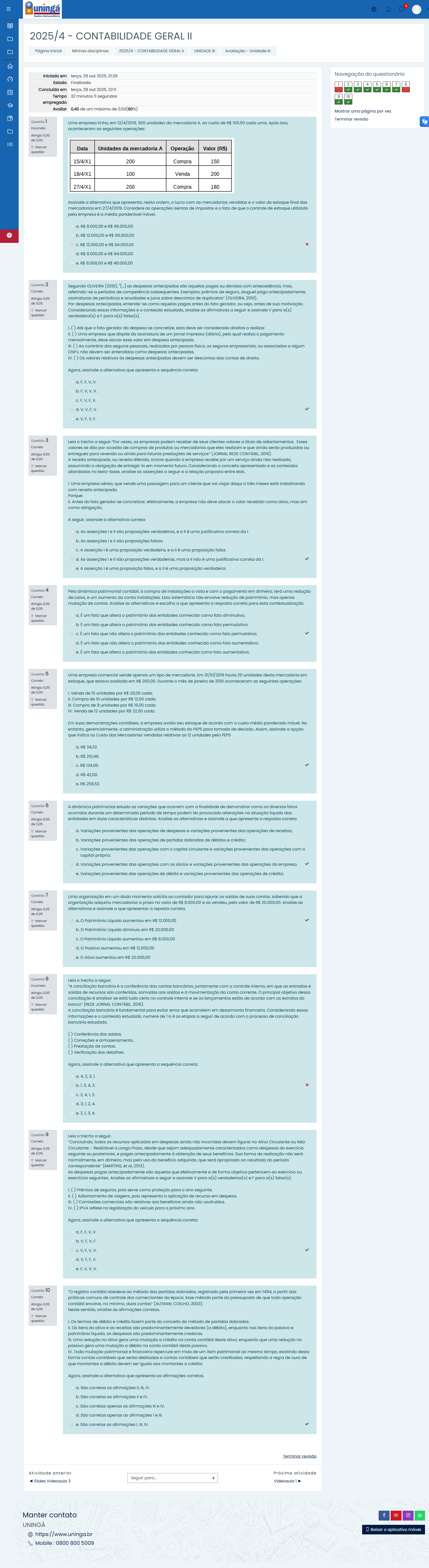 = 2025/4 CONTABILIDADE GERAL II Minhas disciplinas 2025/4 Avaliação A 21:39 questionário Estado terça 22:11 Tempo minutos segundos 9 empregado 0,40 revisão 300 mercadorio custo 00,00 seguintes operações Data Unidades mercadoria Operação Valor (R$) 15/4/X1 200 Compra 150 18/4/X1 100 Venda 200 27/4/X1 200 Compra 180 ven dos merc Considere impostos que control de estoq b 8.000,00 8.000,00 48.000,00 Segundo as despesas quelas quentes Exemplos ass anuidade VEIRA, 2010). entende pagas Co teúdo ass para falsa(s). Até que o fato realizar dispõe presso pelo real nento deve valor dos ealizados pessoa seguros en presor algum CNPJ spsed IV. alores desp dever ser das ontos reito que seq Correto produtos que que ou ções CONTABIL 2016). receita emp recebe serviço ealizado, nindo mento no exto base, segui empres ende um clie que vai daqui neses está Antes não deve valor recebido como ativo asserções b. asserções proposições asserção d. proposições asserção uma proposição proposição instalações vista ção Esto não patrin mos contas que ento sta contextualização fato que altero patri das conh fato diminutivo b. que permu um fato que não altera das hecido com perm d. das fato que das tipo Em 20 dades em R$ 200,00 dej janeiro de acon as 20.00 unidades 12,00 unidades 16,00 IV. del Em No método PEPS para Assim opção que Custo pelo PEPS estudo ções de de demonstrar como fatos mpo pode pro em a que das de despesa ariações das operações de b das de radas com tes empresa das débito ovenie ntes das em um nento saldos me 000,00 as pelo 20.00 nale que presentar quido 20.000,00 8.000,00 20.000,00 das con inte com controle em no estão de (REDE JORNAL para que acarreten em onio Considero ando essas udado de com op ação Correções que trecho todos ursos aplicados em despesas ainda não figurar no Ativo desde sejam como seguinte seu benefici realização dinheiro irido, que será (MARTINS 2013). As pagas amen aquelas para n(s) n(s) seguros, pois serve como proteção para ano seguinte despesa fruidos IV. IPVA reflete para Agora que seq 10 método em das do press non 2003). termos de débito crédito parte método ativo débito) enquanto do são que um passivo IV. item debitadas red uro de que ontes débito que etas b. d. Terminar anterior Proxima atividade Manter contato @ https:/ uninga.br Mobile 0800 800 5009