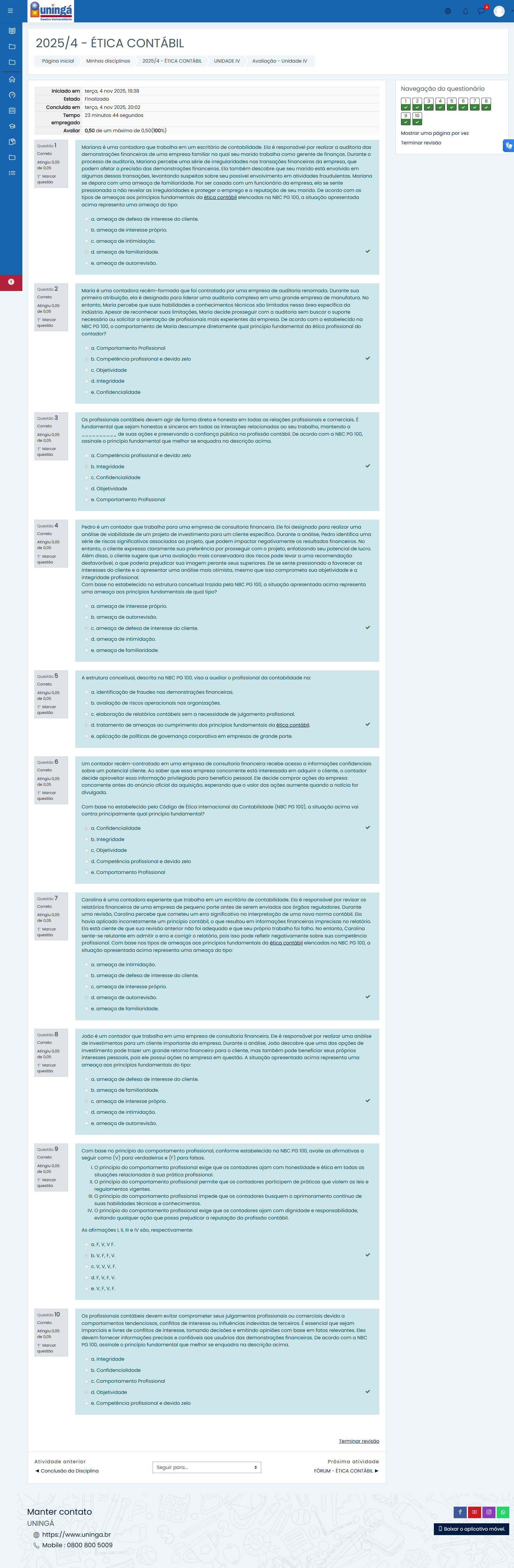 III 2025/4 ÉTICA CONTÁBIL Página inicial Minhas disciplinas 2025/4 ÉTICA Avaliação em terça, 19:38 Navegação do questionário Estado Finalizada Concluído em terça, 20:02 Tempo minutos segundos empregado Avaliar 0,50 de máximo 0,50(100%) Mostrar uma vez revisão Mariana uma que trabalho um de Ela responsável por realizar auditoria das Correto demonstr financeiras de uma familiar na qual seu ma como gerente de inanças. Durante o Atingiu 0,05 processo Mariana percebe uma série idades nas transações empresa, que de podem afetar precisão das demonstrações Ela também descobre que marido está envolvido em algumas dessas levantando suspeitas sobre seu possivel atividades Mariana questão se depara com uma Por ser casada um da ela sente pressionada não irregularidades roteger emprego reputação de seu marido De acordo com os tipos de ameaças aos rincipios fundamentais da ética NBC PG situação apresentada ma rep resento ameaça do de de do cliente b. ameaça interesse ameaça ntimidação d. familiaridade autorrevisão Maria formada que por uma empresa de auditoria Durante sua Correto primeiro buição designada para uma auditori plexa ande presa manu No entanto, Maria que suas dades técnicos imitados da Apesa reconhecer suas Maria decide prosseguir com auditoria sem suporte ou de profissionais mais da acordo como stabelecido questão NBC PG com ento de descumpre tamente qual principio nental da profissional do contador? Comportamento Profissional Competência profissional devido Objetividade Integridade Confiden Os profissionais contábeis devem de forma direta honesta em todas as relações profissionais comerciais fundamental que sejam honestos sinceros em todas relacionadas trabalho, mantendo ===== suas ações De acordo com NBC PG 100, assinale principio fundamental que melhor descrição questão profissional devido zelo b Objetividade Comportamento um contador que trabalha para uma empresa de cons Ele designado para realizar uma analise de de um projeto investimento cliente Durante análise, Pedro identifica uma série de riscos associados projeto, que podem impactar negativamente os resu financeiros. No entanto cliente pressa claramente sua por prosseguir com projeto, enfatizando seu potencial de lucro Além disso, client sugere que uma avaliação mais riscos pode levar uma recor nendação poderia perante seus Ele sente avorece interesses cliente mais que isso com sua integridade Com base estabelecido pela NBC PG 100, situação acima representa uma ameaça principios de qual tipo? ameaça interesse ameaça ameaça de defesa de do cliente d. ameaça ameaça familiaridade A estrutura descrita NBC PG visa auxiliar profissional da contabilidade a. ficação de nas b. avaliação de iscos nas organizações questão elaboração de relatórios necessidade de julgamento d. tratamento de ameaças cumprimento dos principios fundamentais ética aplicação de politicas de governança corporativa em empresas de grande porte Um contador contratado em uma empresa de consultoria financeira recebe acesso informações onfidenciais sobre um potencial cliente saber que essa cliente, contador decide aproveitar essa informação privilegiada para beneficio pessoal. Ele decide comprar ações empresa concorrente antes do oficial da aquisição, esperando que valor ações quando noticia for divulgada questão Com base no estal pelo Código de Etica ontabilidade (NBC PG vai tra palmente qual Objetividade Competência profissional devido zelo Comportamento Profissional experiente que trabalho em um de Ela responsável por os Correto preso pequ porte aos órgão rante uma revisão Carolina percebe que cometeu um inter pretação uma nova Ela havia aplicado que precisas Ela ciente de que não que seu No Carolina sente relutante em admitir erro corrigir relatório, pois isso pode refletir sobre com profissional. Com base nos tipos de ameaças aos princi pios da elencadas na NBC PG 100 a situação acima ento uma ameaça ameaça intimidação b. ameaça de interesse do ameaça de d. ameaça ameaça familiaridade um contador que trabalha uma de consultorio financeira Ele responsável por realizar uma de para cliente importar mpresa Durante descobre uma das opções de investimento pode trazer grande retorno financeiro para cliente também pode beneficiar interesses pessoais, pois possu ações em questão acima representa aos ipios do tipo: questão a. de defesa de do cliente ameaça ameaça de próprio ameaça intimidação meaça no do compo profissional conforme estabelecido NBC PG avalie as afirmativas Correto seguir como (v) para verdadeiras para Atingiu 0,05 principio do amento pro issiona exige que os contadores ajam com dade ético em todas a situações relacionadas prático comporto to profissional permite que contadores participem de práticas que violem as eis vigentes. profissional que os busquem ento continuo de suas principio ortame exige que os ajam com responsabilidade evitando qualquer ação que posso prejudica reputação da profissão As afirmações são, Os profissionais contábeis devem evitar seus julgamentos ou comerciais comportamentos conflitos interesse influências indevidas essencial sejam mparciais livres de conflitos de tomando decisões emitindo opiniões com base fatos Eles devem informações precisas aos das demonst financeira De acordo NBC PG assinale fundamental que melhor enquadra na descrição a. Confidencialidade Comportar Profissional Objetividade profissional devido zelo Atividade anterior atividade Conclusão Disciplina Seguir FORUM ÉTICA Manter contato UNINGA Baixar Mobile 0800 800 5009
