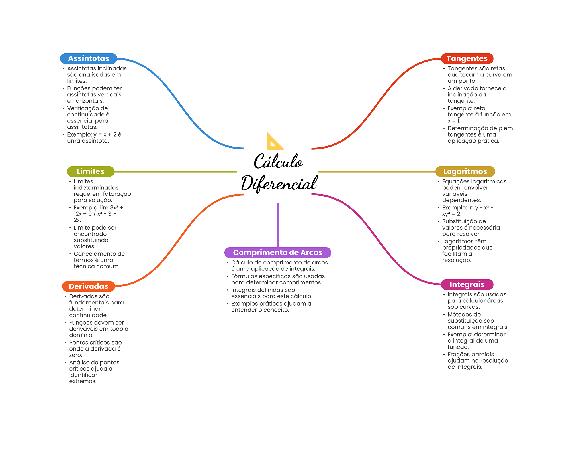 Assíntotas Tangentes Assíntotas inclinadas Tangentes são retas são analisadas em que tocam a curva em limites. um ponto. Funções podem ter A derivada fornece a assíntotas verticais inclinação da e horizontais. tangente. Verificação de Exemplo: reta continuidade é tangente à função em essencial para assíntotas. Determinação de em Exemplo: y = X + 2 é tangentes é uma uma assíntota. aplicação prática. Cálculo Limites Logaritmos Limites indeterminados Diferencial Equações logarítmicas podem envolver requerem fatoração variáveis para solução. dependentes. Exemplo: lim + Exemplo: In y xy² = 2. 2x. Substituição de Limite pode ser valores é necessária encontrado para resolver. substituindo Logaritmos têm valores. propriedades que Cancelamento de Comprimento de Arcos facilitam a termos é uma Cálculo do comprimento de arcos resolução. técnica comum. é uma aplicação de integrais. Fórmulas específicas são usadas Derivadas para determinar comprimentos. Integrais Integrais definidas são Derivadas são essenciais para este cálculo. Integrais são usadas fundamentais para Exemplos práticos ajudam a para calcular áreas determinar sob curvas. entender conceito. continuidade. Métodos de Funções devem ser substituição são deriváveis em todo comuns em integrais. domínio. Exemplo: determinar Pontos críticos são a integral de uma onde a derivada é função. zero. Frações parciais Análise de pontos ajudam na resolução críticos ajuda a de integrais. identificar extremos.