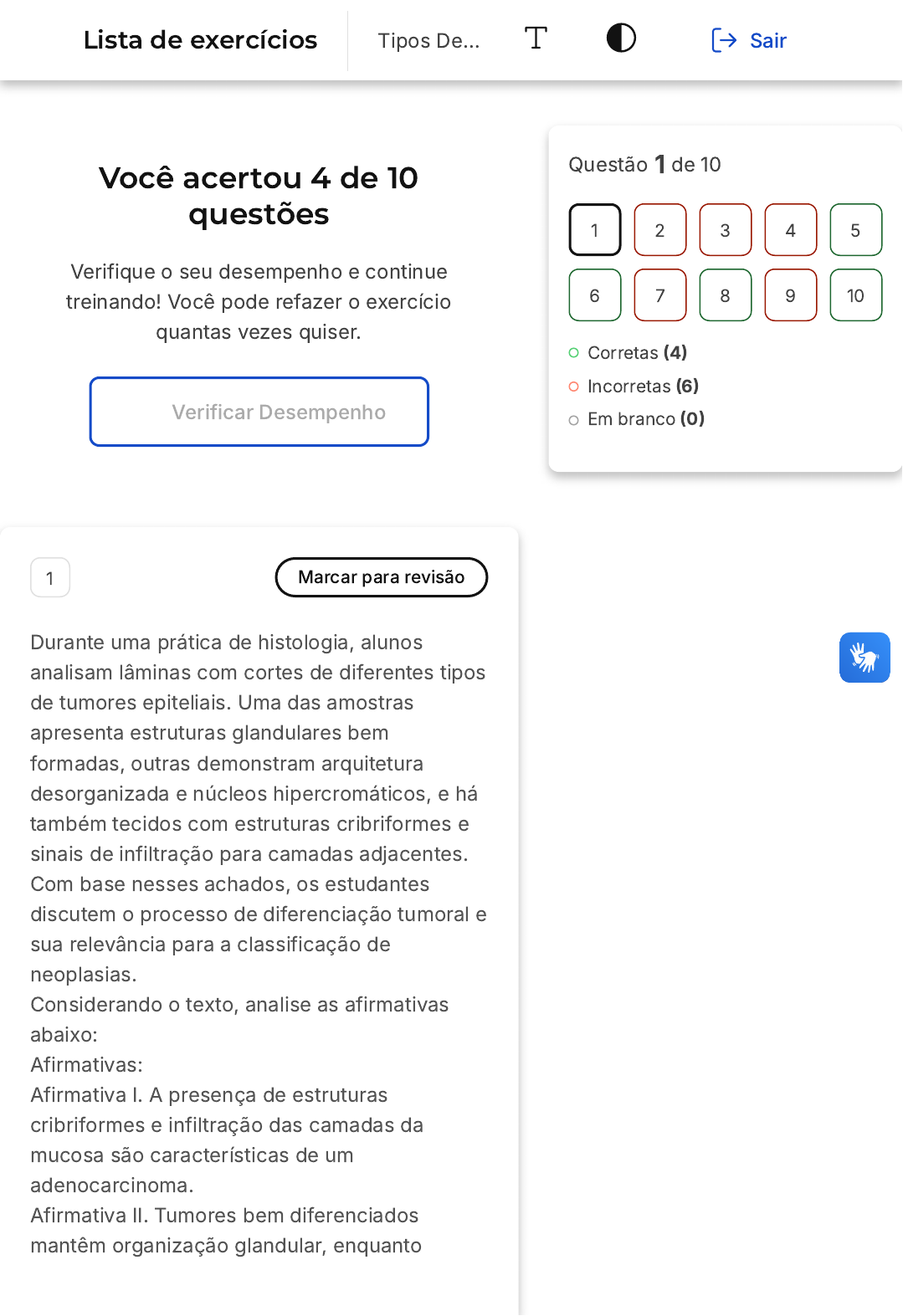 Você acertou 4 de 10 questões Verifique o seu desempenho e continue treinando! Você pode refazer o exercício quantas vezes quiser. Verificar Desempenho 1 Marcar para revisão Durante uma prática de histologia, alunos analisam lâminas com cortes de diferentes tipos de tumores epiteliais. Uma das amostras apresenta estruturas glandulares bem formadas, outras demonstram arquitetura desorganizada e núcleos hipercromáticos, e há também tecidos com estruturas cribriformes e sinais de infiltração para camadas adjacentes. Com base nesses achados, os estudantes discutem o processo de diferenciação tumoral e sua relevância para a classificação de neoplasias. Considerando o texto, analise as afirmativas abaixo: Afirmativas: Afirmativa I. A presença de estruturas cribriformes e infiltração das camadas da mucosa são características de um adenocarcinoma. Afirmativa II. Tumores bem diferenciados mantêm organização glandular, enquanto Questão 1 de 10 Corretas �4� Incorretas �6� Em branco �0� 1 2 3 4 5 6 7 8 9 10 Lista de exercícios Tipos De… Sair A B C D E tumores indiferenciados mostram células desorganizadas e sem formação de glândulas. Afirmativa III. A arquitetura organizada é indicativo exclusivo de tumores benignos, já que malignos são sempre indiferenciados. Marque a alternativa que apresenta a(s) afirmativa(s) correta(s)? I e II II e III I e III I I, II e III Resposta incorreta Opa! A alternativa correta é a letra A. Confira o gabarito comentado! Gabarito Comentado A afirmativa I está correta, pois os adenocarcinomas, especialmente os diferenciados, formam glândulas com luz e podem ter padrão cribriforme, além de invadir todas as camadas da mucosa. A afirmativa II também está correta: tumores diferenciados tendem a manter alguma organização, enquanto os indiferenciados perdem completamente a estrutura glandular. A afirmativa III está incorreta, pois tumores malignos podem sim ser bem A B C D E diferenciados, mantendo parte da arquitetura tecidual normal. 2 Marcar para revisão Neoplasias são tumores formados pelo aumento anormal do número de células. Existem uma parcela desses tumores considerados altamente agressivos formados por células indiferenciadas, pequenas e com alta relação núcleo-citoplasma, conhecidas como: Neoplasias de pequenas células redondas. Com relação a esse contexto, analise as alternativas: I. Linfomas e leucemias, geralmente do tipo linfoblástico, são mais comuns em idade pediátrica. II. Melanoma de pequenas células são mais comuns em idade adulta; III. Durante a análise histopatológica, o diagnóstico diferencial é muito fácil. É correto o que se afirma: I, apenas. I e III III e II I e II. I, II e III Resposta incorreta Opa! A alternativa correta é a letra D. Confira o gabarito comentado! Gabarito Comentado A alternativa correta é a letra D, que afirma que os linfomas e leucemias, geralmente do tipo linfoblástico, são mais comuns em idade pediátrica (afirmação I) e que o melanoma de pequenas células é mais comum em idade adulta (afirmação II�. A afirmação III é incorreta, pois durante a análise histopatológica, o diagnóstico diferencial é muito difícil. Isso ocorre porque as células são altamente indiferenciadas e apresentam alta semelhança morfológica quando as amostras são coradas pela coloração convencional �Hematoxilina-eosina). Portanto, é necessário realizar testes imunohistoquímicos para chegar a uma conclusão diagnóstica. Este padrão de células indiferenciadas pode ser observado na figura a seguir. 3 Marcar para revisão A inflamação é um mecanismo ativado como primeira resposta do organismo frente a um agente agressor, mas pode ser considerada, em última análise, um recurso necessário para: A B C D E Aumentar a vasodilatação na área lesionada. Aumentar o fluxo sanguíneo na área lesionada. Aumentar a vasoconstrição na área lesionada. A estimulação de células de defesa necessárias para impedir a entrada de microorganismos na área lesionada. Preparar a área lesionada para o reparo tecidual. Resposta incorreta Opa! A alternativa correta é a letra E. Confira o gabarito comentado! Gabarito Comentado A inflamação é uma resposta do organismo a um agente agressor e tem como objetivo final preparar a área lesionada para o reparo tecidual. Isso é feito através da produção de mediadores inflamatórios pelos leucócitos e células residentes do tecido. Esses mediadores, além de desencadear o processo inflamatório, estimulam a migração e proliferação de fibroblastos e miofibroblastos, além da deposição de colágeno e outros tecidos de matriz. Isso resulta na substituição do tecido normal pela fibrose, que é uma etapa crucial para o reparo tecidual. Portanto, a alternativa correta é a E� A B C D E "Preparar a área lesionada para o reparo tecidual". 4 Marcar para revisão Com relação às características observadas na resposta inflamatória crônica, analise as alternativas a seguir e marque a opção correta. A inflamação crônica somente terá seu início após a resposta inflamatória aguda, em que são verificados todos os sinais e sintomas clássicos da inflamação aguda. A resposta inflamatória crônica é caracterizada por áreas de destruição, presença de células inflamatórias e reparação tecidual. Na resposta inflamatória crônica observa-se predomínio de polimorfonucleares e fibroblastos proliferando-se na área da lesão. A inflamação crônica inespecífica é observada quando há a presença de um corpo estranho, como o talco. A resposta inflamatória crônica inespecífica tem o predomínio de células epidelioides circundadas por linfócitos e plasmócitos. Resposta incorreta Opa! A alternativa correta é a letra B. Confira o gabarito comentado! Gabarito Comentado A alternativa correta é a B. A resposta inflamatória crônica é caracterizada por áreas de destruição, presença de células