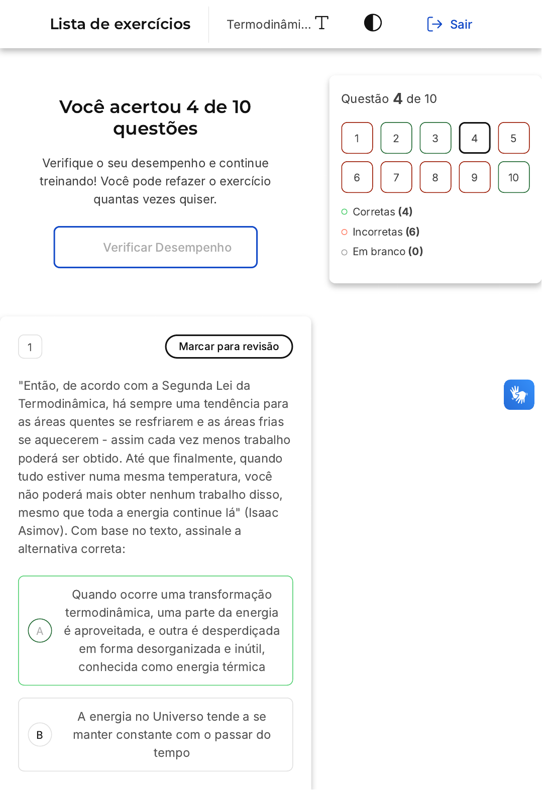 Você acertou 4 de 10 questões Verifique o seu desempenho e continue treinando! Você pode refazer o exercício quantas vezes quiser. Verificar Desempenho A B 1 Marcar para revisão "Então, de acordo com a Segunda Lei da Termodinâmica, há sempre uma tendência para as áreas quentes se resfriarem e as áreas frias se aquecerem - assim cada vez menos trabalho poderá ser obtido. Até que finalmente, quando tudo estiver numa mesma temperatura, você não poderá mais obter nenhum trabalho disso, mesmo que toda a energia continue lá" �Isaac Asimov). Com base no texto, assinale a alternativa correta: Quando ocorre uma transformação termodinâmica, uma parte da energia é aproveitada, e outra é desperdiçada em forma desorganizada e inútil, conhecida como energia térmica A energia no Universo tende a se manter constante com o passar do tempo Questão 4 de 10 Corretas �4� Incorretas �6� Em branco �0� 1 2 3 4 5 6 7 8 9 10 Lista de exercícios Termodinâmi… Sair C D E No Universo, a energia é criada na forma de calor, que passa sempre de um corpo mais quente para um corpo mais frio Áreas frias no Universo tendem a permanecer frias até atingirem o equilíbrio térmico A entropia é o princípio físico que explica o fenômeno de transferência de calor dos corpos quentes para os corpos frios, estando relacionada à Terceira Lei da Termodinâmica Resposta incorreta Opa! A alternativa correta é a letra A. Confira o gabarito comentado! Gabarito Comentado A Segunda Lei da Termodinâmica, citada no enunciado, afirma que, em qualquer processo natural, a entropia de um sistema isolado sempre aumenta. Isso significa que, em uma transformação termodinâmica, parte da energia é aproveitada para realizar trabalho, enquanto outra parte é dispersada de forma desorganizada e inútil, conhecida como energia térmica. Essa energia térmica é a energia que não pode ser convertida em trabalho, representando a perda de eficiência do sistema. Portanto, a alternativa A está correta, pois reflete corretamente essa ideia. A B C D E 2 Marcar para revisão Analise as seguintes afirmativas: I. Em ambientes frios, ocorre uma vasoconstrição periférica cutânea, o que diminui o fluxo sanguíneo na pele e reduz a perda de calor para o meio externo. Porque II. Centros termorreguladores no hipotálamo estimulam o sistema nervoso simpático, responsável pela vasoconstrição. Assinale a alternativa correta: As duas afirmativas estão corretas, porém a segunda não é uma justificativa correta da primeira As duas afirmativas estão corretas, e a segunda é uma justificativa correta da primeira As duas afirmativas estão erradas Apenas a primeira afirmativa está errada Apenas a segunda afirmativa está errada Resposta correta Parabéns, você selecionou a alternativa correta. Confira o gabarito comentado! Gabarito Comentado A resposta correta é: As duas afirmativas estão corretas, e a segunda é uma justificativa correta da primeira. A vasoconstrição periférica cutânea é uma resposta fisiológica que ocorre em ambientes frios, e é responsável por reduzir a perda de calor para o meio externo. O hipotálamo é uma região do cérebro que controla a temperatura corporal, e é responsável por estimular o sistema nervoso simpático, que é responsável pela vasoconstrição. Portanto, as duas afirmativas estão corretas, e a segunda é uma justificativa correta da primeira. 3 Marcar para revisão A densidade, por sua vez, é a relação entre a massa e o volume de um objeto, e é medida em unidades como quilogramas por metro cúbico (kg/m³) ou gramas por centímetro cúbico (g/cm³). O que acontece com a densidade de um objeto se sua massa permanecer constante e seu volume aumentar? A B C D E A densidade aumenta A densidade diminui A densidade permanece constante A densidade é zero A densidade é infinita Resposta correta Parabéns, você selecionou a alternativa correta. Confira o gabarito comentado! Gabarito Comentado A relação entre a massa e o volume de um corpo nos dá a densidade (d), que pode ser calculada com a fórmula a seguir: d= m / V. A densidade é definida como a relação entre a massa e o volume de um objeto, portanto, se o volume aumentar enquanto a massa permanece constante, a densidade diminuirá. 4 Marcar para revisão A energia térmica é a energia associada ao movimento aleatório das partículas que compõem um material ou sistema. A transferência de energia térmica pode ocorrer de diferentes formas. Qual é o processo de A B C D E transferência de energia térmica que ocorre através do contato direto entre dois corpos com temperaturas diferentes? Convecção Radiação Condução Evaporação Condensação Resposta correta Parabéns, você selecionou a alternativa correta. Confira o gabarito comentado! Gabarito Comentado Na condução, a energia térmica passa de partícula a partícula do corpo, por contato. A agitação das partículas acaba afetando as partículas vizinhas, o que provoca uma transmissão de calor pelo corpo. A condutibilidade térmica é a capacidade de um material em conduzir a energia térmica e depende de cada material 5 Marcar para revisão A B C D E Podemos mensurar o gasto energético do corpo através da medida do calor produzido por ele, o que chamamos de calorimetria. Existem dois tipos de calorimetria: a direta e a indireta. Na calorimetria indireta, usamos o seguinte princípio: Estima-se a taxa de produção de calor por meio do consumo de oxigênio, uma vez que existe uma relação direta entre o consumo desse gás com a quebra de moléculas dos alimentos Estima-se a taxa de produção de calor por meio do consumo de gás carbônico, uma vez que existe uma relação direta entre o consumo desse gás com a quebra de moléculas dos alimentos Estima-se a taxa de produção de calor por meio da liberação de gás carbônico, uma vez que existe uma relação direta entre o consumo desse gás com a quebra de moléculas do